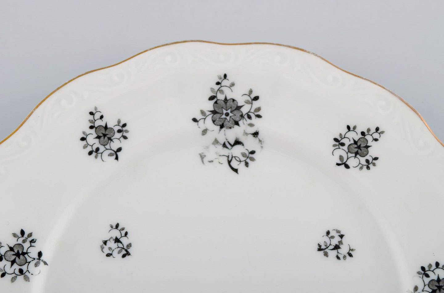 KPM, Copenhagen Porcelain Painting. Eight Rubens plates in porcelain with floral motifs, gold edge and scrolls in relief. 1940's.
