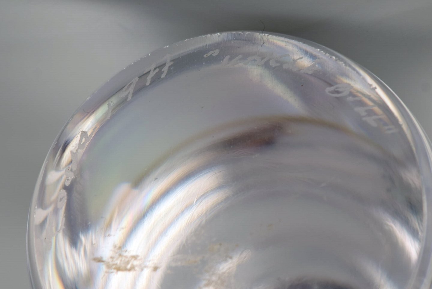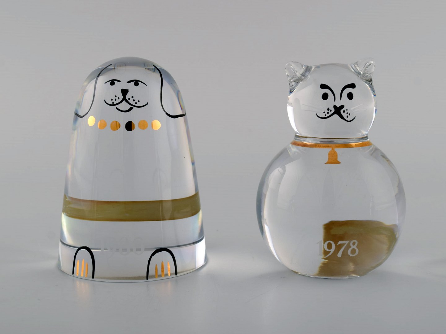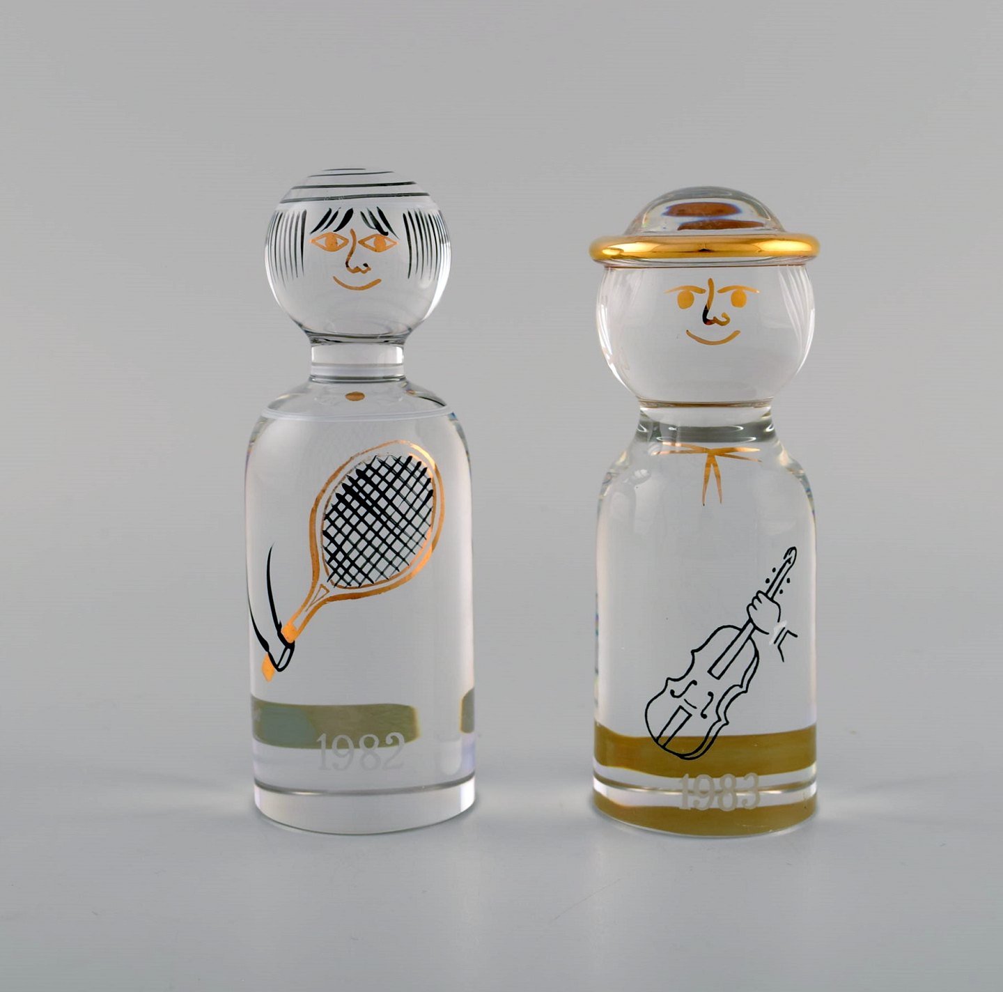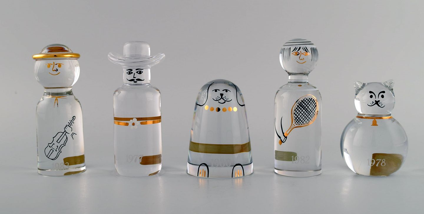 Göran Wärff (f.1933) for Kosta Boda. Fem figurer i kunstglas fra serien 'familien'. 1970/80'erne. Graveret og håndmalet dekoration. Mærket med årstal. Største måler: 13,5 x 6 cm. I flot stand.