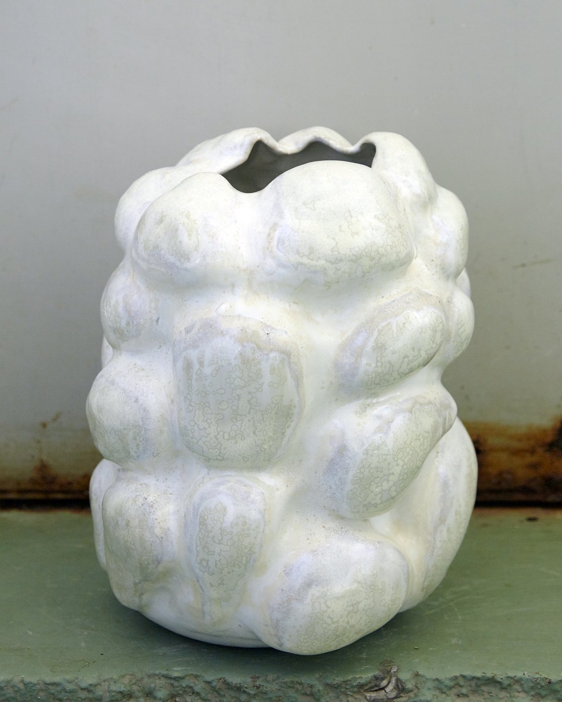 Christina Muff, Danish contemporary ceramist (b. 1971).Medium sized white stoneware sculpture vase with porcelain slip. The vase is hand modeled and has been glazed with white glaze as a base, the bulges are decorated with soft green crystal glaze and sand from beaches in Denmark. Part of the Salt series by Christina Muff. One of a kind.