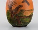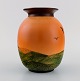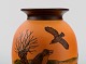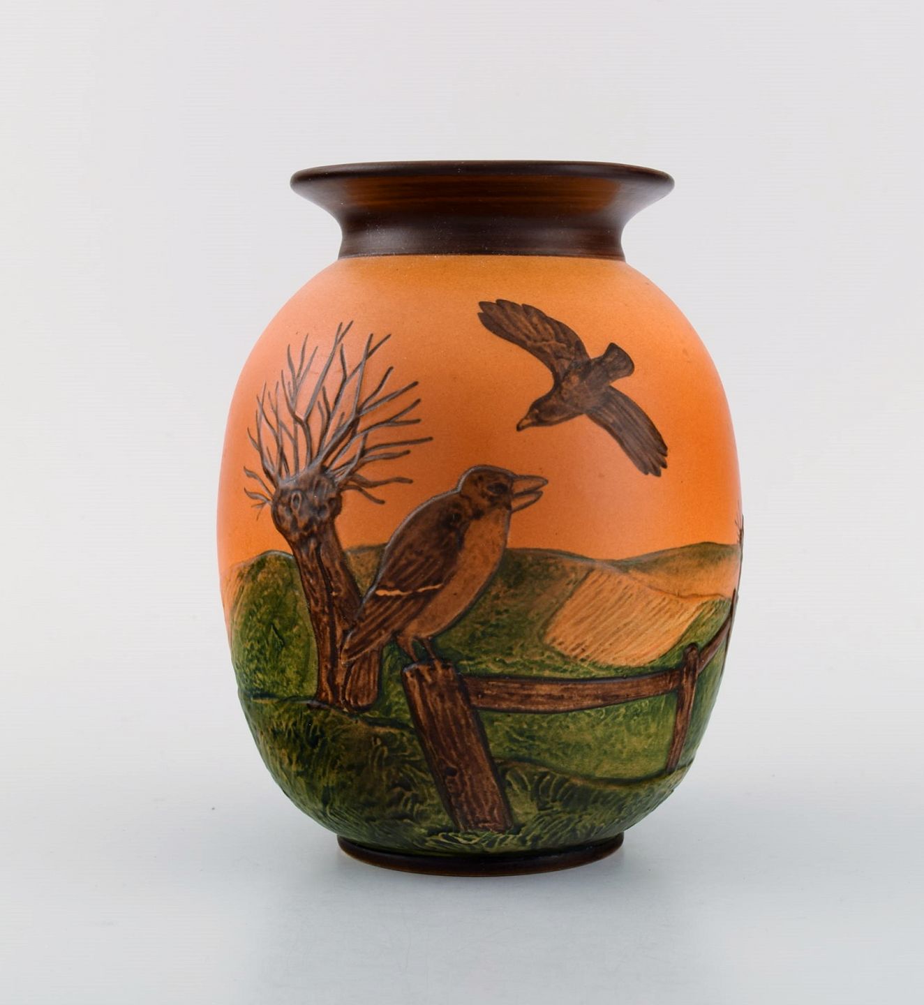 Ipsens enke, Danmark. Vase i håndmalet glaseret keramik. Landskab med fugle. Modelnummer 477. Ca. 1920. Måler: 18 x 14 cm. I flot stand. Stemplet.