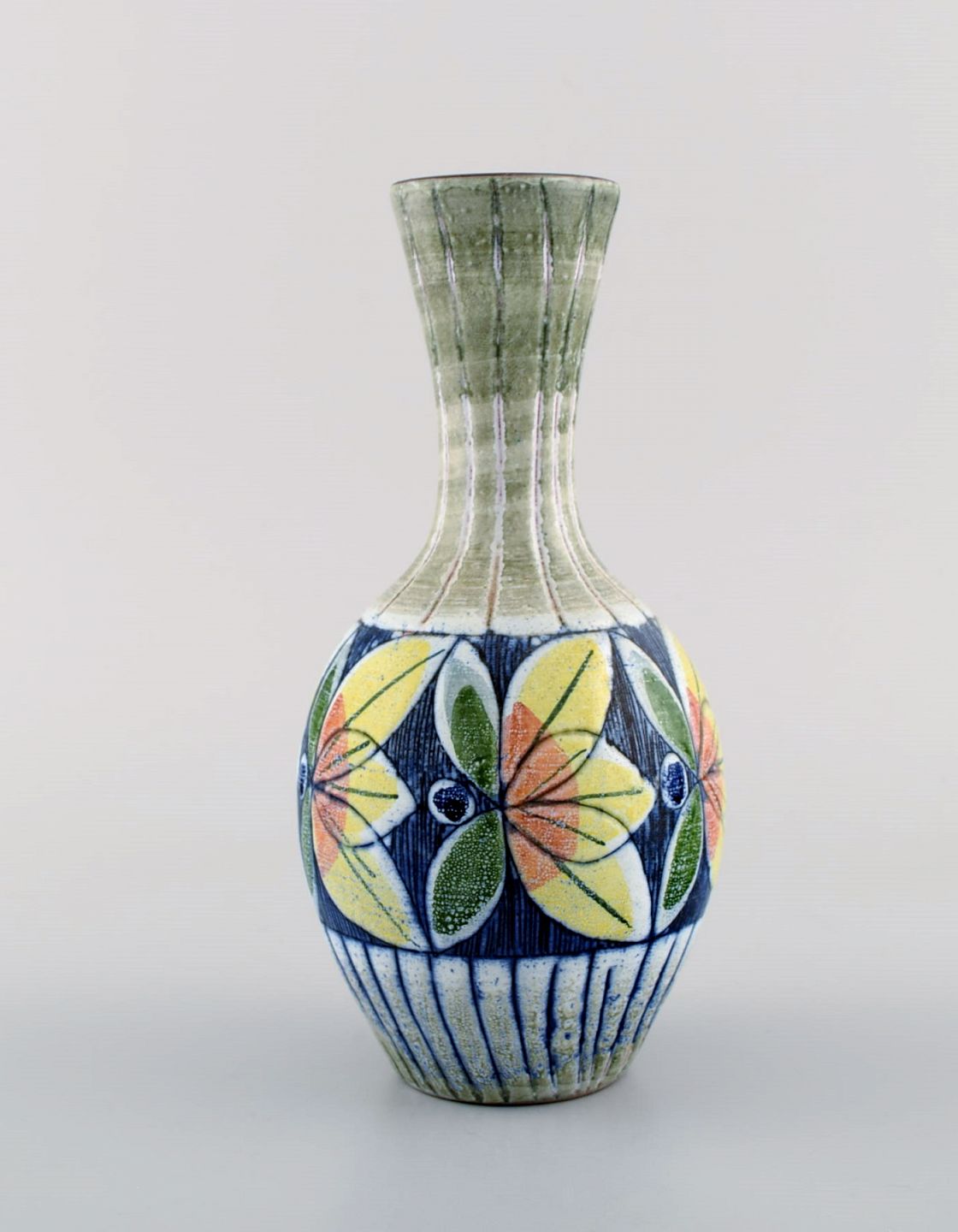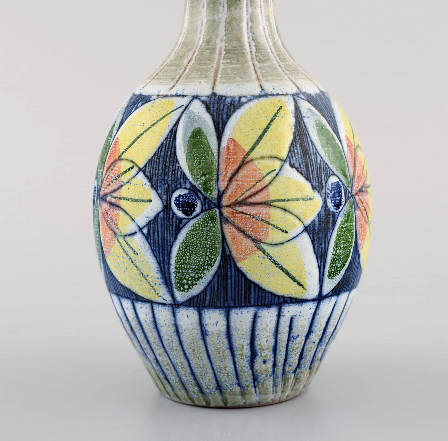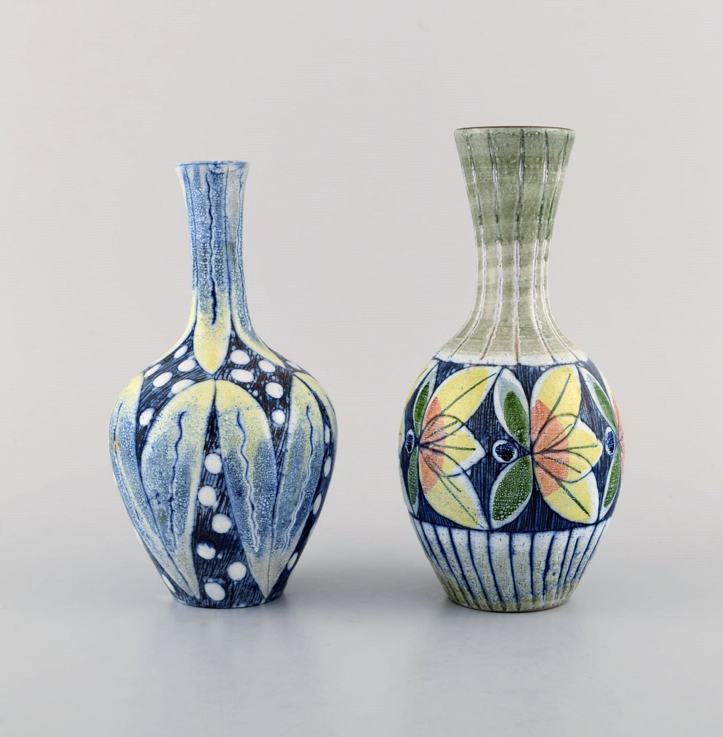 Tilgmans, Sweden. Two vases in glazed ceramics with hand painted flowers. 1960s. Largest measures: 19 x 9 cm. In excellent condition. Stamped.