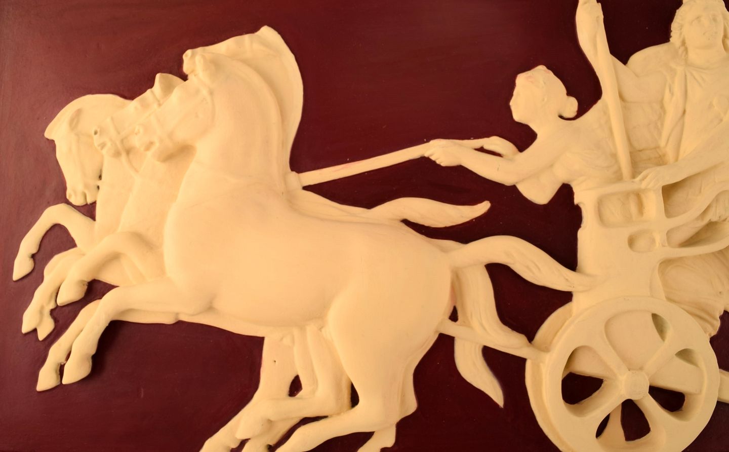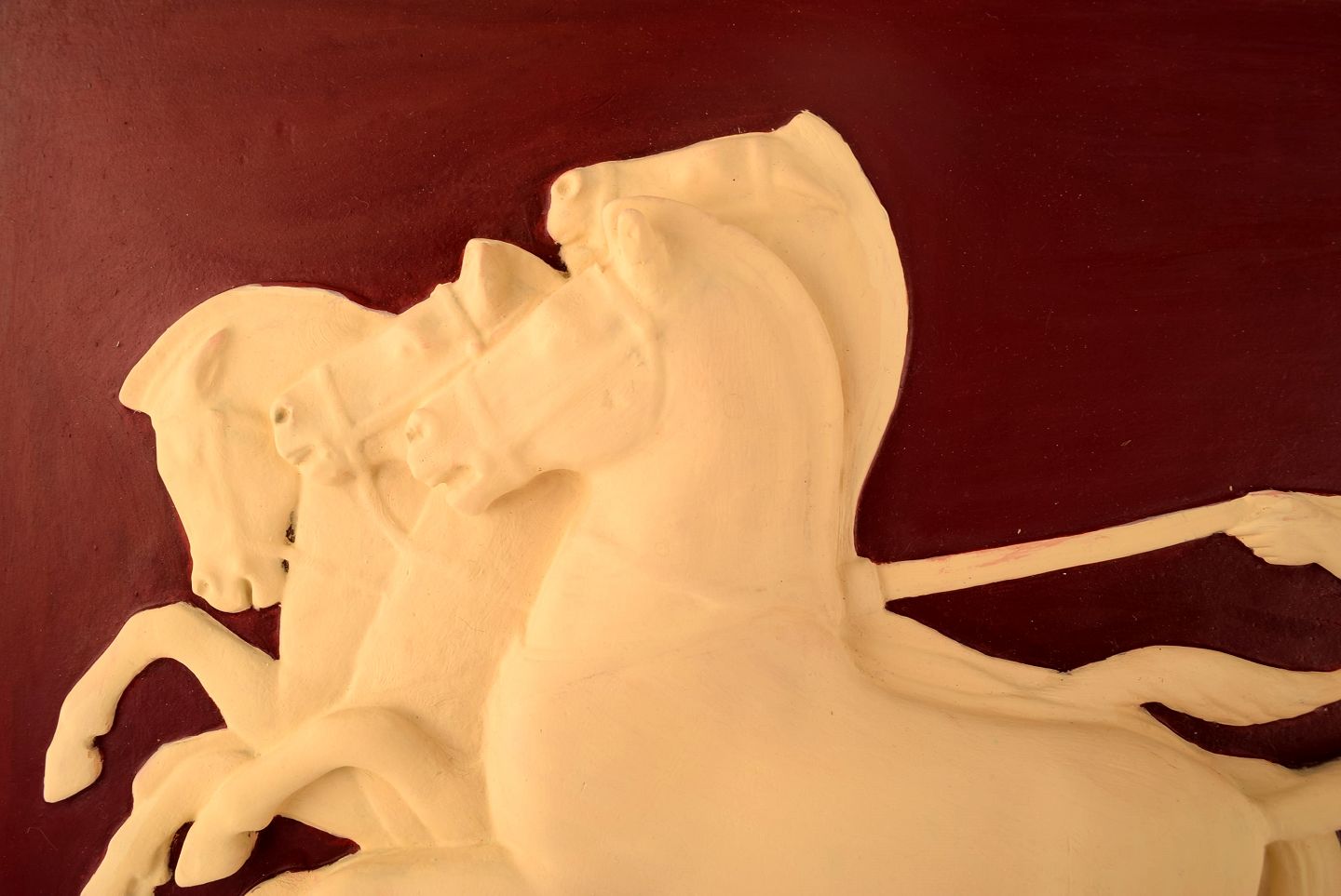 Colossal plaster wall plaque with motif by Thorvaldsen. Chariot with four horses in front. 1930 / 40s.