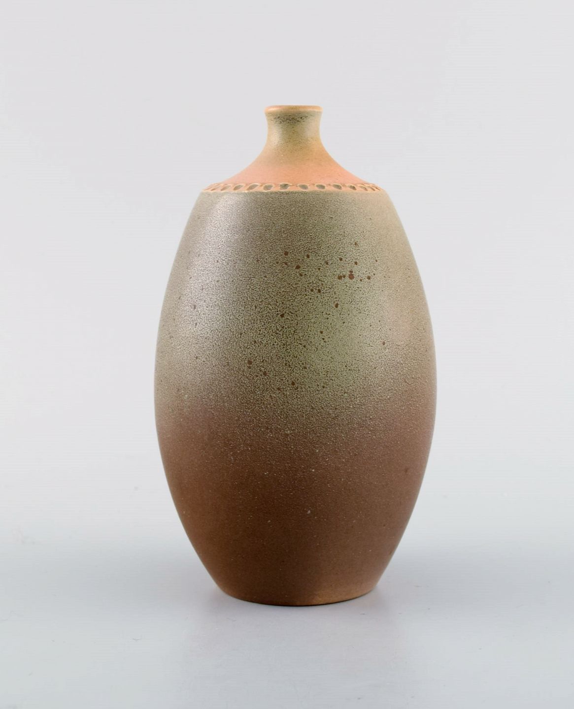 European studio ceramicist. Unique vase in glazed ceramics. 1970s. Measures: 15 x 8.7 cm. In excellent condition. Signed.