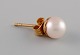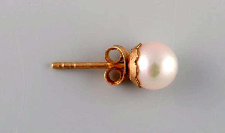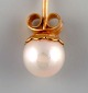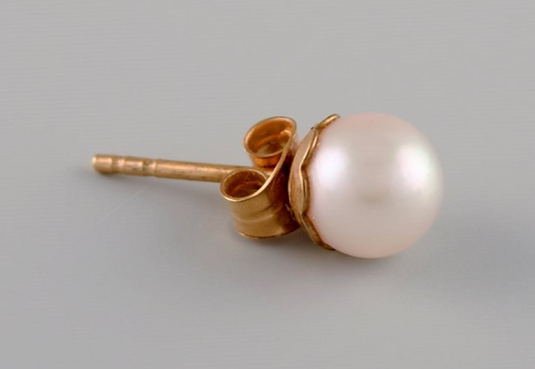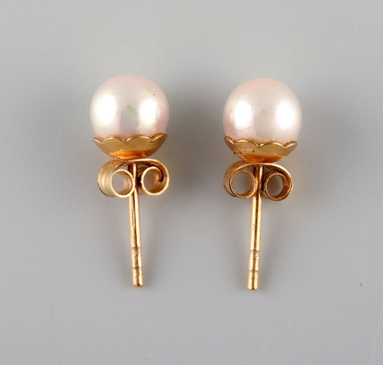 Swedish jeweler. A pair of classic ear studs in 18 carat gold adorned with cultured pearls. Mid-20th century. Measures: 16 x 7 mm. In excellent condition. Stamped.