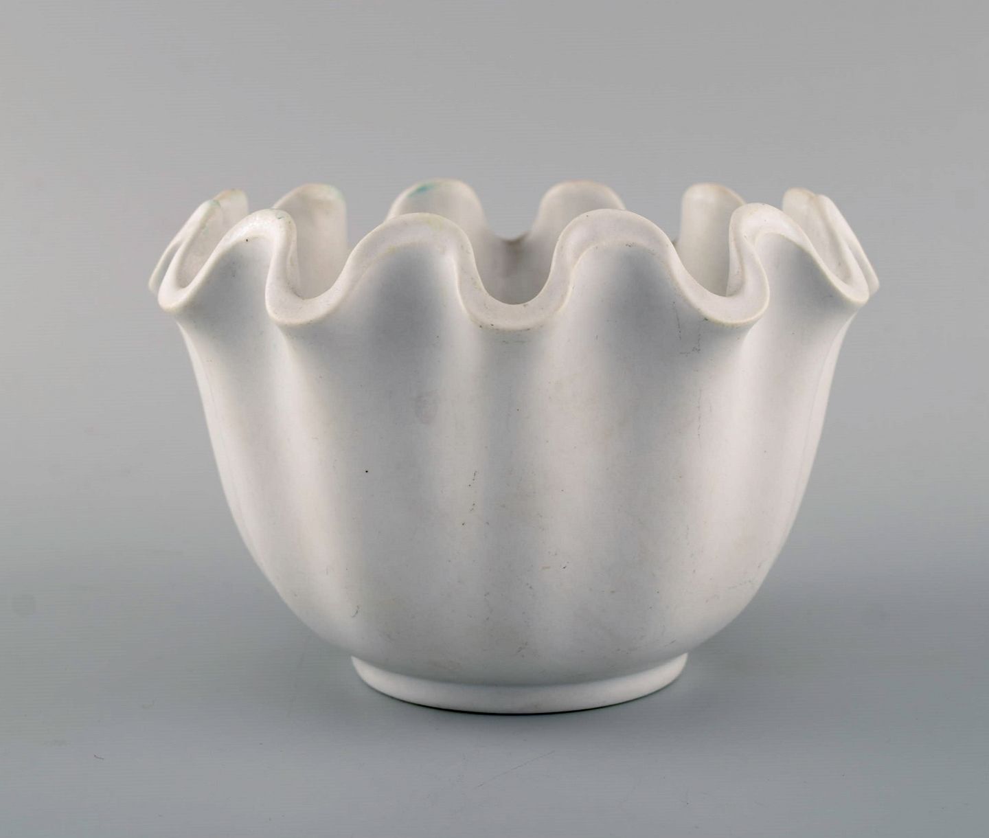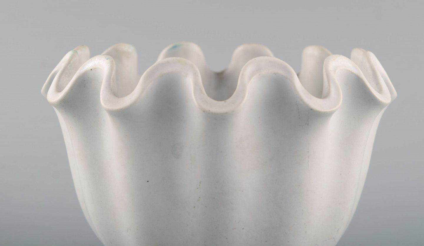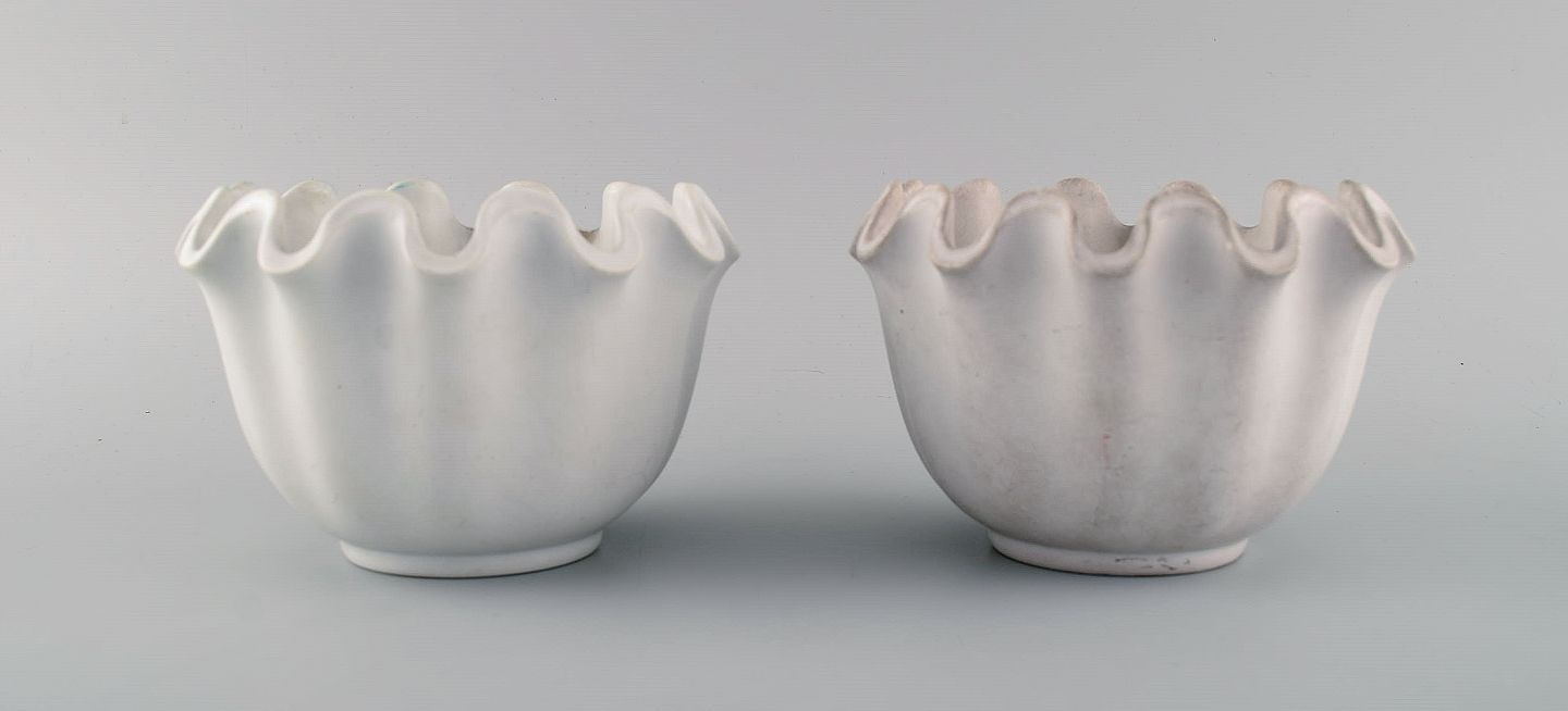 Wilhelm Kåge for Gustavsberg. To Carrara vaser / skåle med bølget kant i keramik. Måler 15 x 10,5 cm. I flot stand. Stemplet.