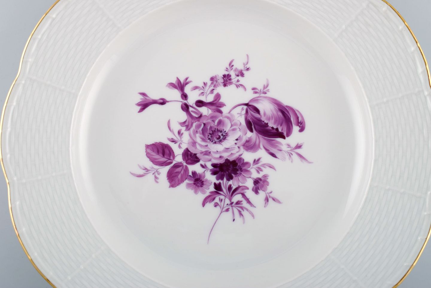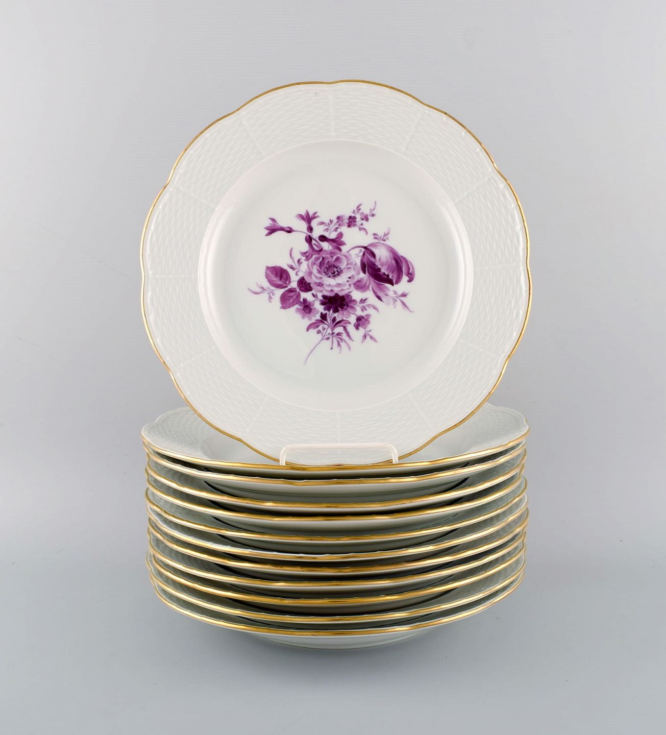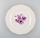 Tolv antikke Meissen middagstallerkener i håndmalet porcelæn med lilla blomster og guldkant. Ca. 1900. Diameter: 26,5 cm. 1. sortering. I flot stand. Stemplet.