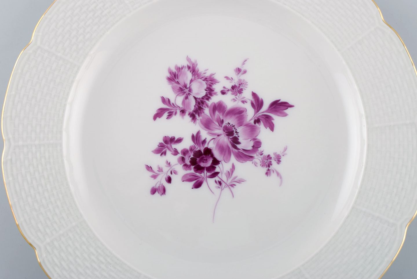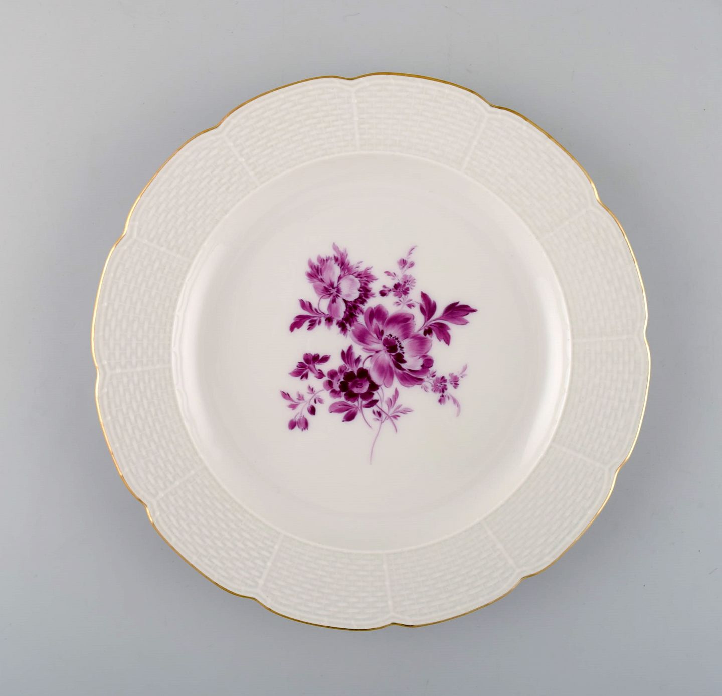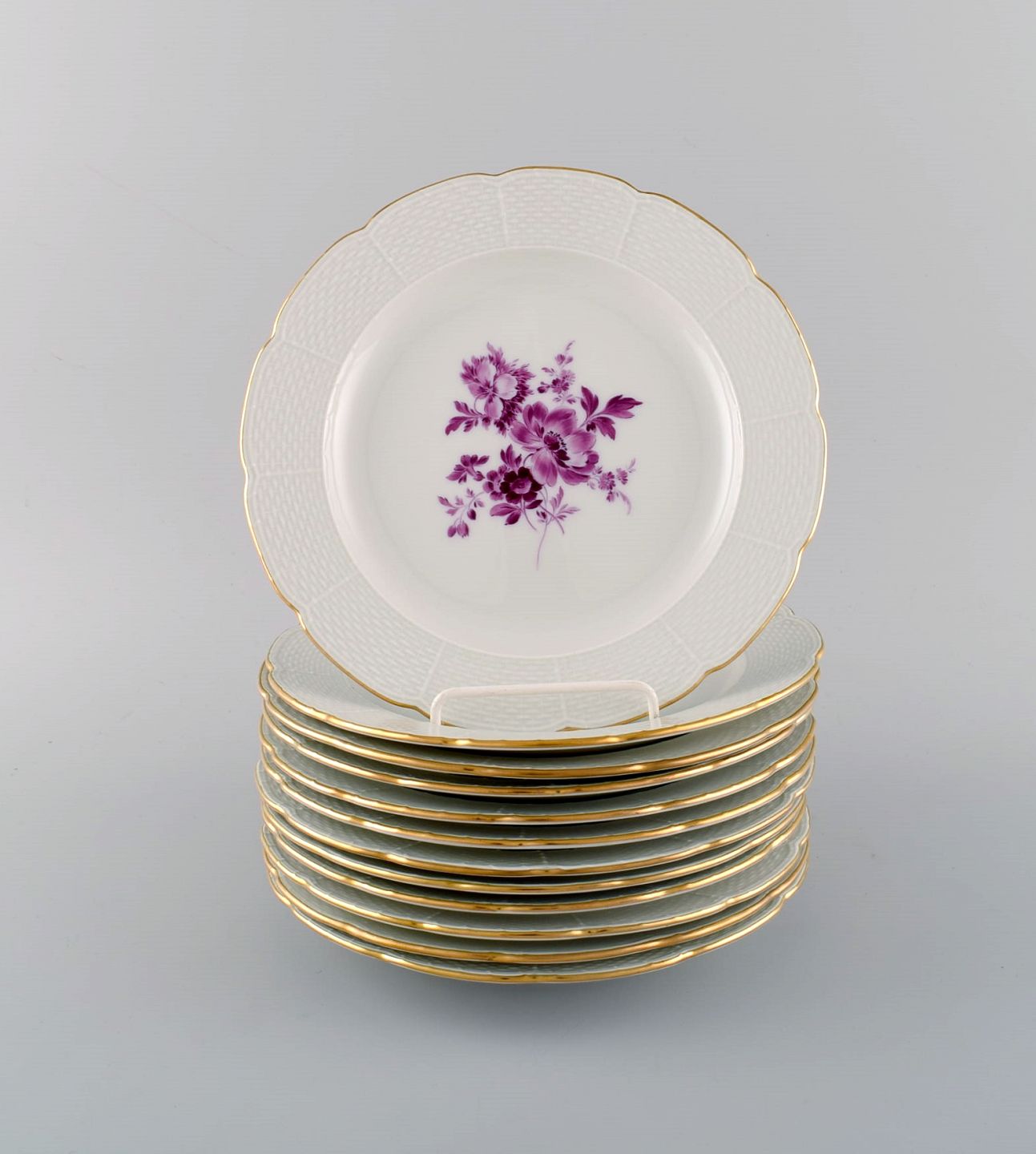 Twelve antique Meissen plates in hand-painted porcelain with purple flowers and gold edge. Ca. 1900. Diameter: 20.5 cm. 1st factory quality. In excellent condition. Stamped.