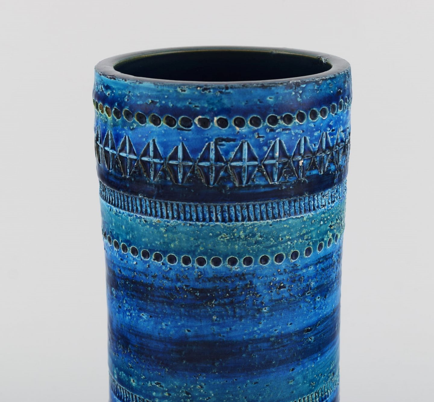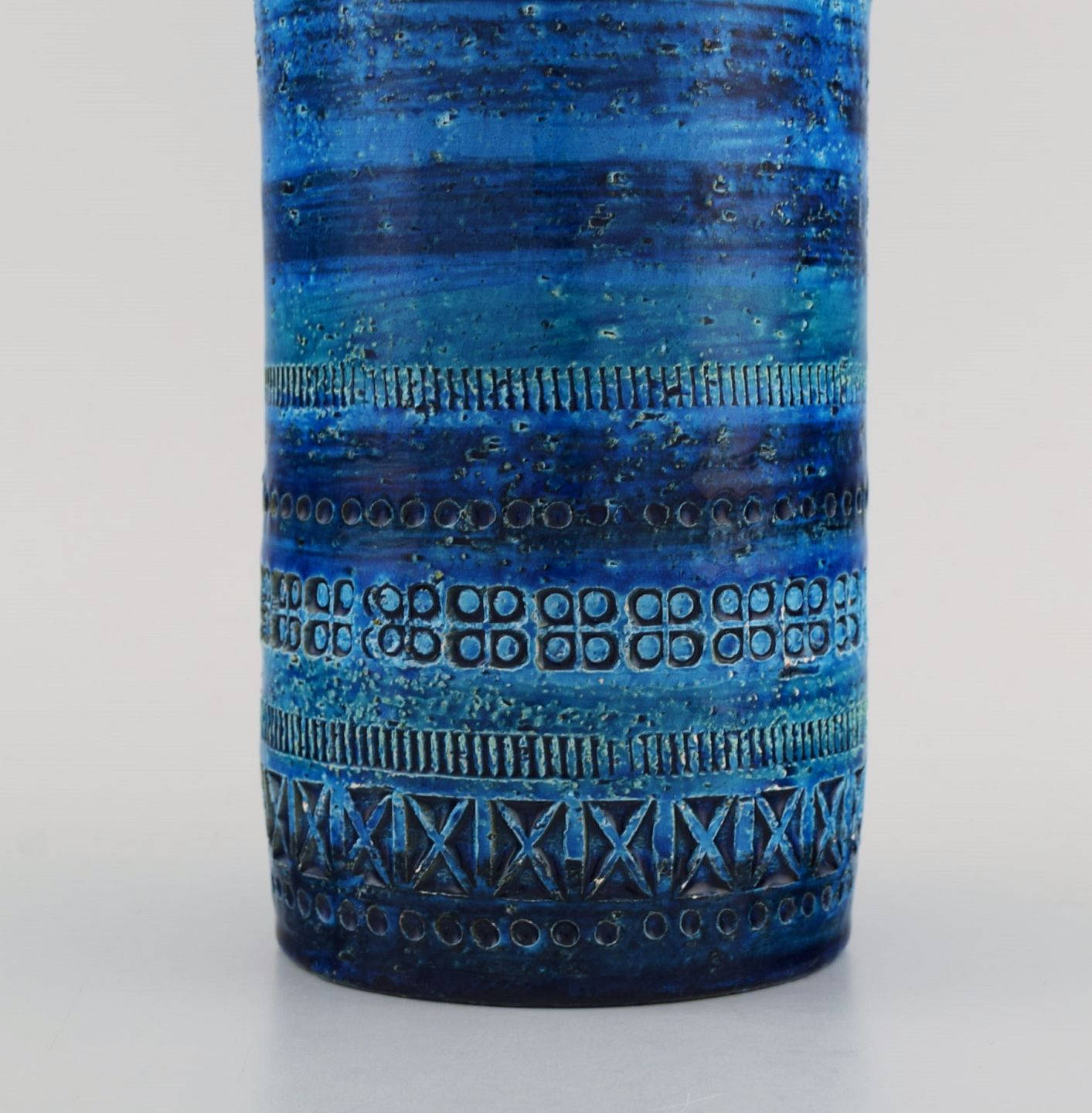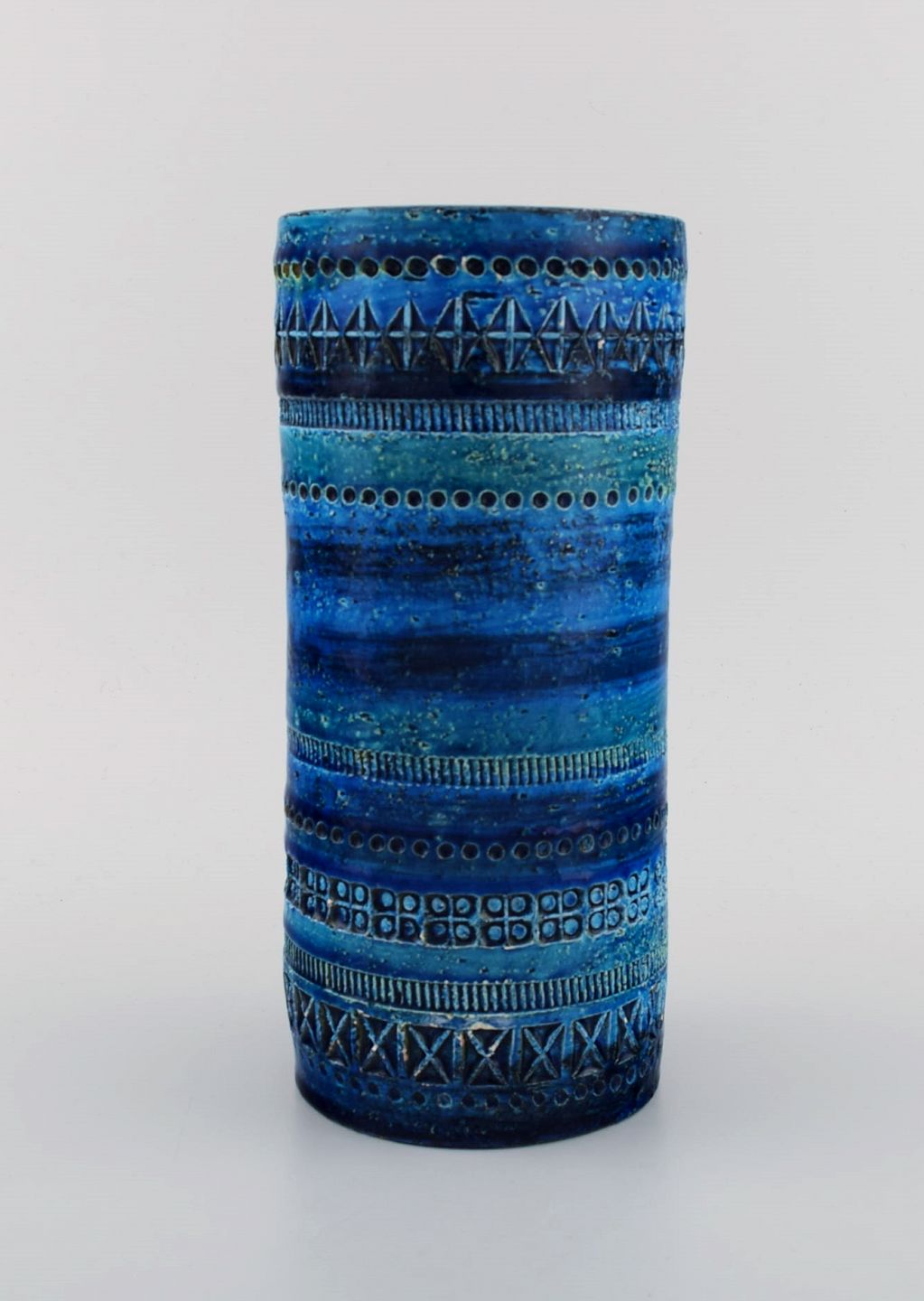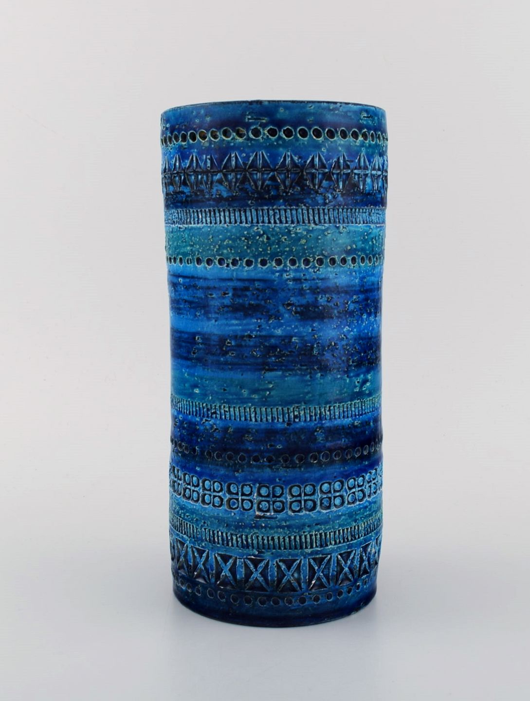 Aldo Londi for Bitossi. Cylindrical vase in Rimini blue glazed ceramics with geometric patterns. 1960's. Measures: 23 x 10.5 cm. In excellent condition. Stamped.