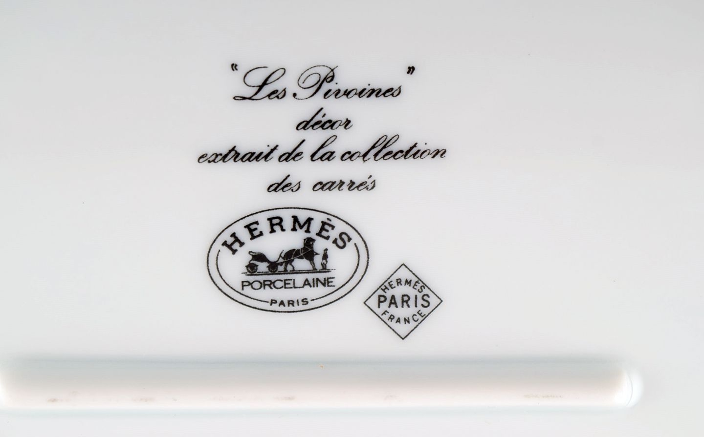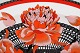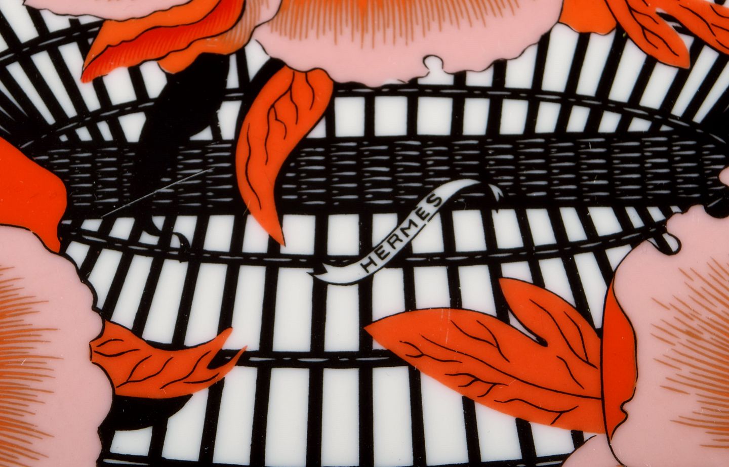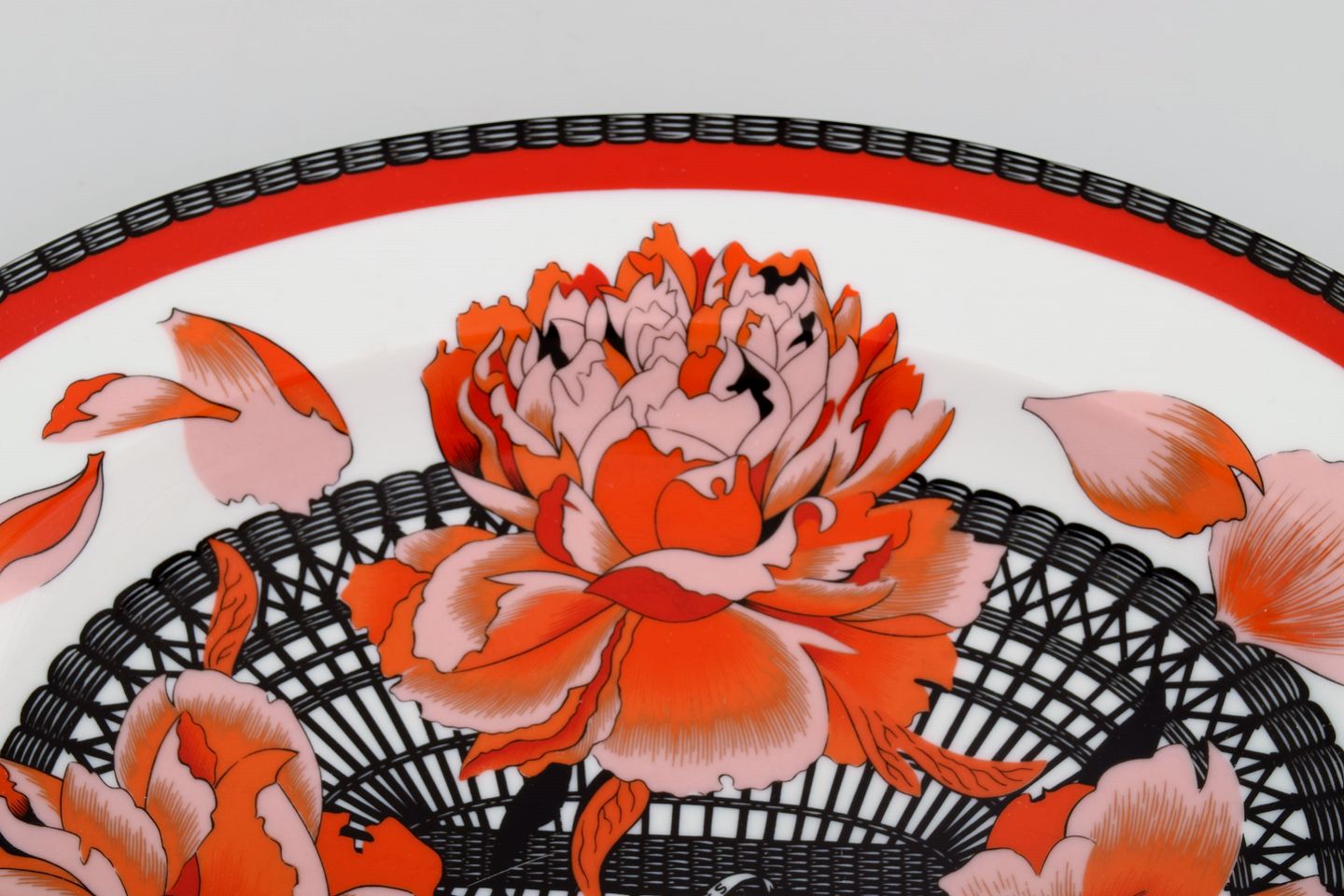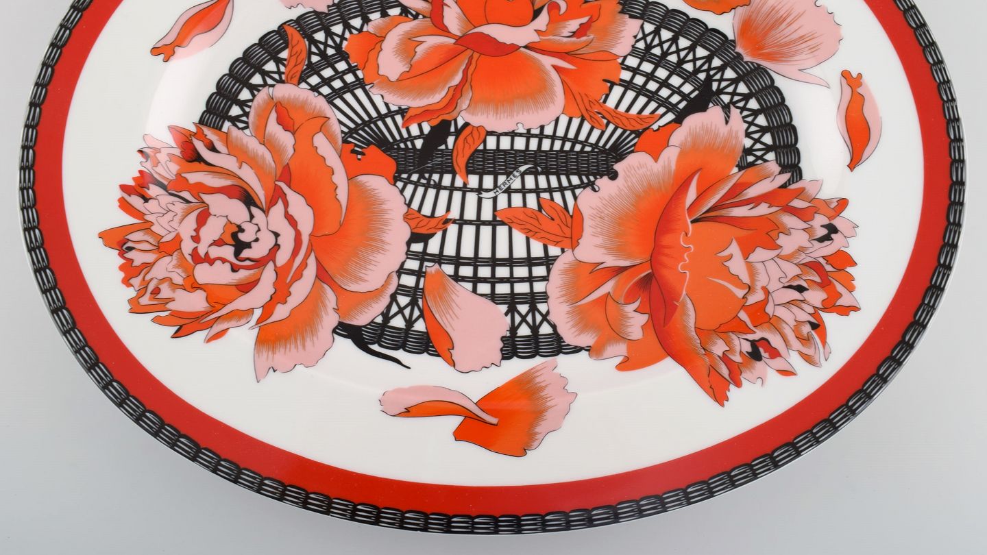 Stort Hermès serveringsfad i porcelæn dekoreret med røde blomster og sort/hvid mønstret dekoration. 1980erne. Måler: 36,5 x 28,5 x 3,5 cm. I flot stand. Stemplet.