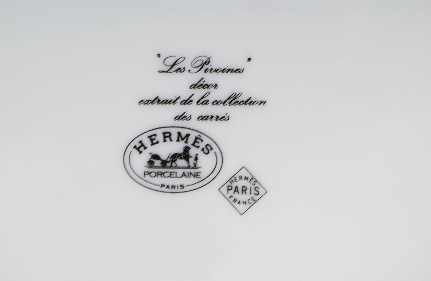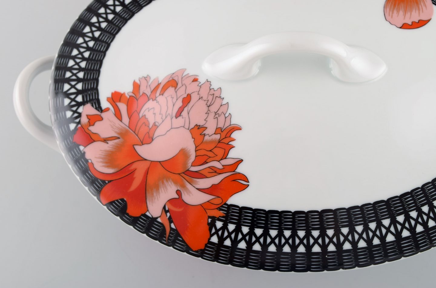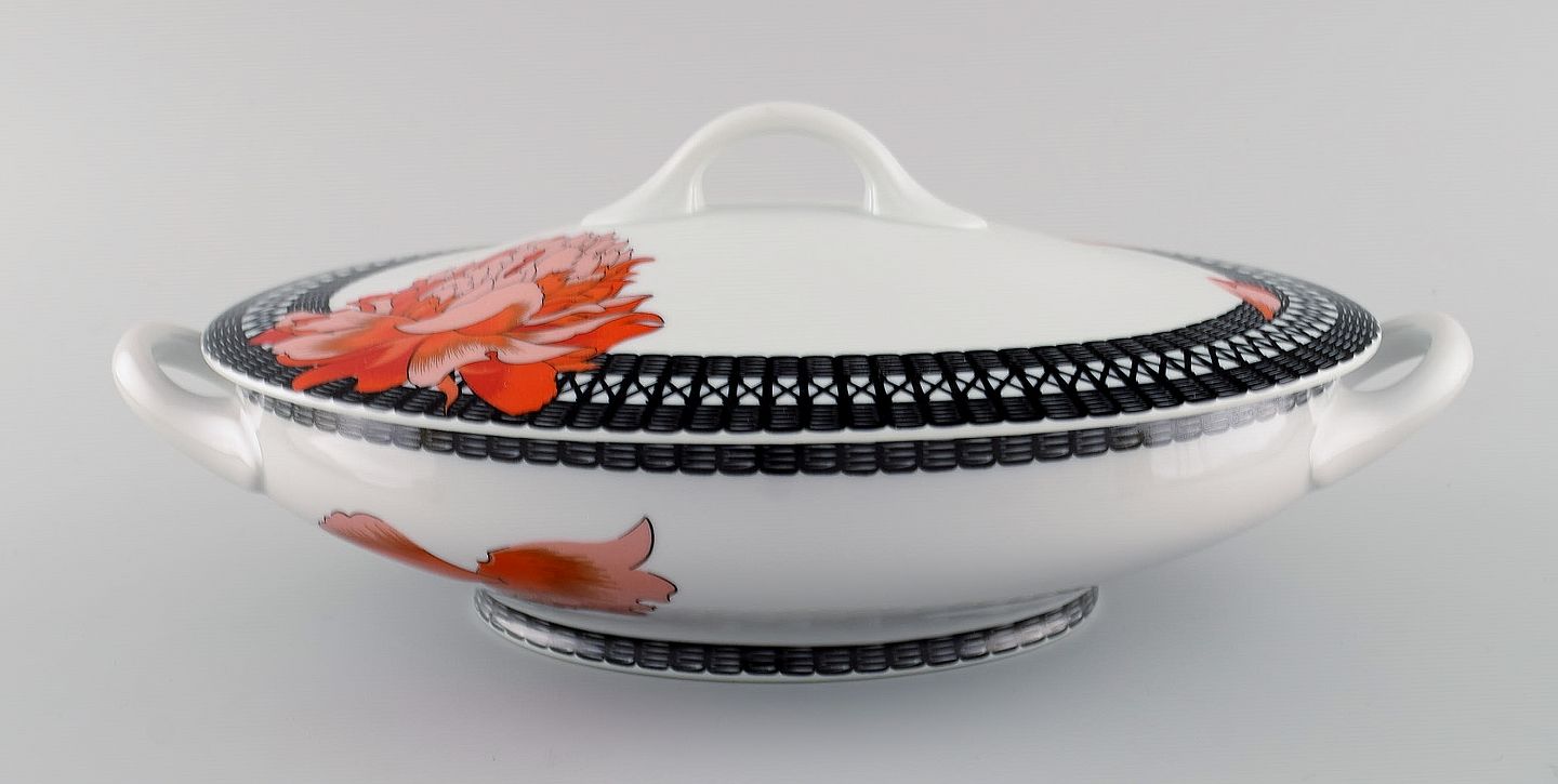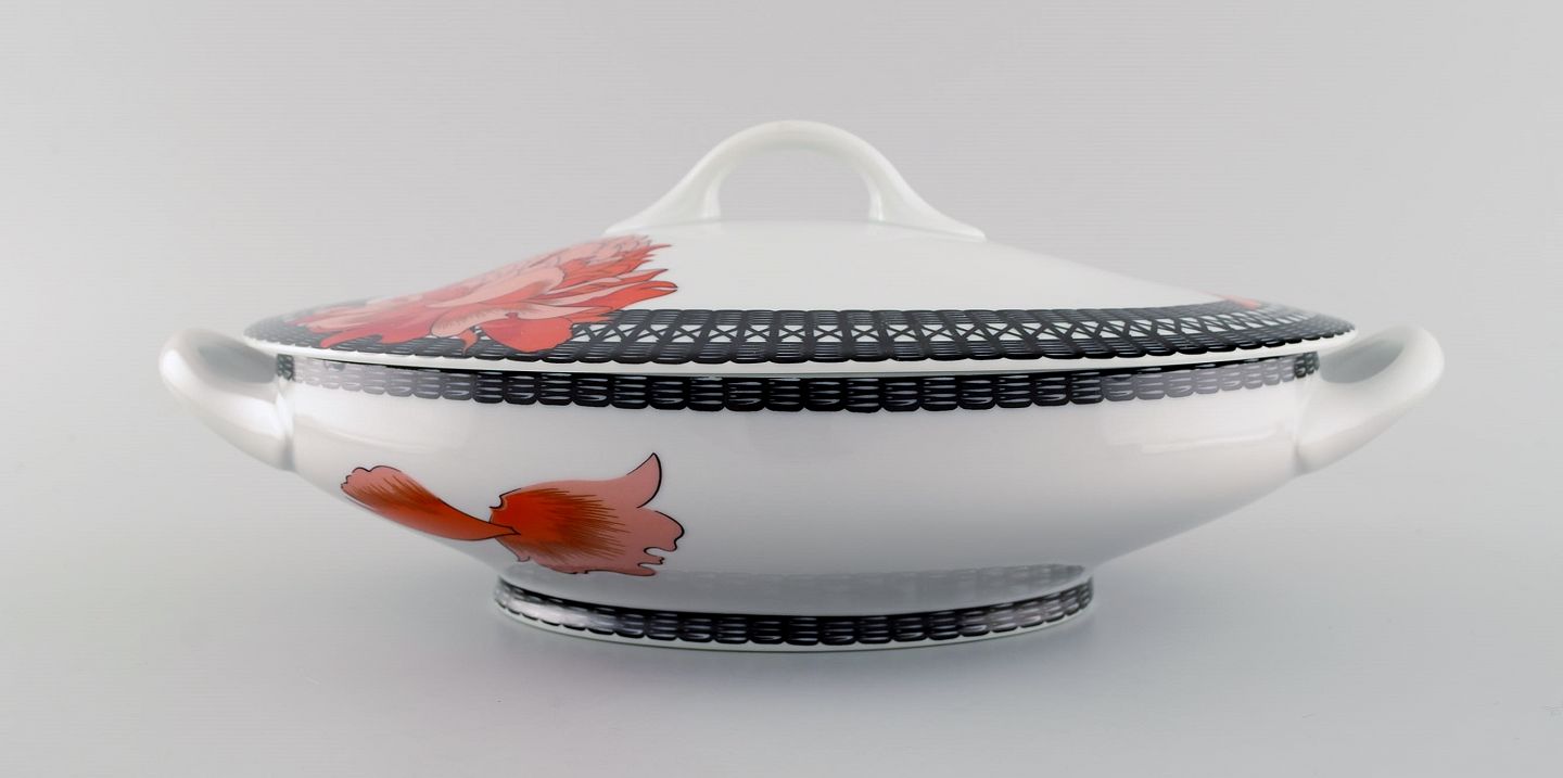Hermès porcelain lidded tureen decorated with red flowers and black patterned edge. 1980s. Measures: 32 x 20.5 x 12.5 cm. In excellent condition. Stamped.