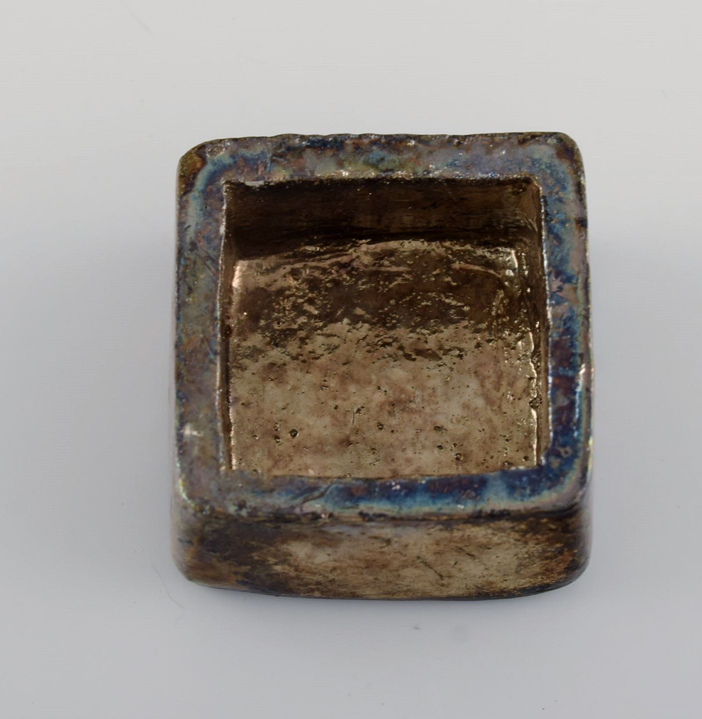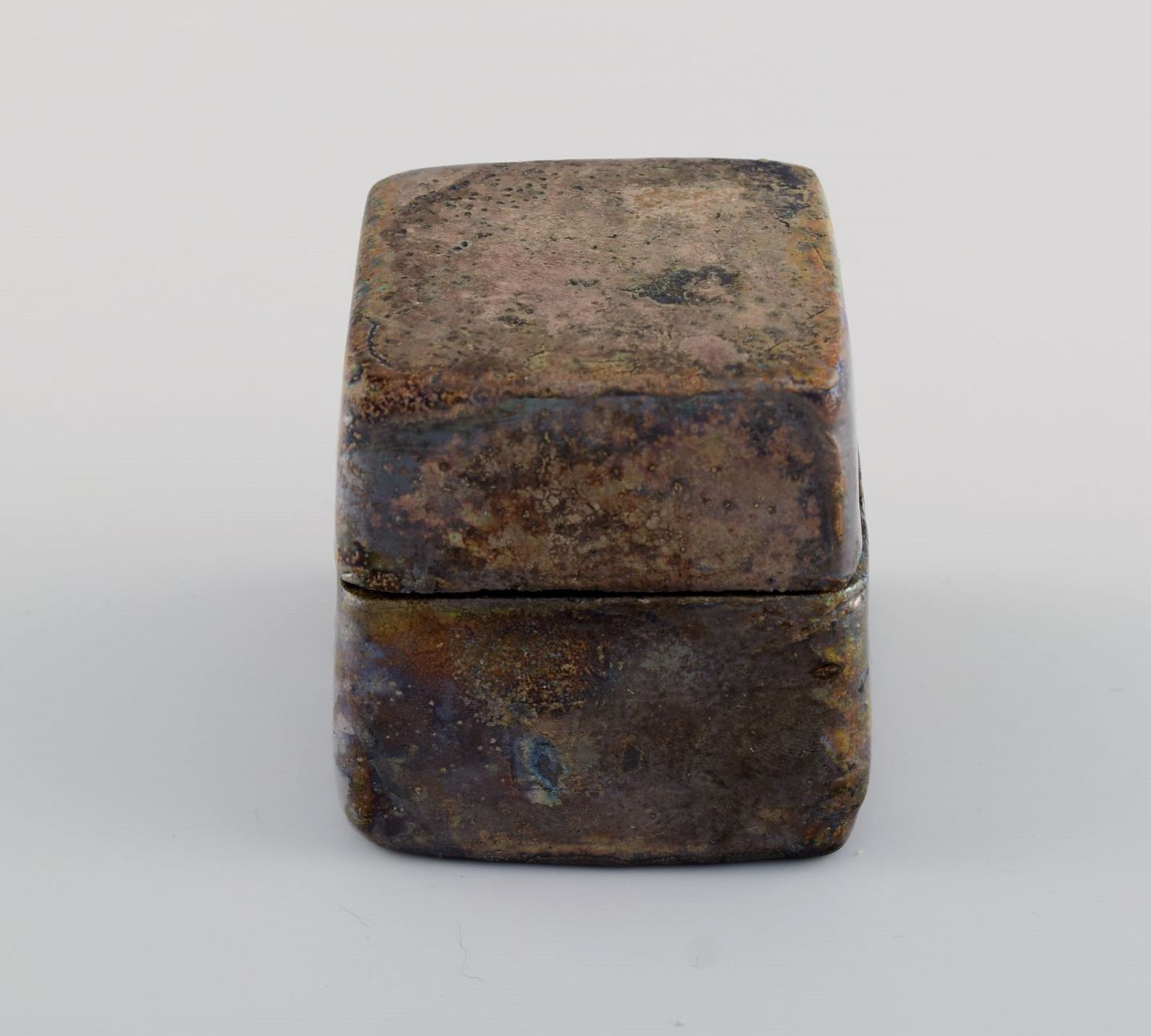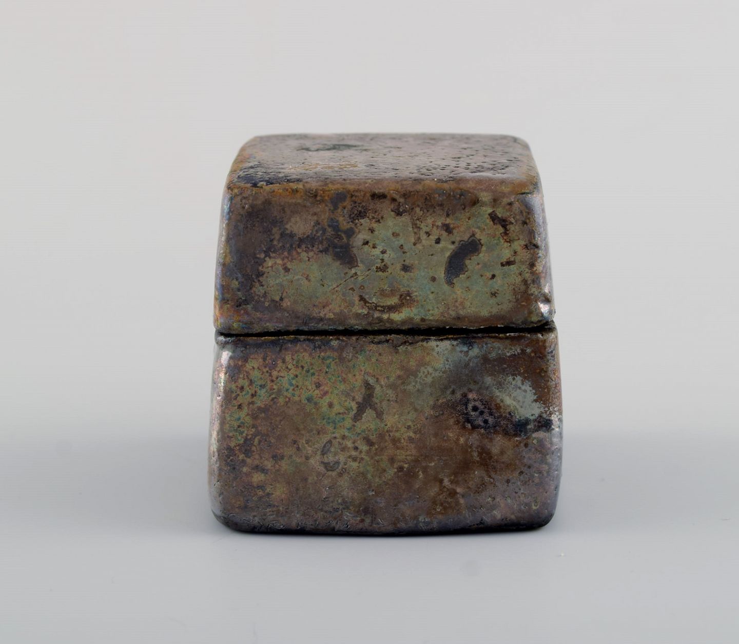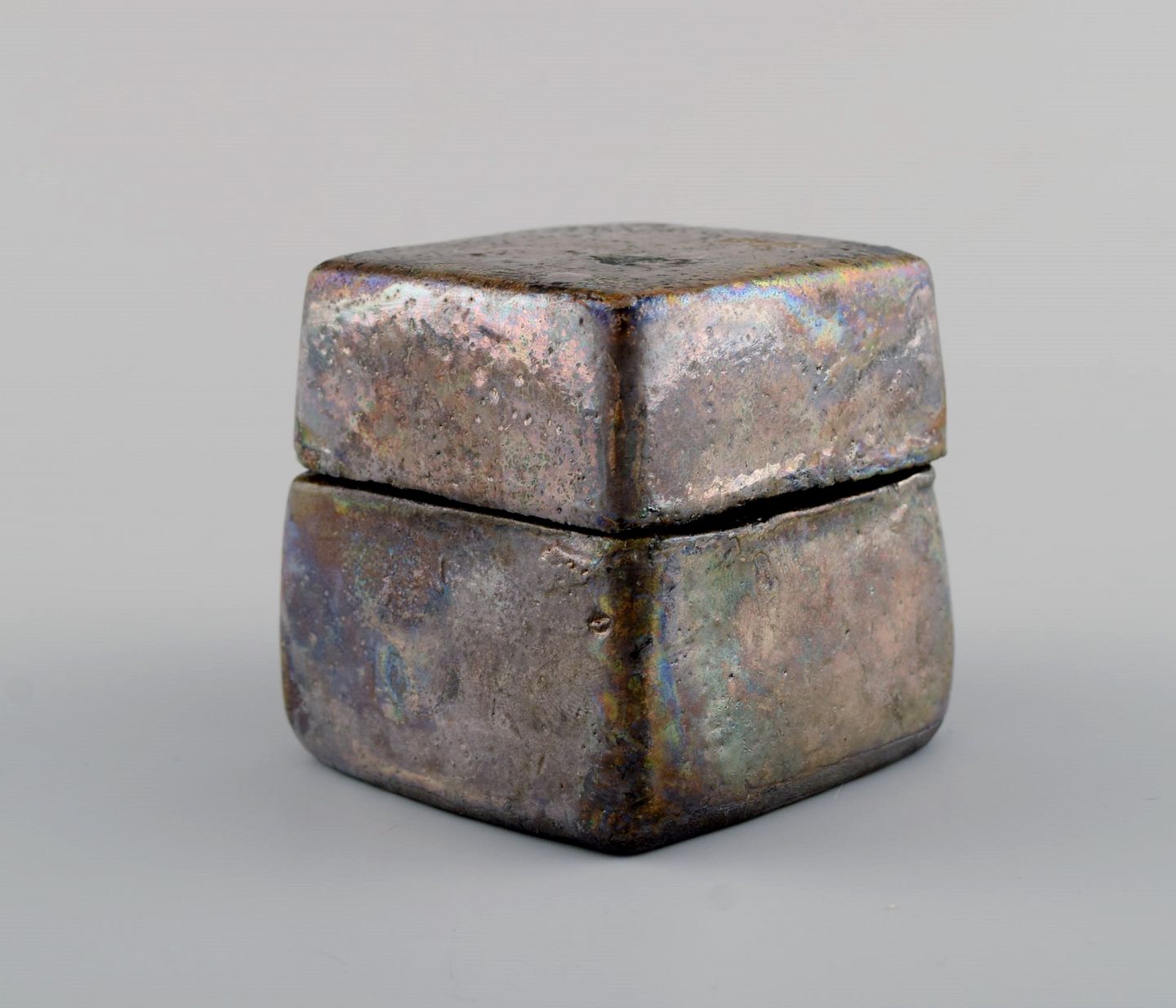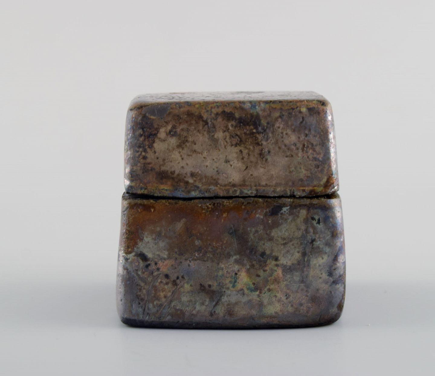Europæisk studio keramiker. Lågkrukke i glaseret keramik. Smuk metallisk glasur. Dateret 1998. Måler: 6,5 x 6,5 cm. I flot stand. Signeret og dateret.