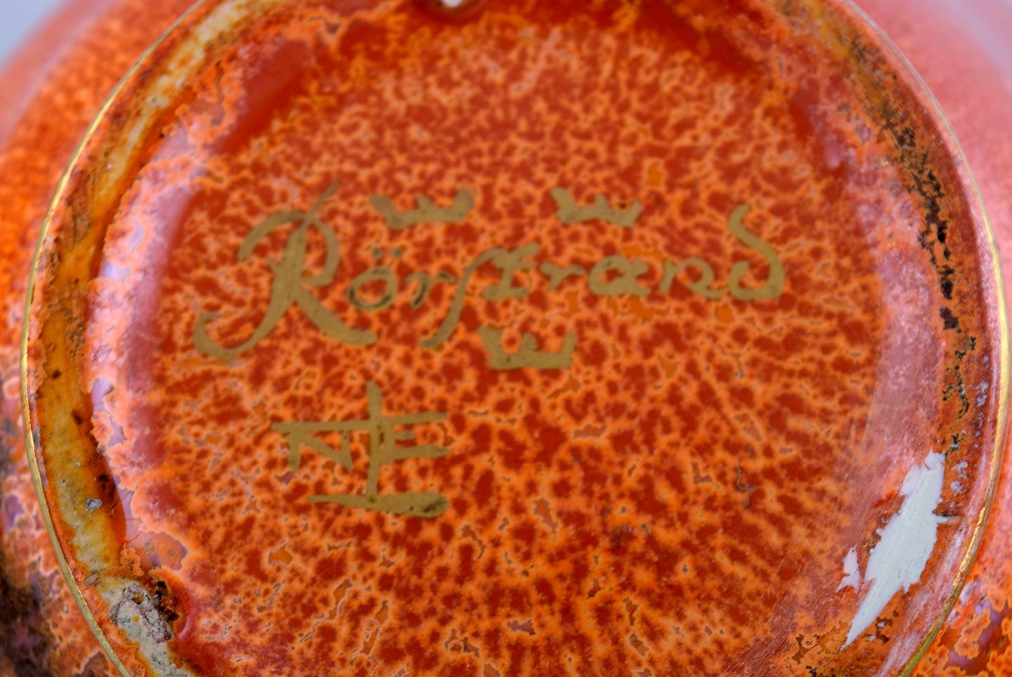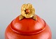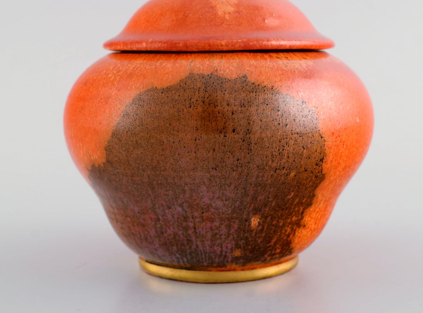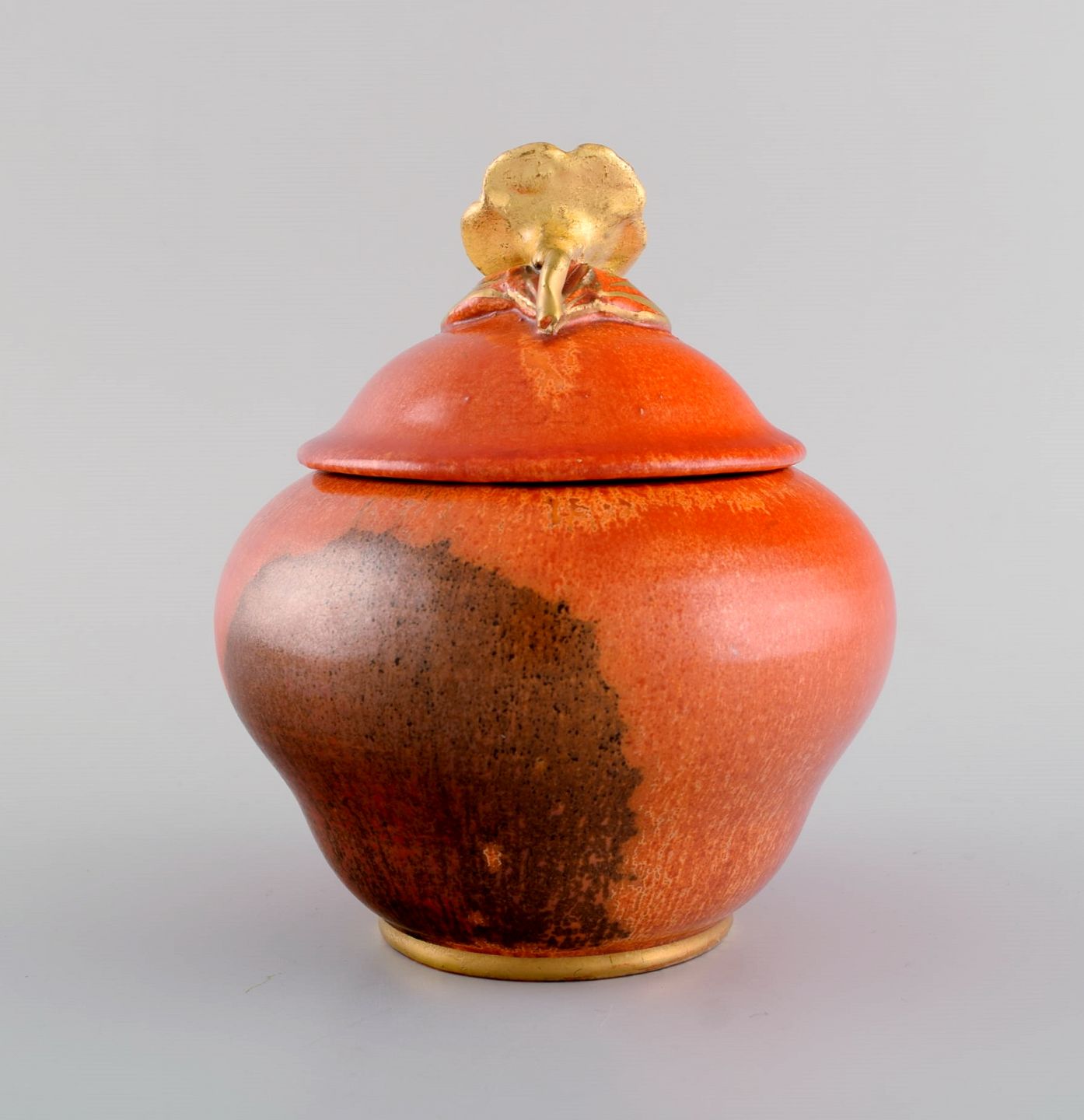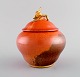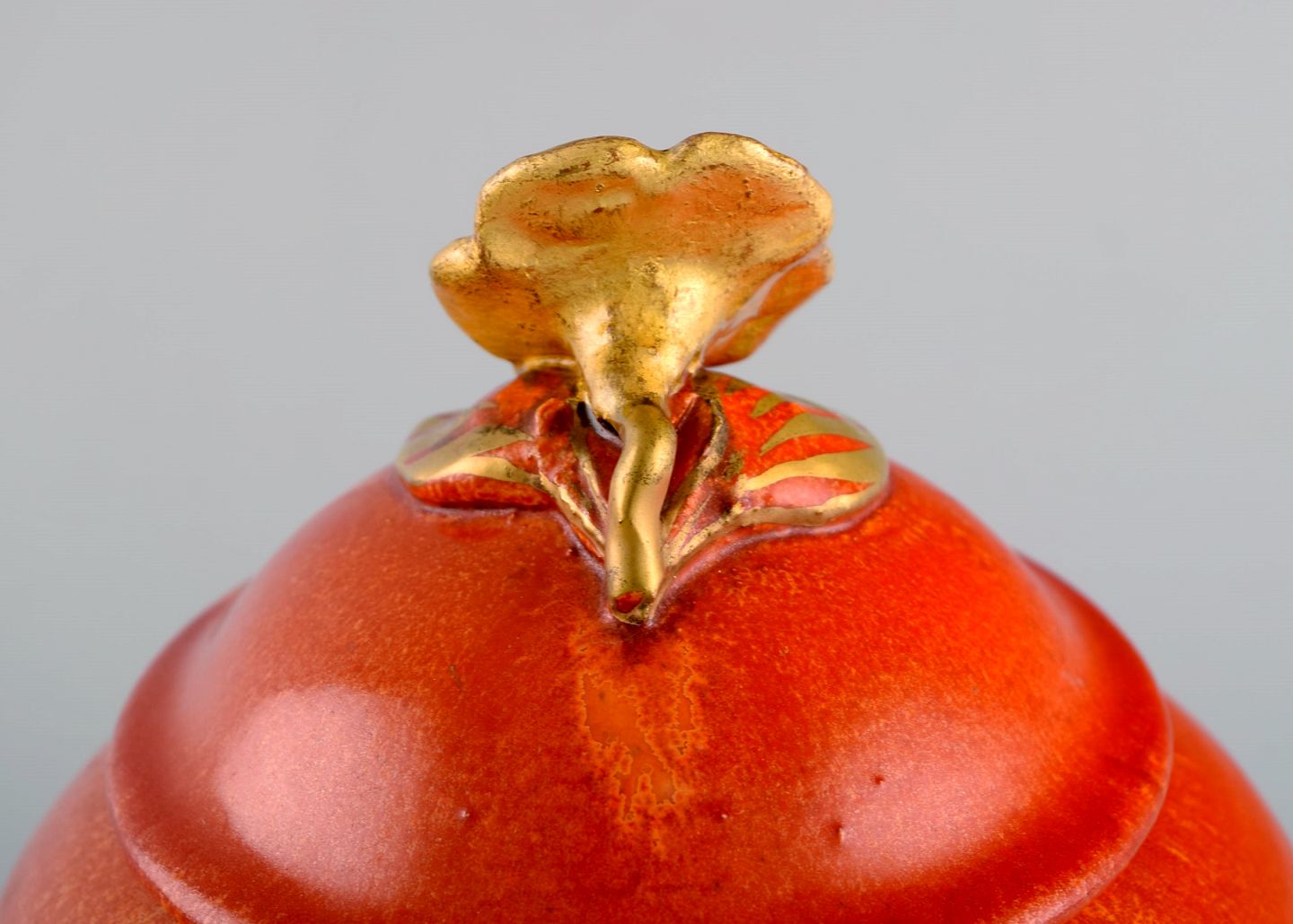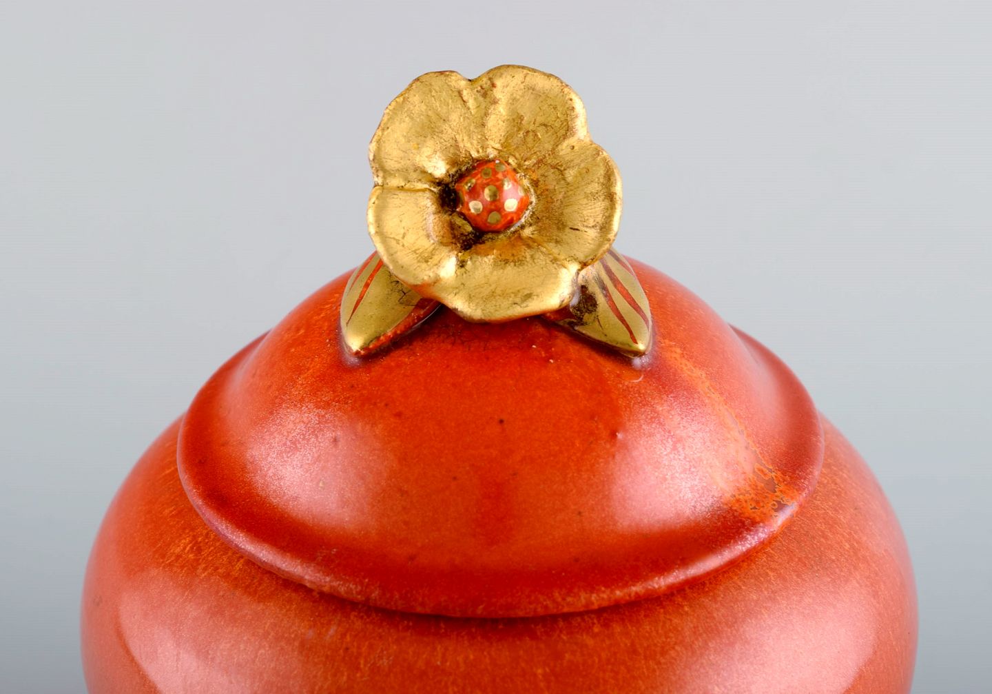 Nils Emil Lundström (1865-1960) for Rörstrand. Antique lidded jar in glazed ceramics. Beautiful orange glaze and flower in gold on the lid. Early 20th century.