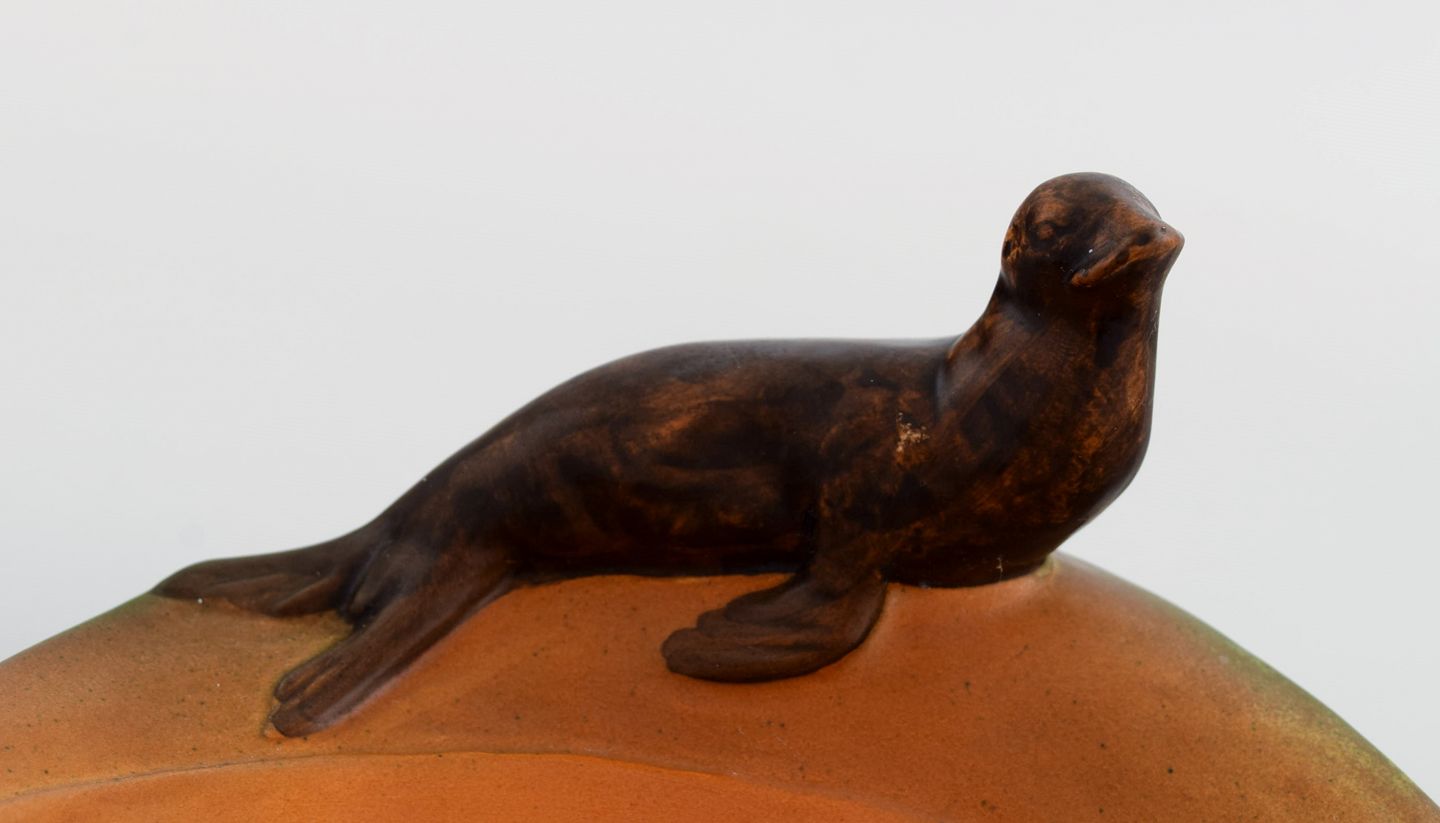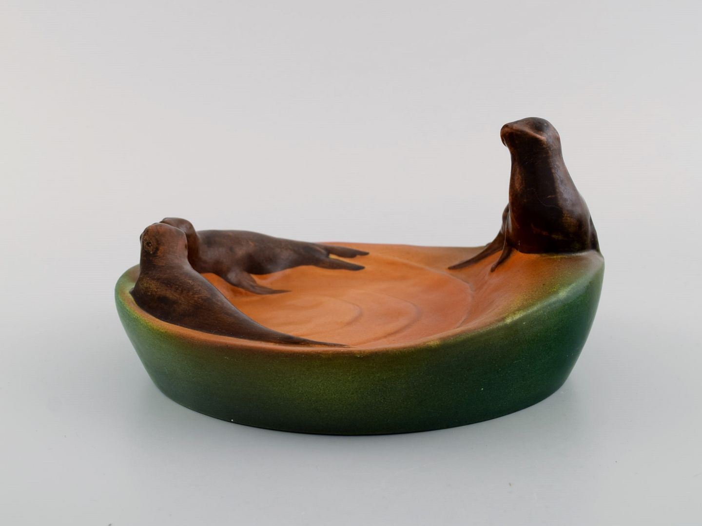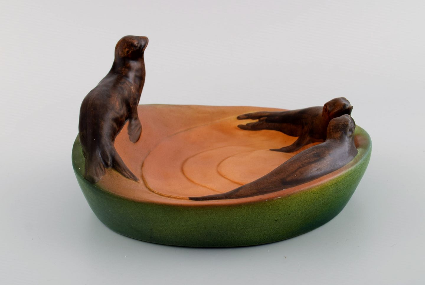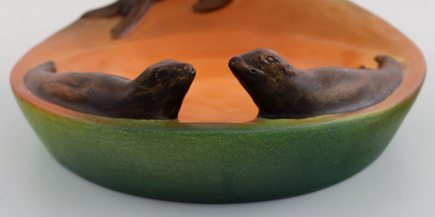 Ipsen's, Denmark. Dish with sea lions in hand-painted glazed ceramics. 1930's. Model number 143.
