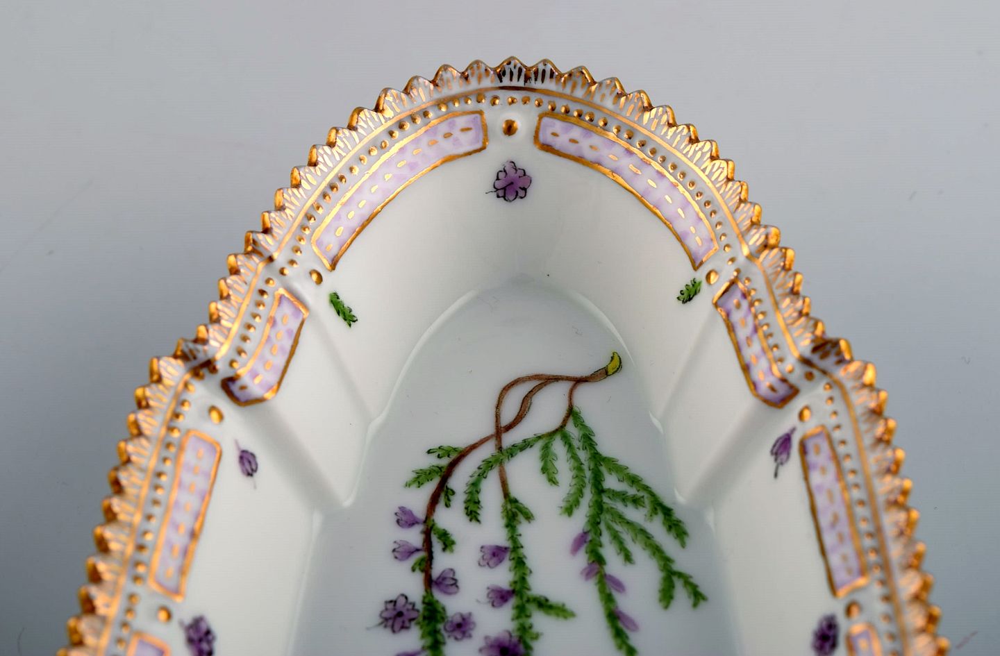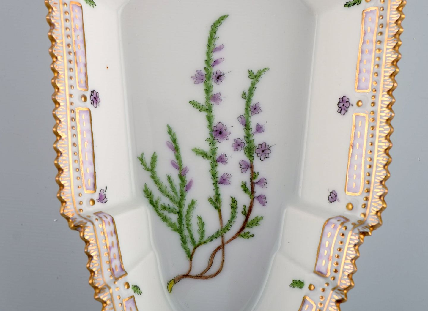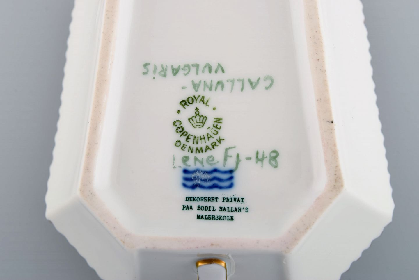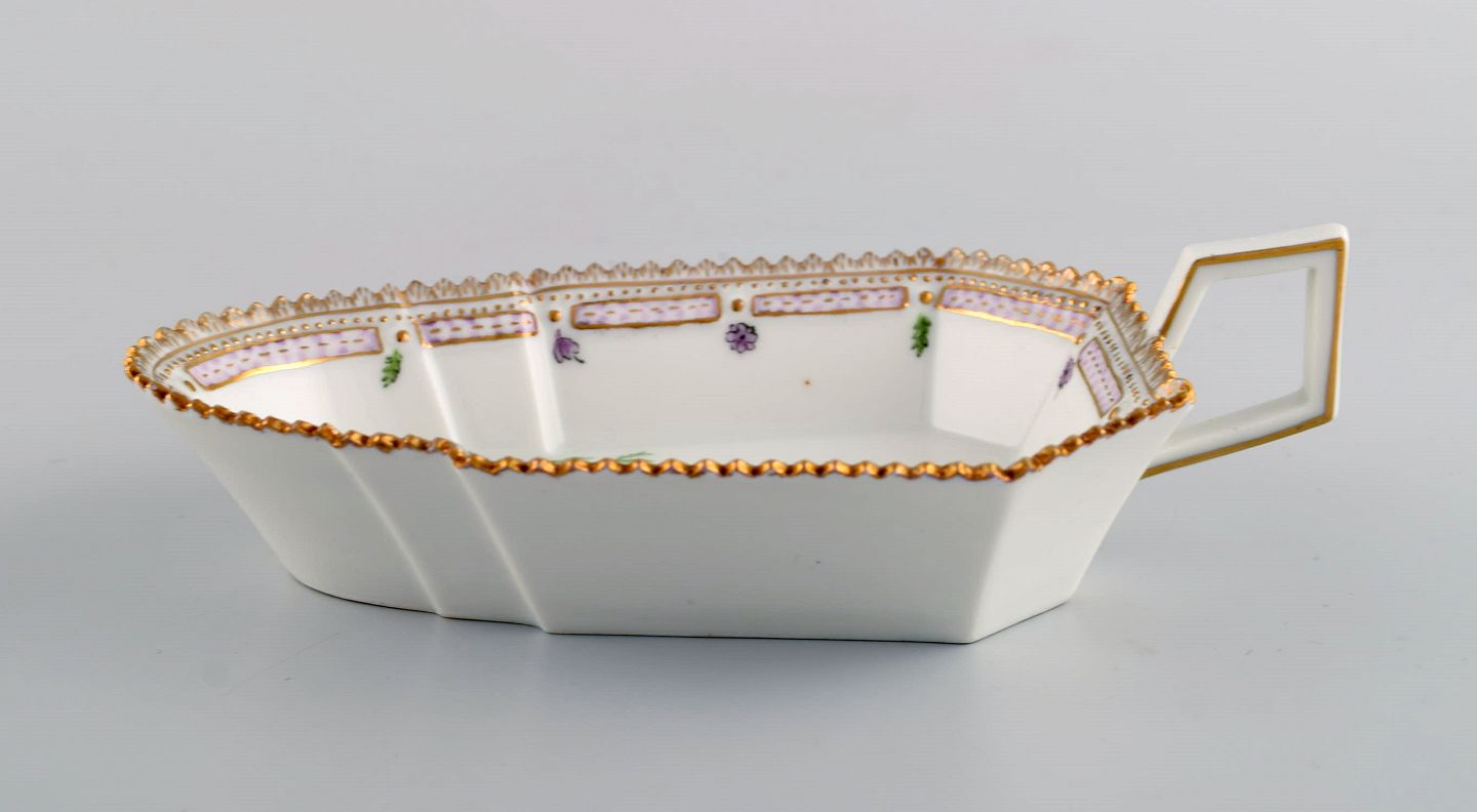 Royal Copenhagen Flora Danica asiet med hank i håndmalet porcelæn med blomster og gulddekoration. Dateret 1948. Måler: 18 x 5,3 cm. I flot stand. 2. Sortering. Stemplet. Hjemmedekoreret.