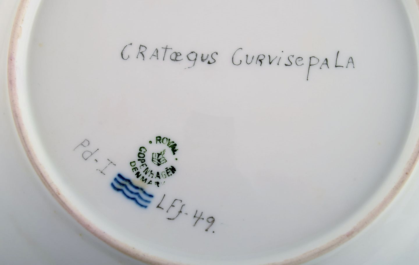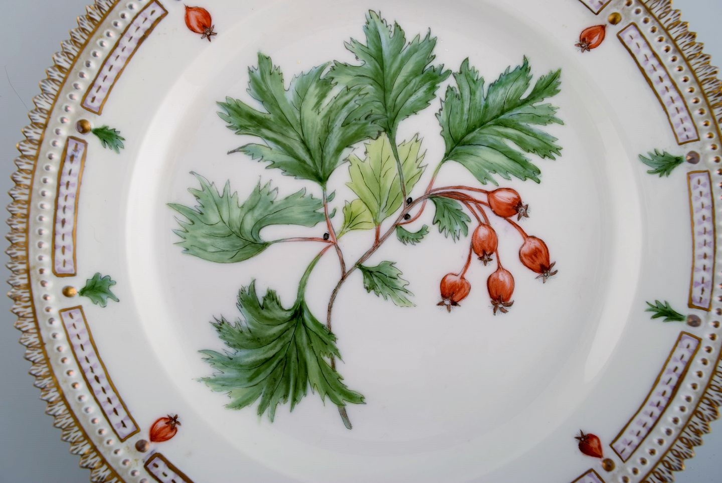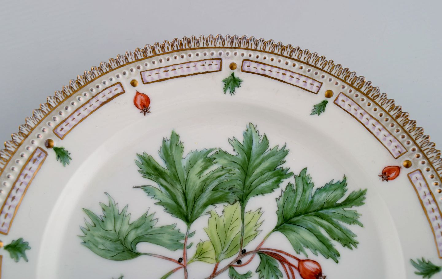 Royal Copenhagen Flora Danica plate in hand-painted porcelain with flowers and gold decoration. Dated 1949.