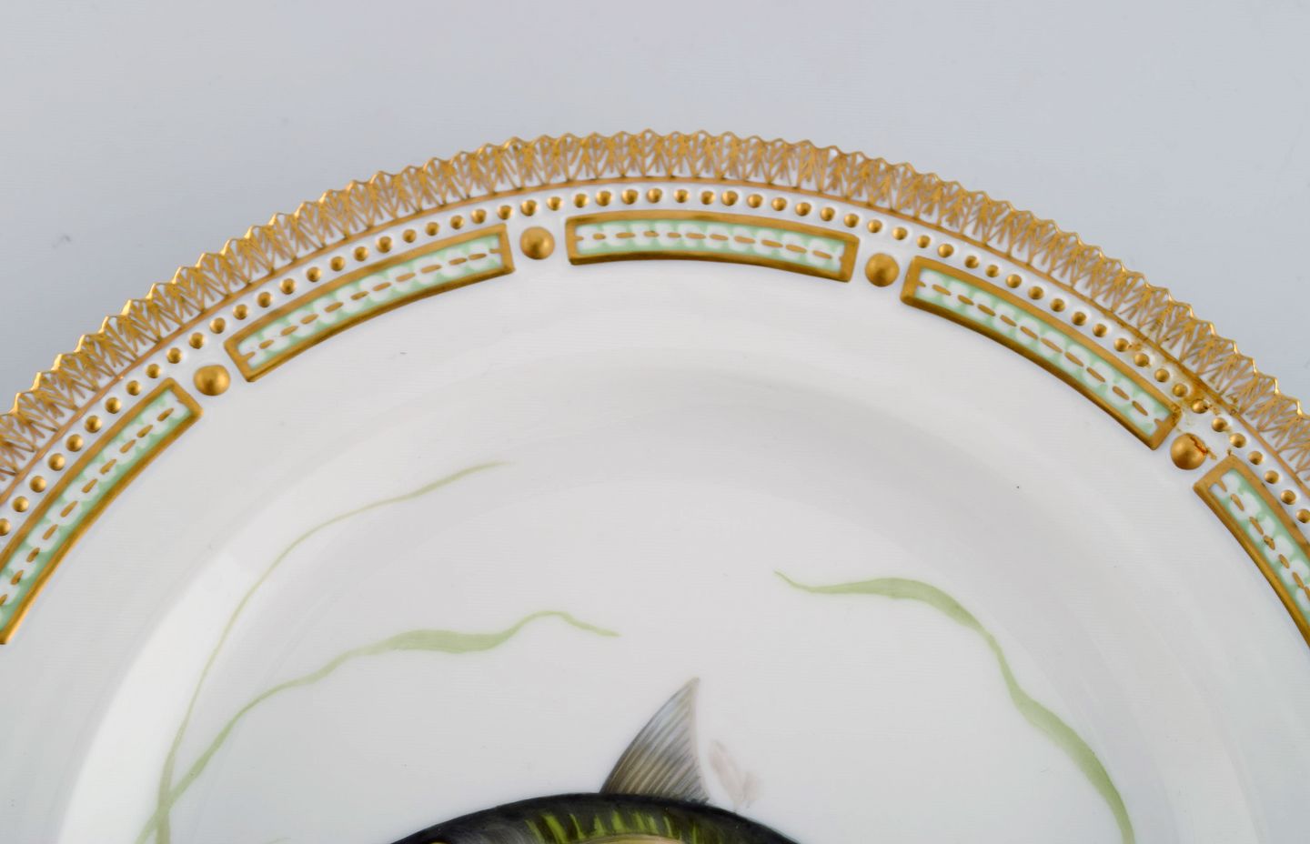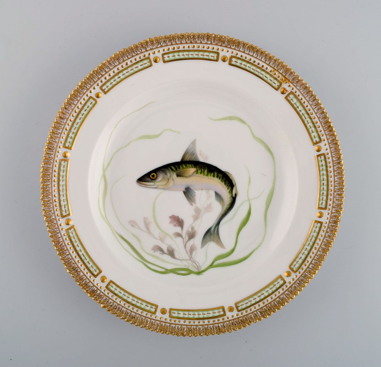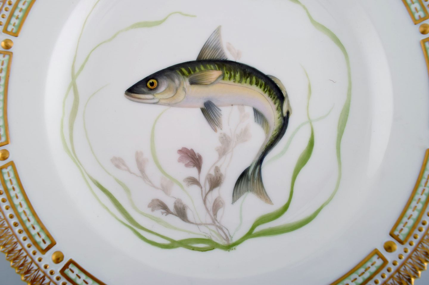 Royal Copenhagen Flora Danica fish plate in hand-painted porcelain with fish and gold decoration. Model number 19/3549. Diameter: 25.5 cm. In perfect condition. 1st factory quality. Stamped.