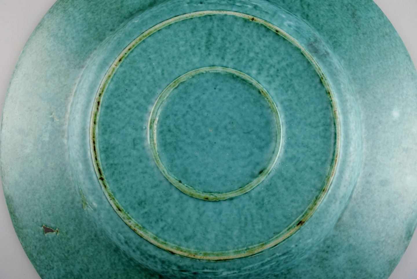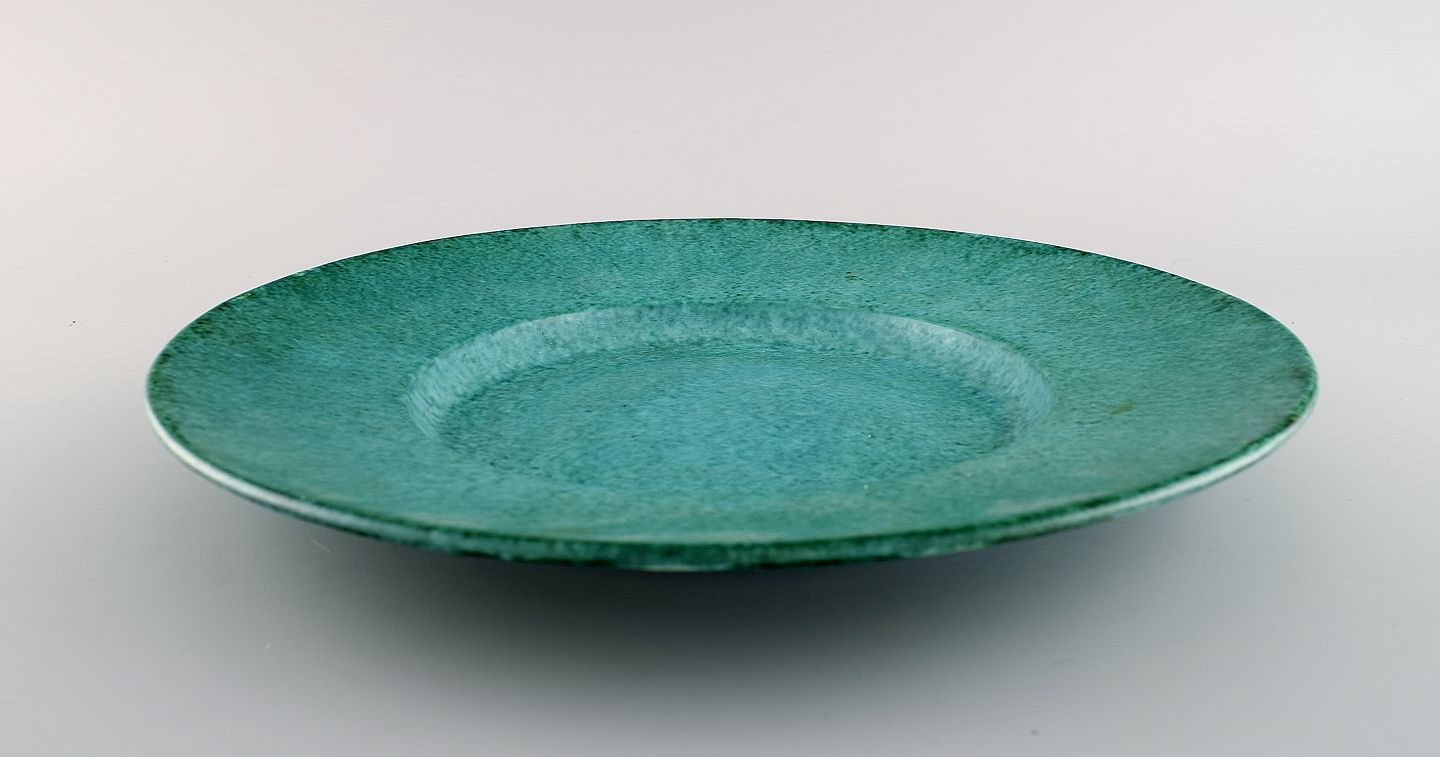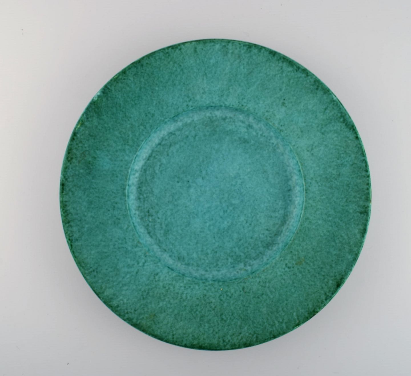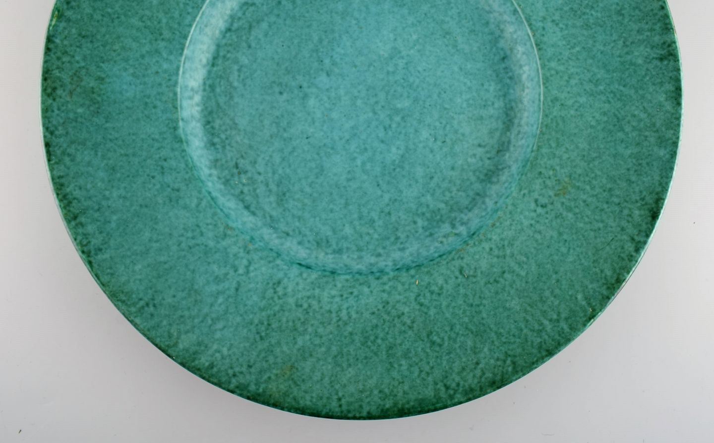 Wilhelm Kåge for Gustavsberg. Argenta art deco fad i glaseret keramik. Smuk glasur i grønne nuancer. 1940´erne. Diameter: 33,5 cm. I flot stand.