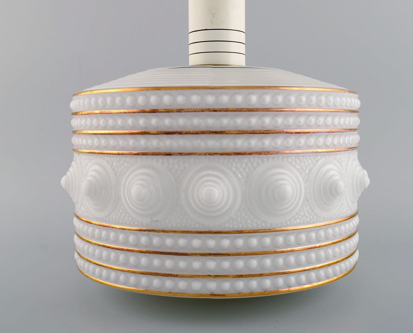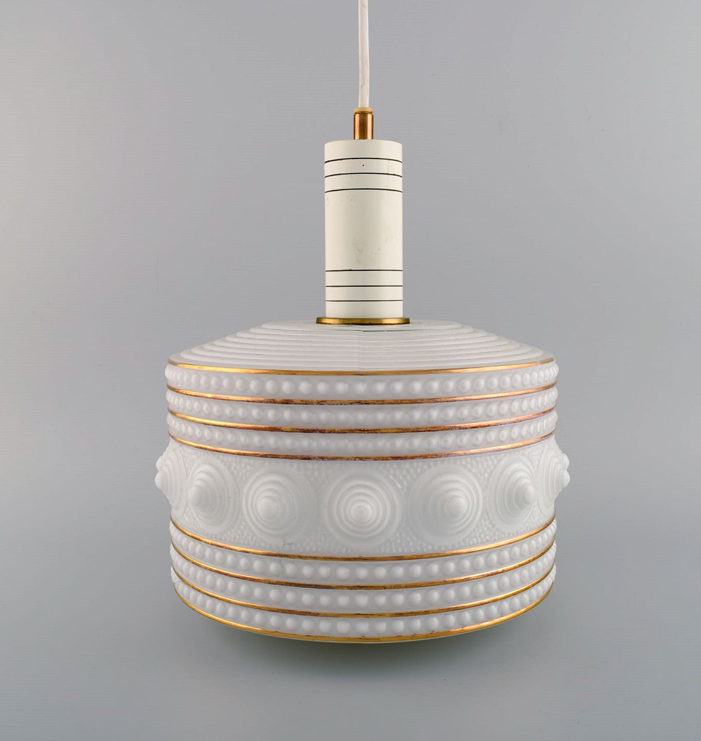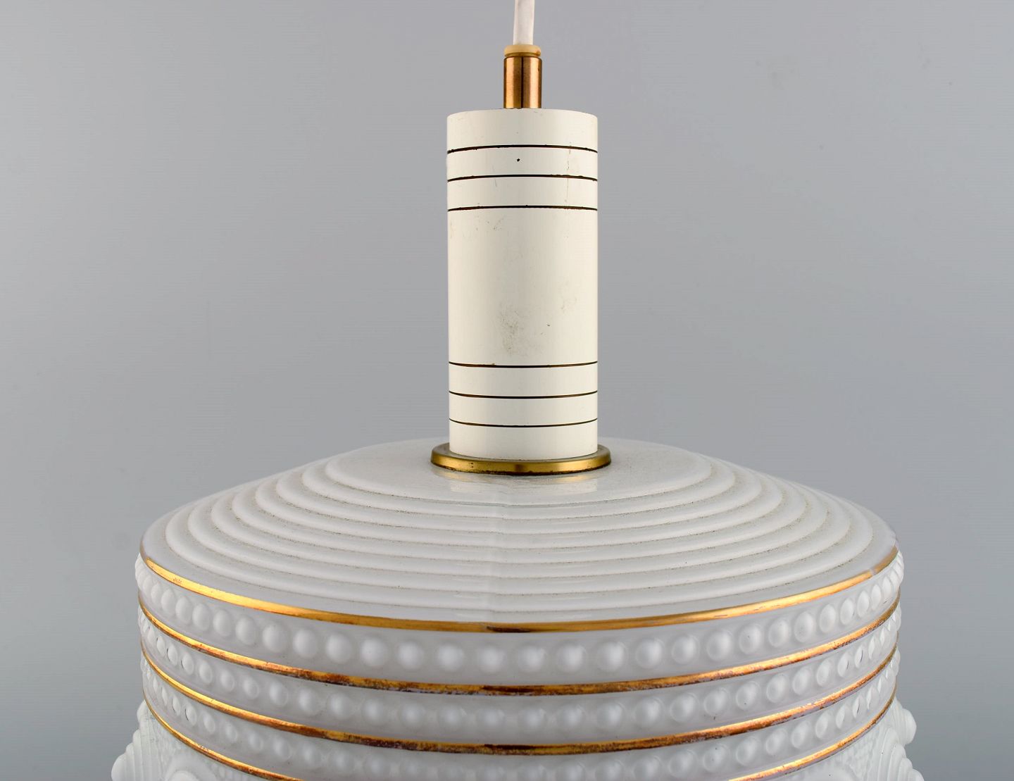 Helena Tynell (b. 1918, d. 2016) for Limburg. Pendant lamp. Brass construction with screen of opaline art glass. Finnish design, 1970s.