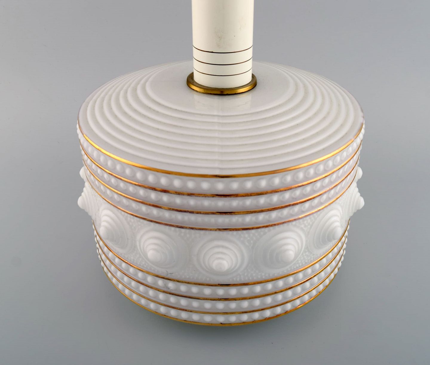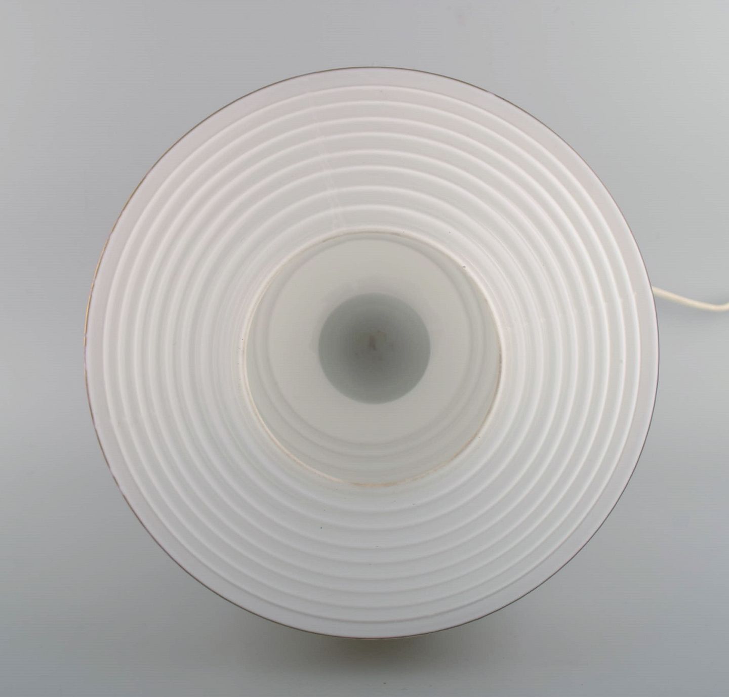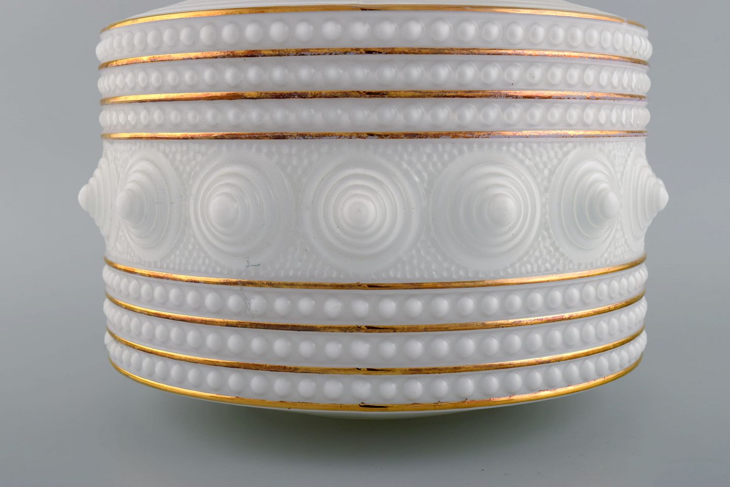 Helena Tynell (b. 1918, d. 2016) for Limburg. Pendant lamp. Brass construction with screen of opaline art glass. Finnish design, 1970s.