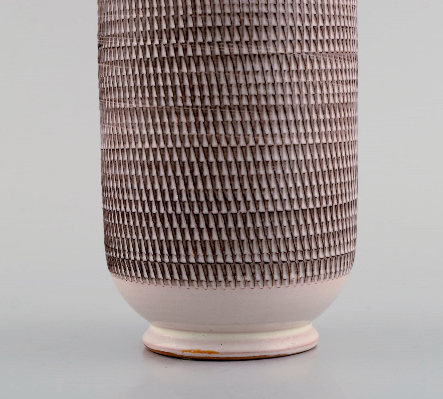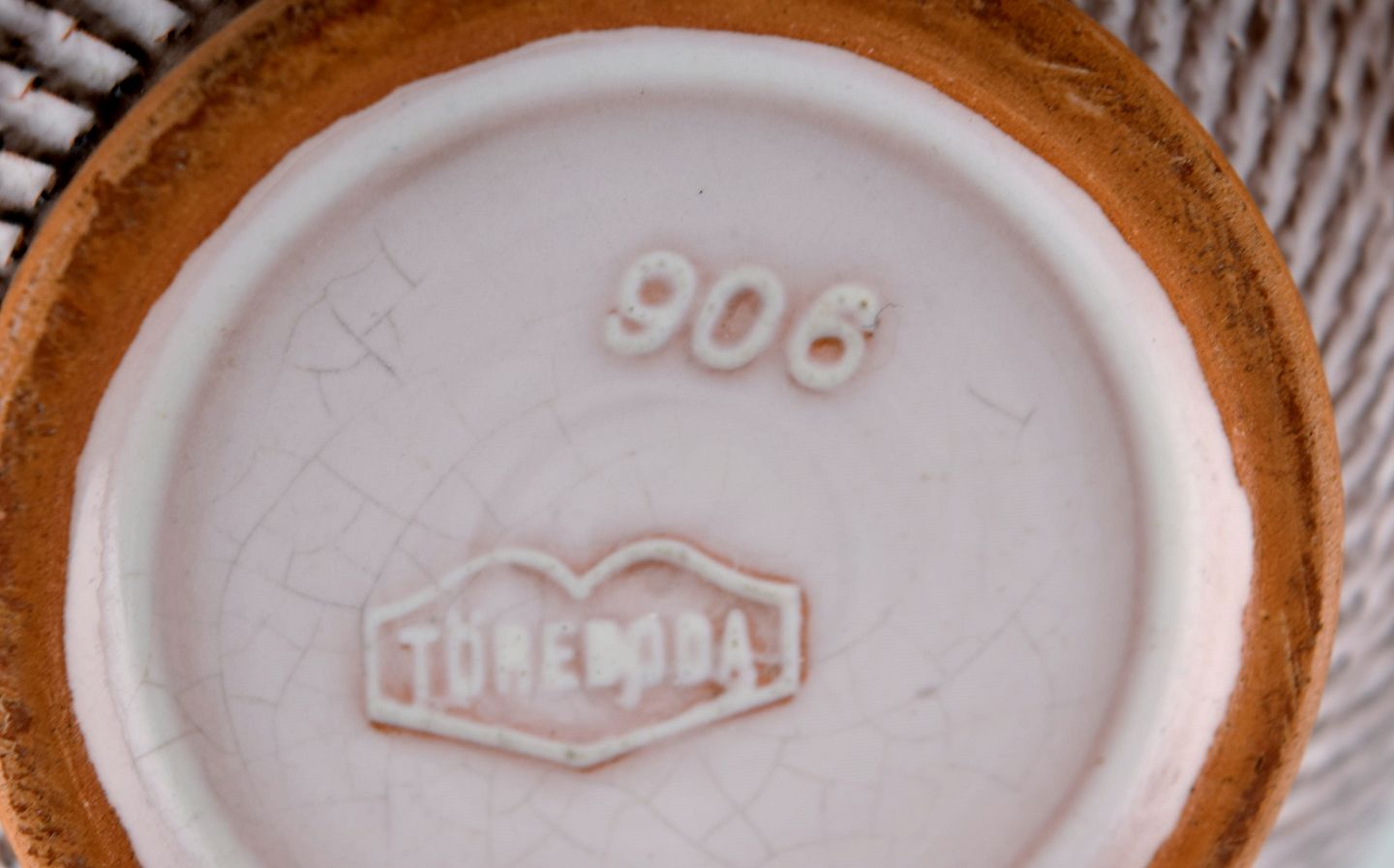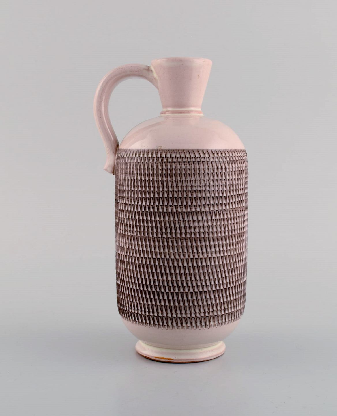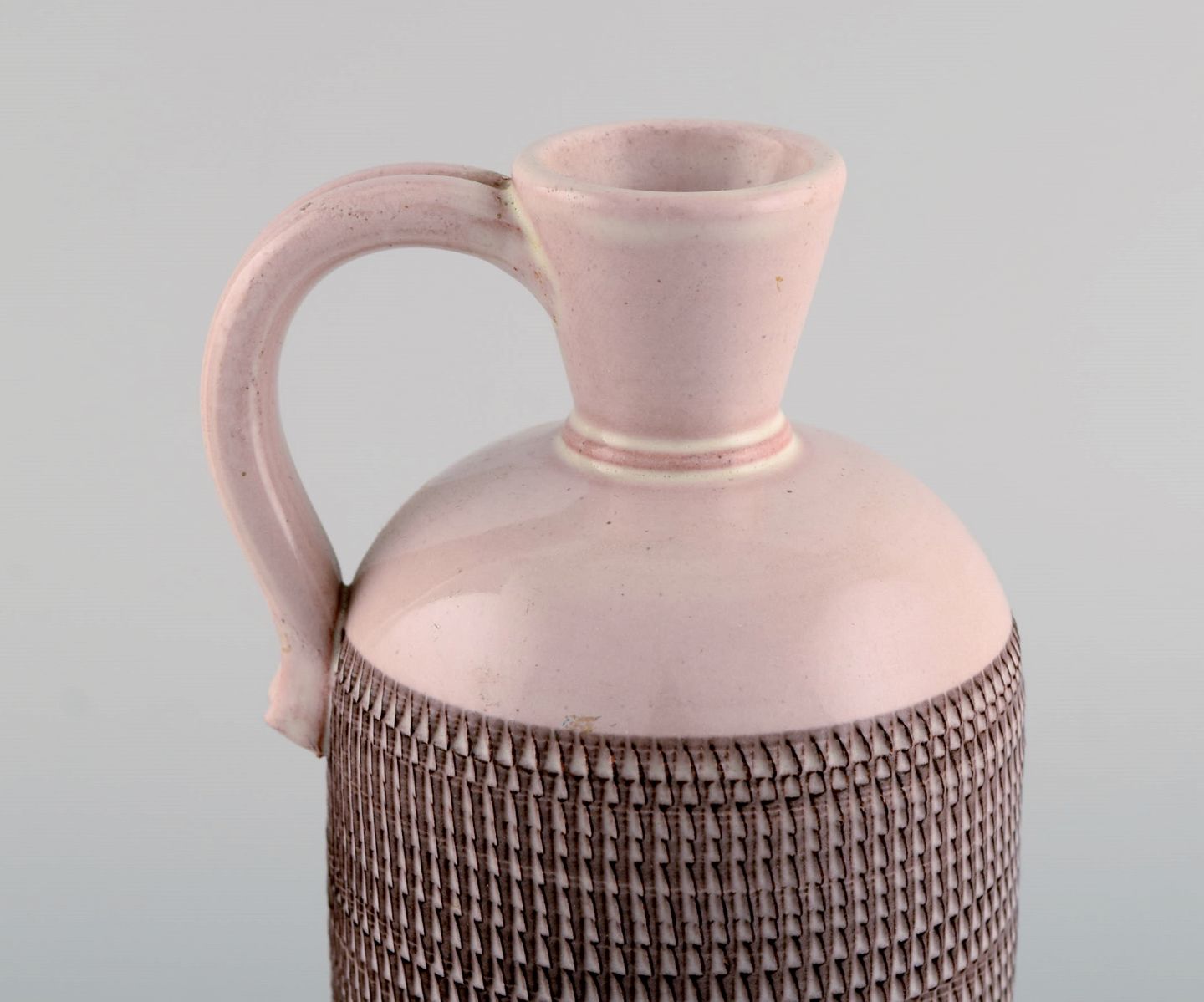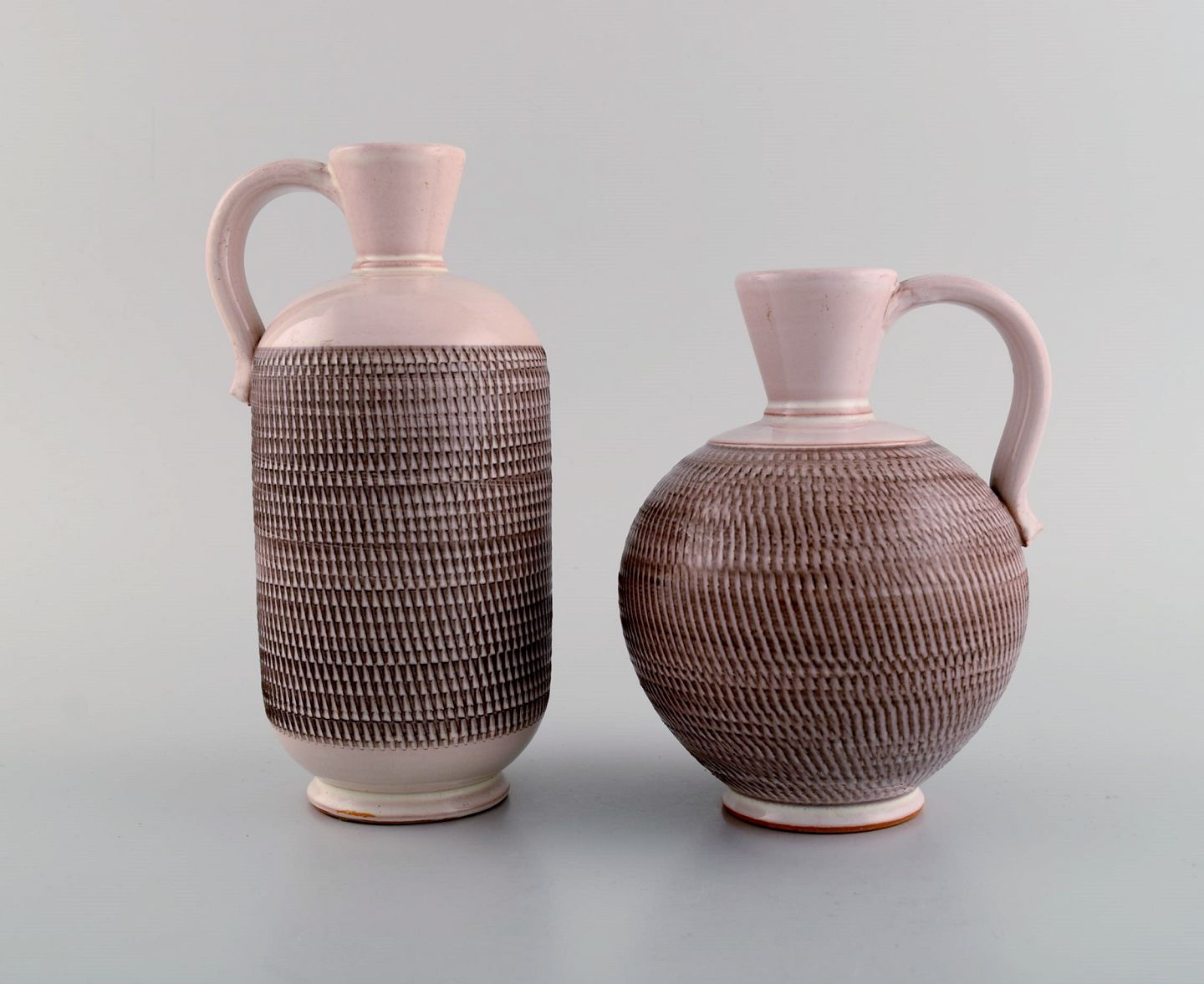 Et par Töreboda vaser med hanke i glaseret keramik. Lyserød pastelfarvet glasur og riflet korpus. Svensk design, midt 1900-tallet. Største måler: 19 x 10 cm. I flot stand. Stemplet.
