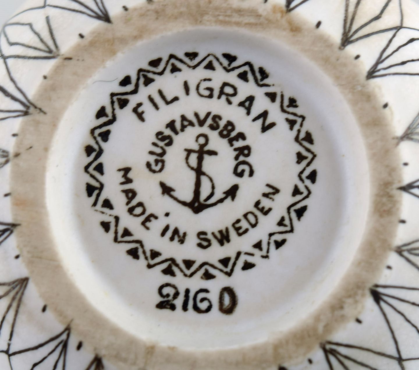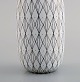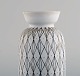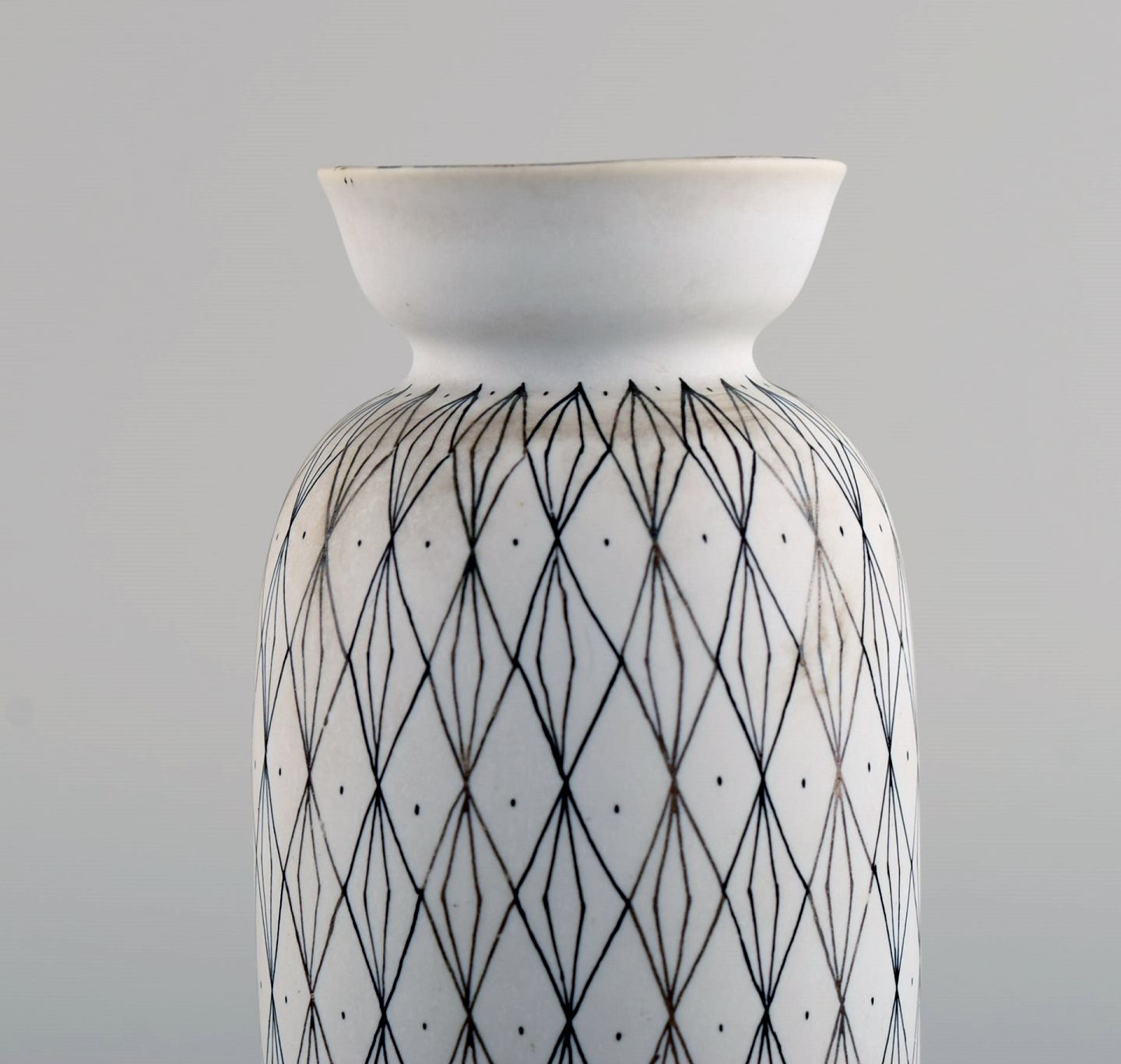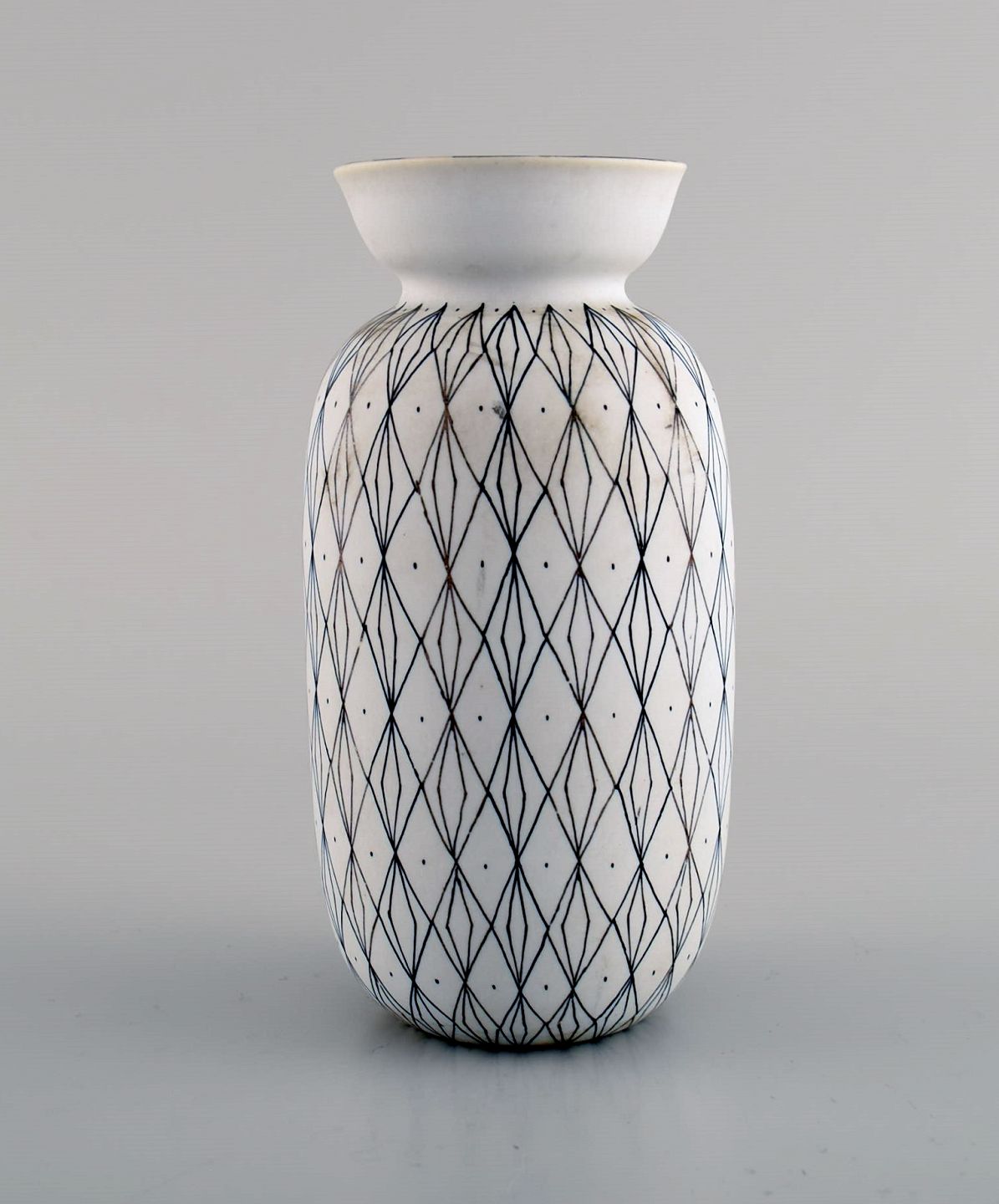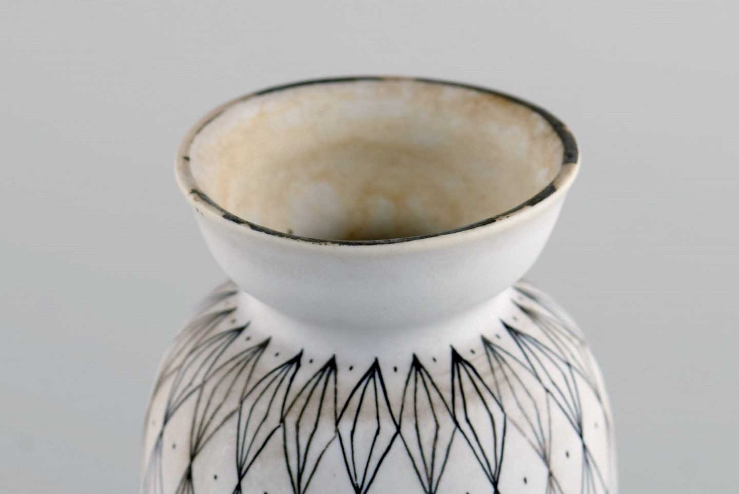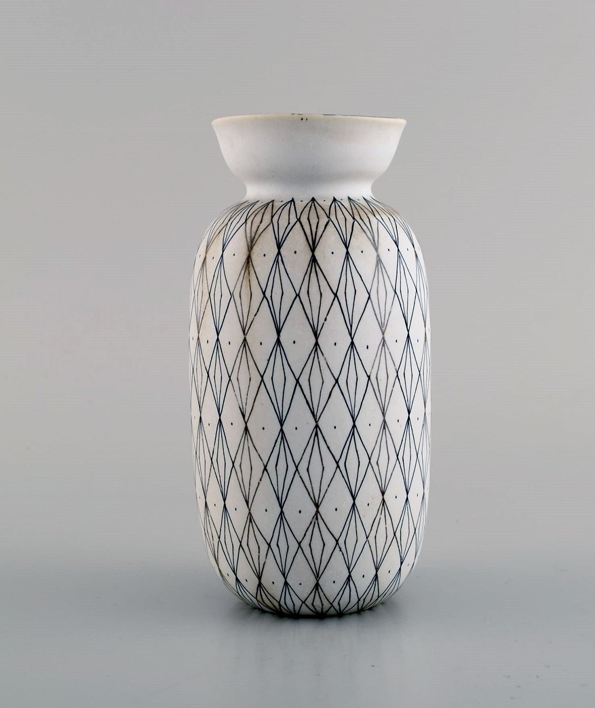 Stig Lindberg for Gustavsberg. Filigran vase i glaseret keramik med håndmalet geometrisk dekoration. Midt 1900-tallet. Måler: 13 x 6,5 cm. I flot stand. Stemplet.