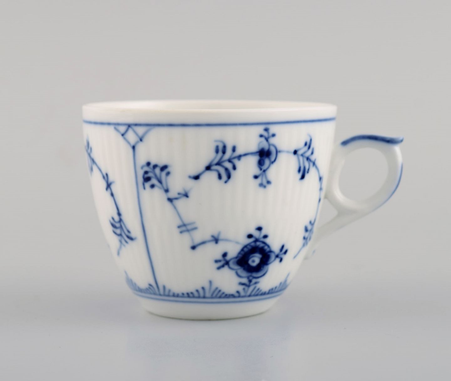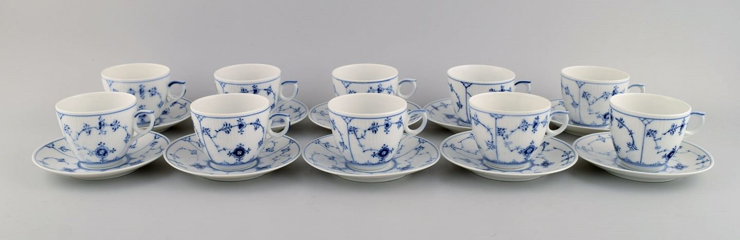 10 Royal Copenhagen Blue Fluted Plain coffee cups with saucers. Model number 1/2162. Dated 1949. The cup measures: 7.5 x 6 cm. Saucer diameter: 13 cm. Stamped. 2nd factory quality.
