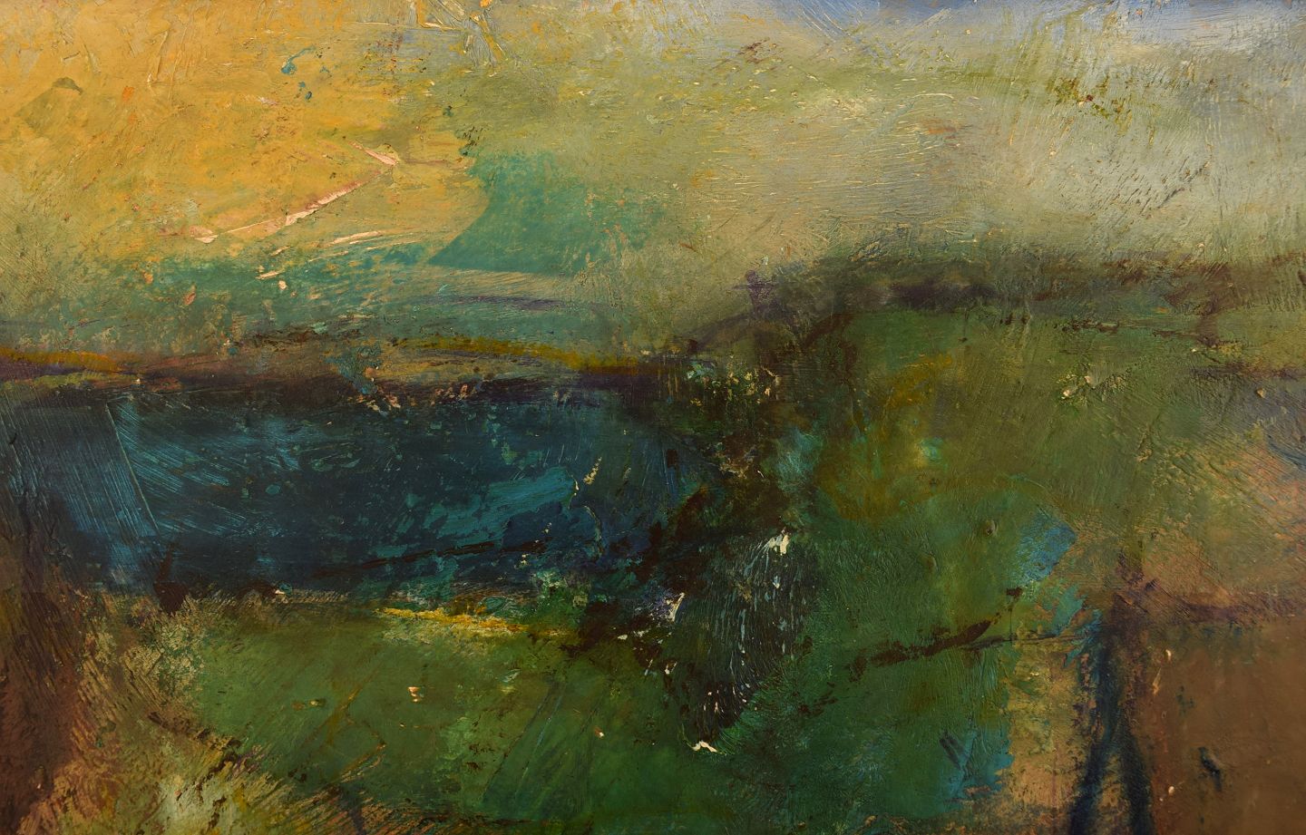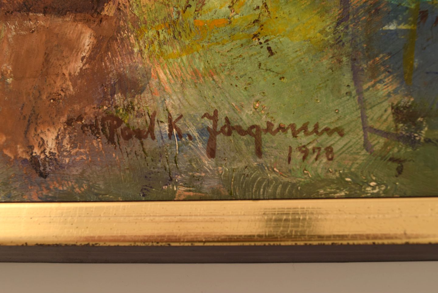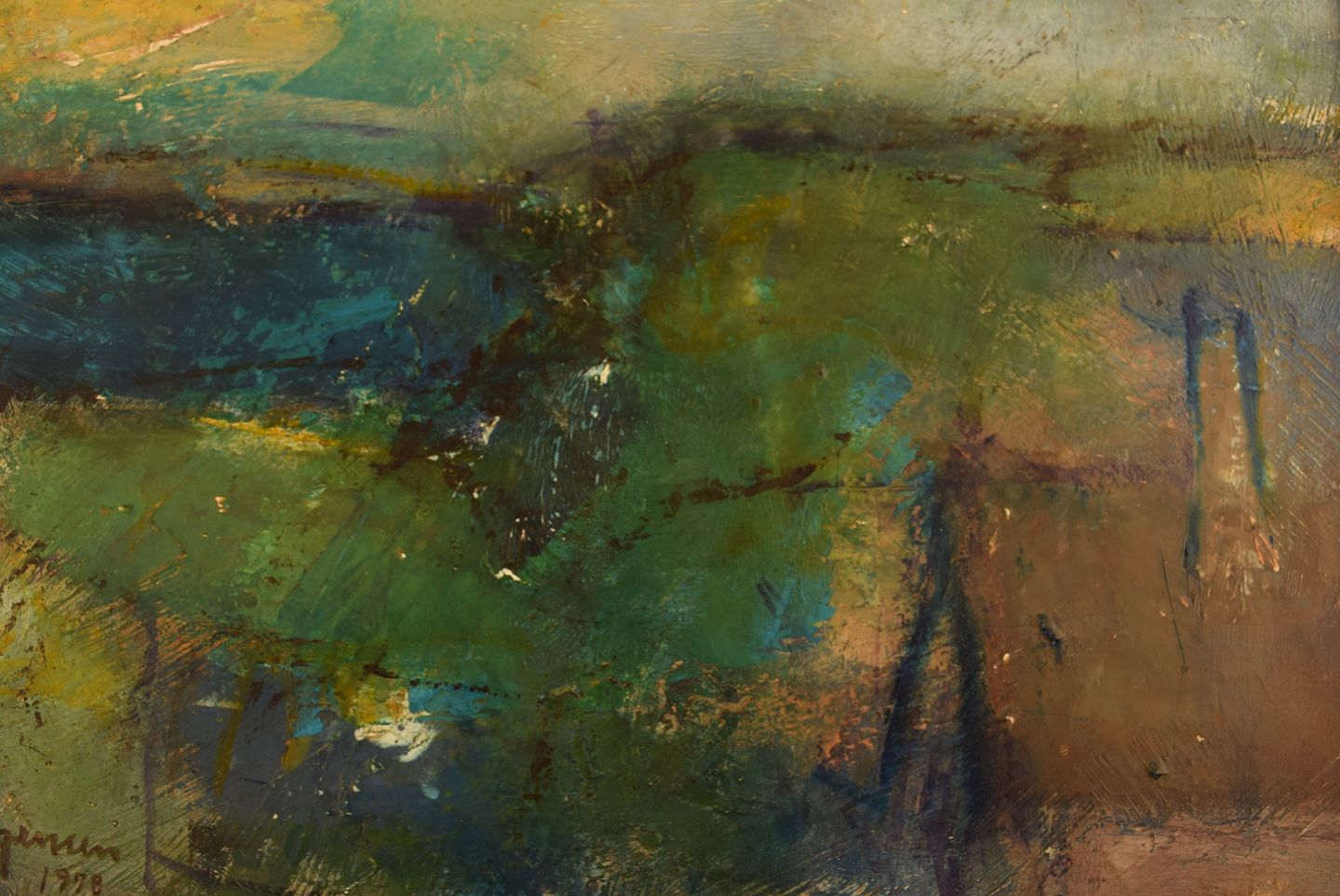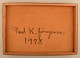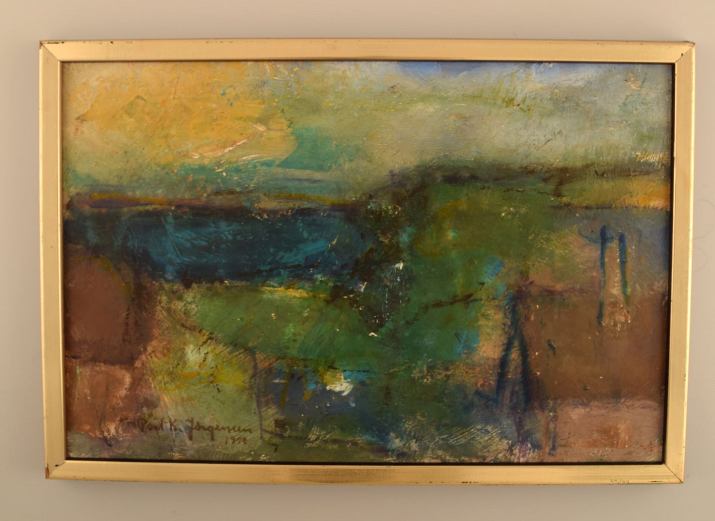 Poul K. Jørgensen, Danmark. Olie på plade. Abstrakt landskab. Dateret 1978. Pladen måler: 44 x 29 cm. Rammen måler: 2,5 cm. Signeret. I flot stand.
