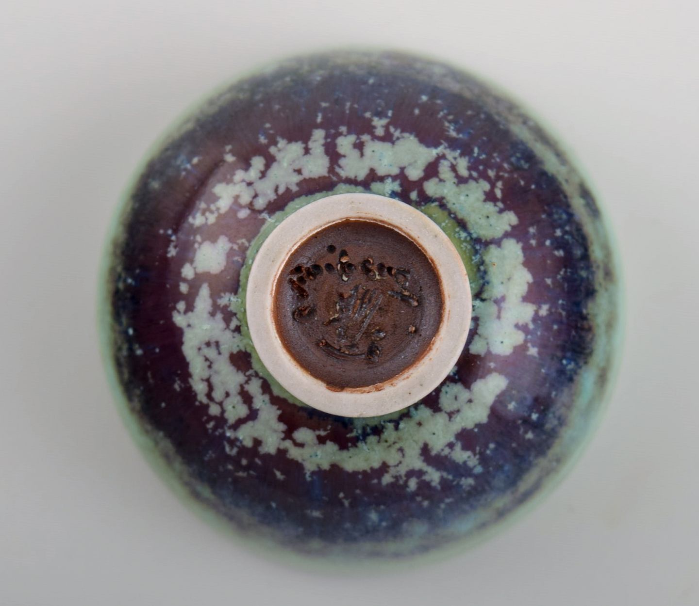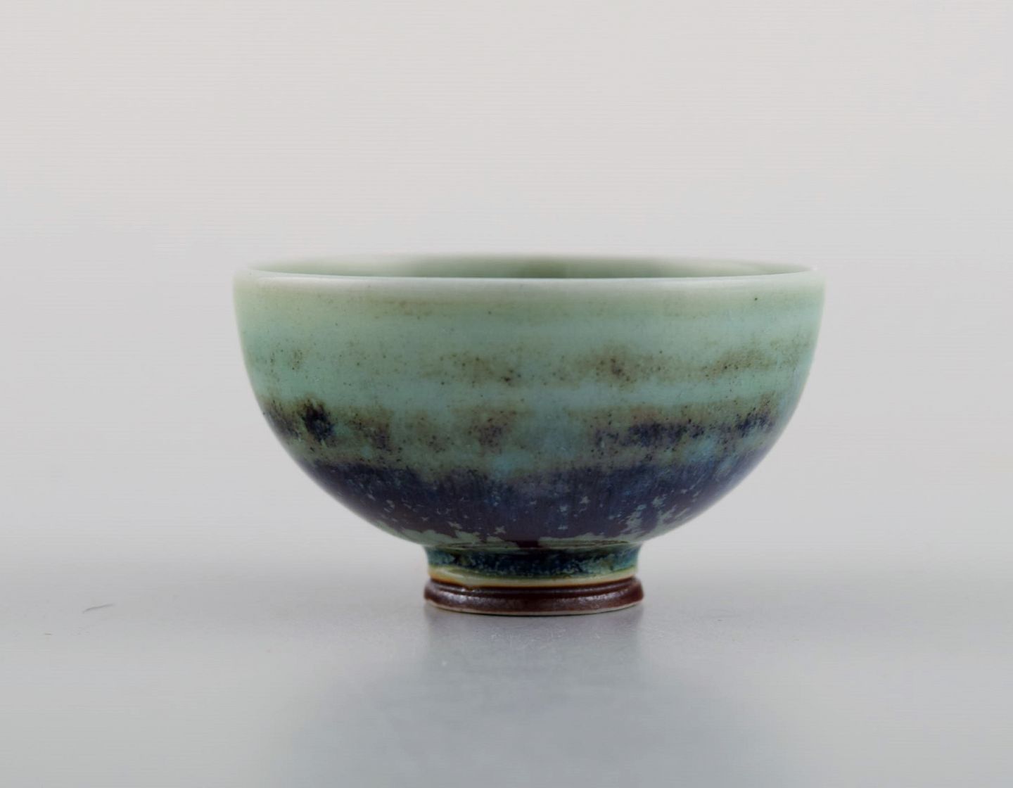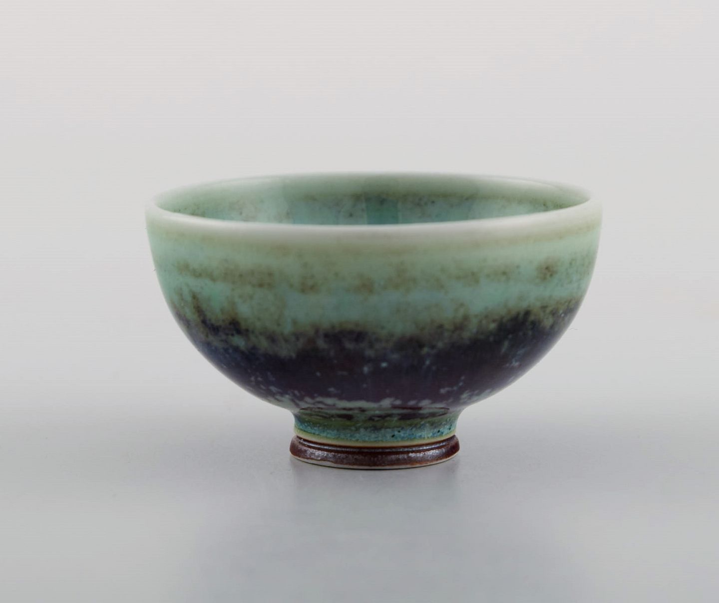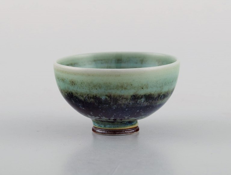 Berndt Friberg (1899-1981) for Gustavsberg Studiohand. Miniature skål i glaseret stentøj. Smuk Aniara glasur. Ca. 1970. Måler: 4,7 x 2,8 cm. I flot stand. Signeret.