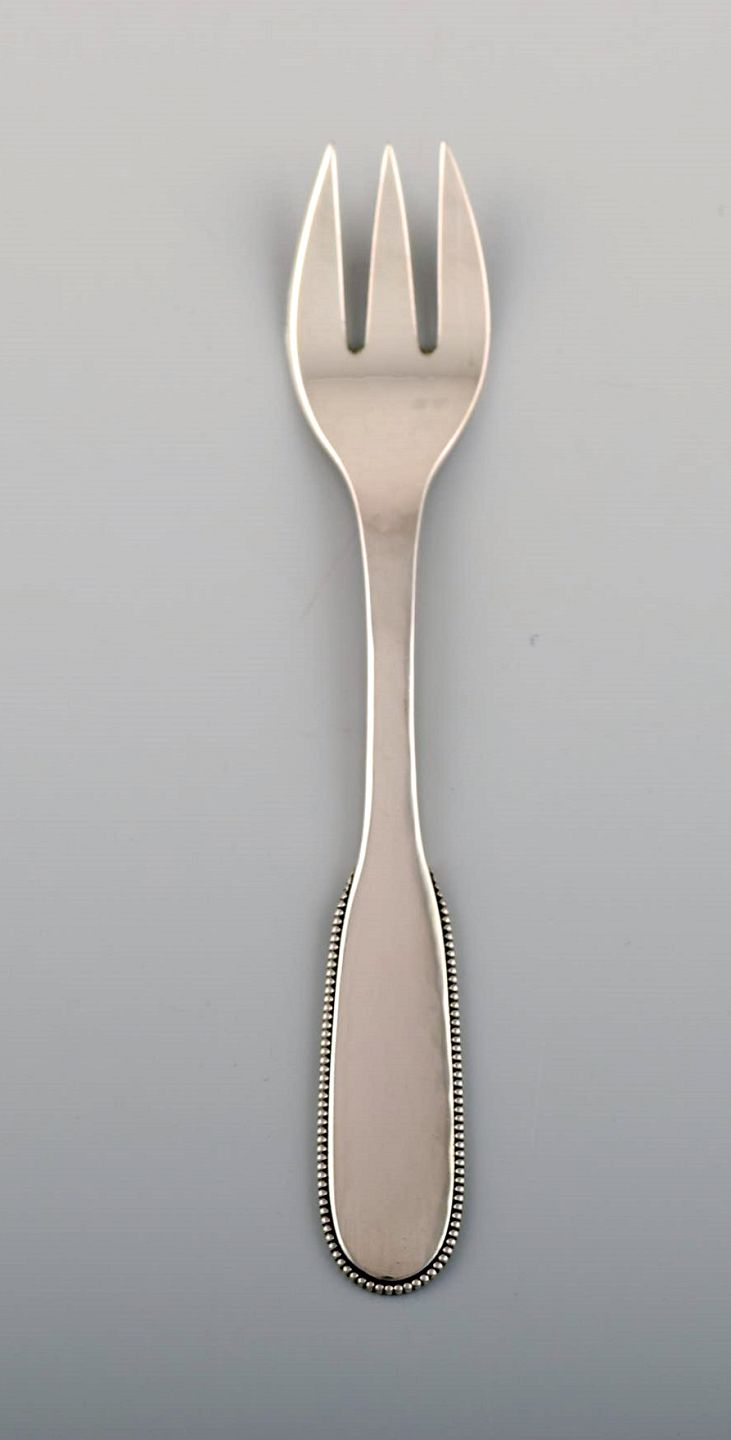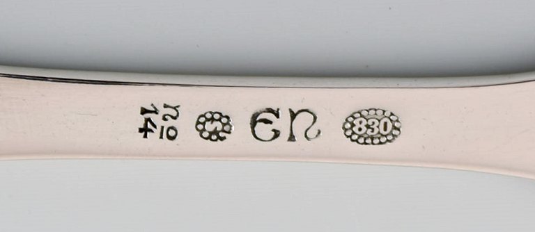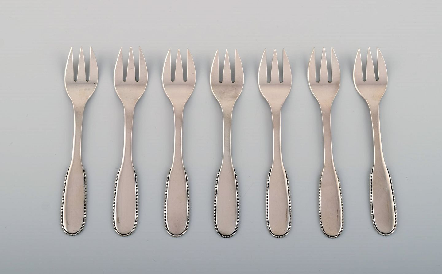 Syv Evald Nielsen nummer 14 kagegafler i hammerslået sølv (830). 1920'erne.
