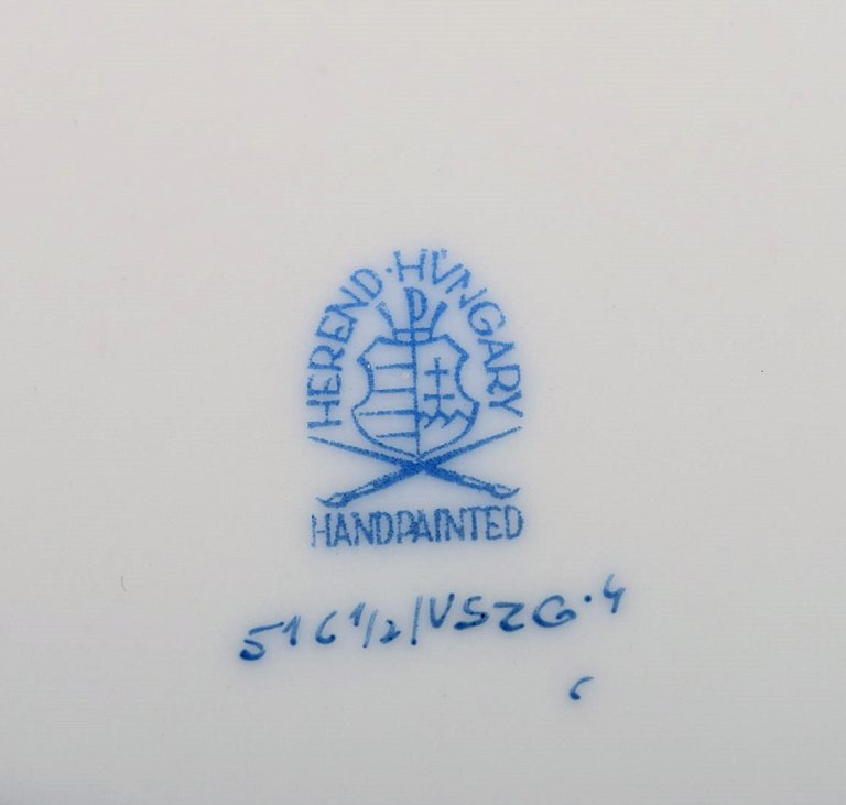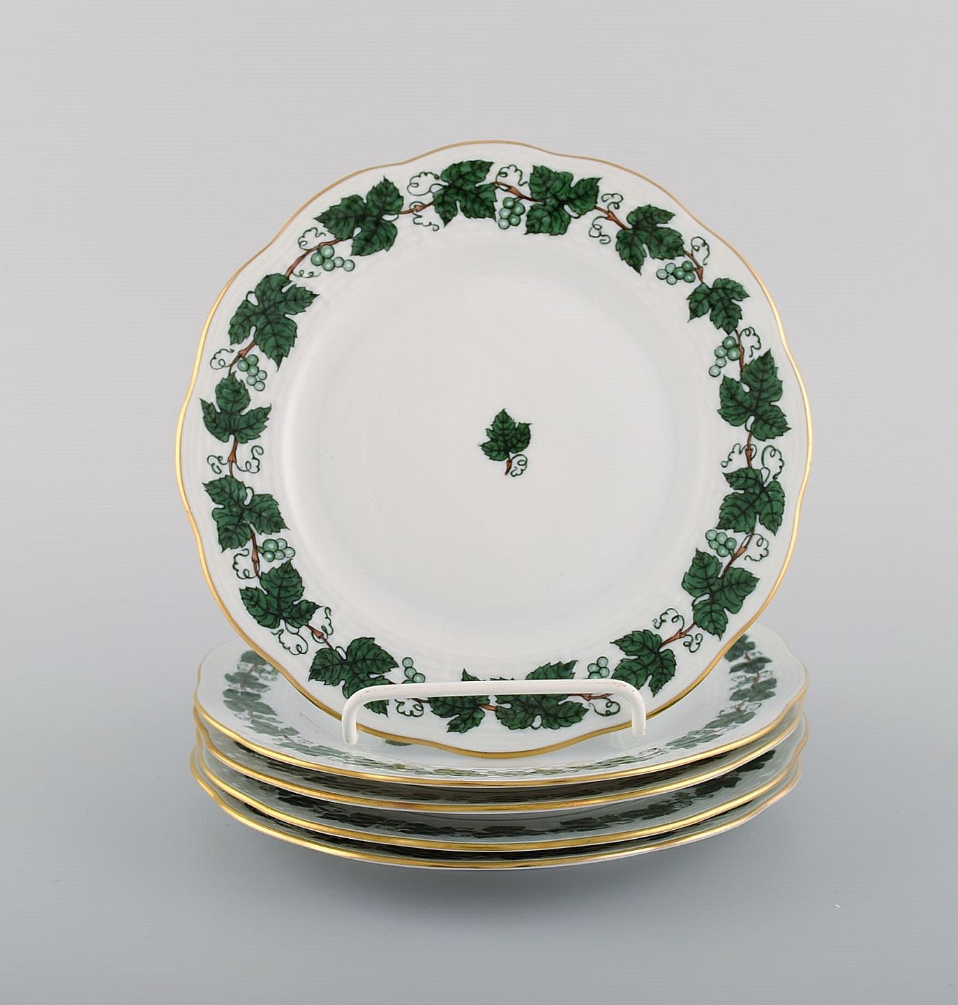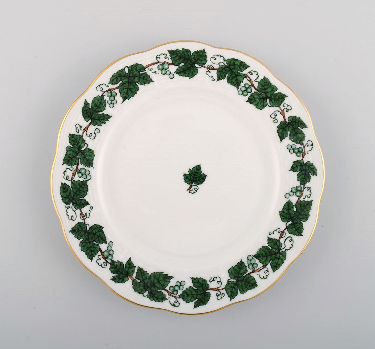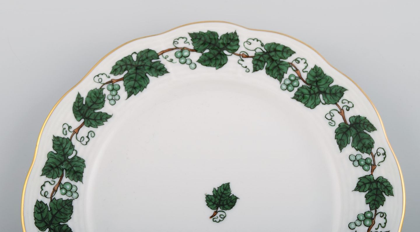 Five Herend Green Grape Leaf & Vine side plates in hand-painted porcelain. Mid-20th century. Diameter: 17 cm. In excellent condition. Stamped.