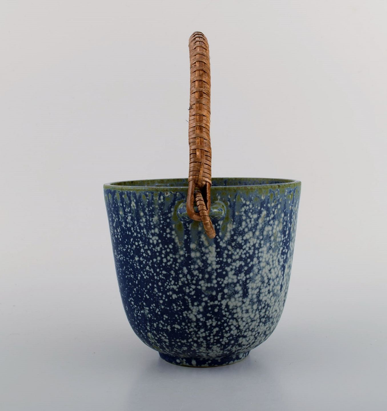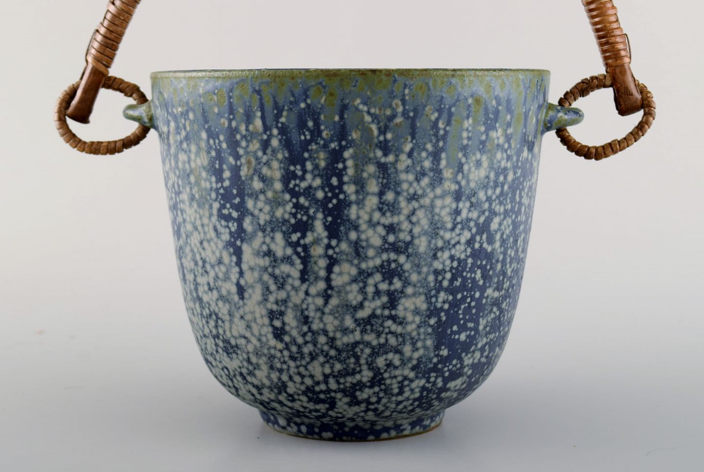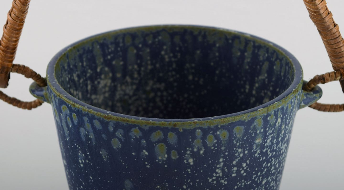 Arne Bang (1901-1983), Denmark. Ice bucket in glazed ceramics with handle in wicker. Model number 15. Beautiful glaze in shades of blue. 1940s / 50s.