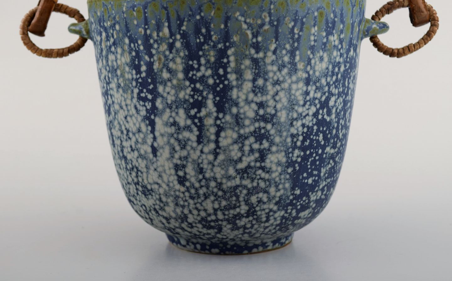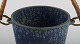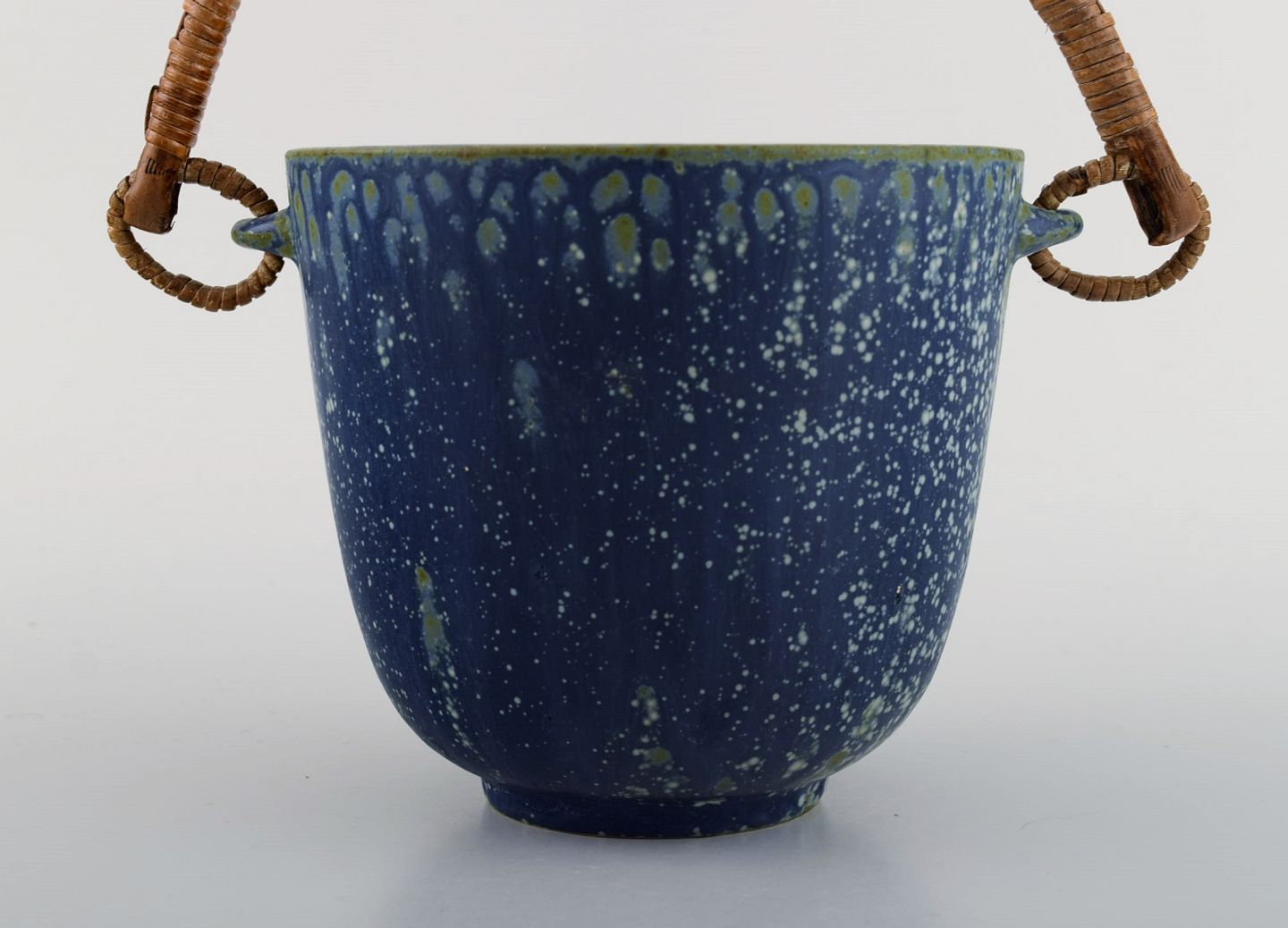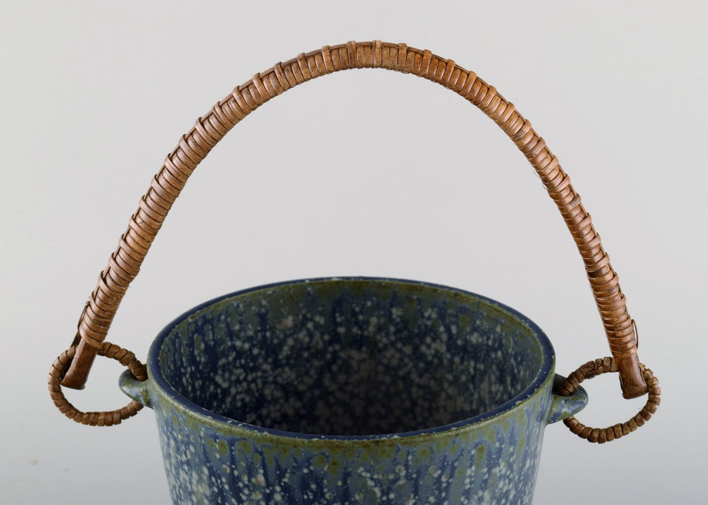 Arne Bang (1901-1983), Denmark. Ice bucket in glazed ceramics with handle in wicker. Model number 15. Beautiful glaze in shades of blue. 1940s / 50s.