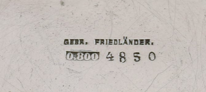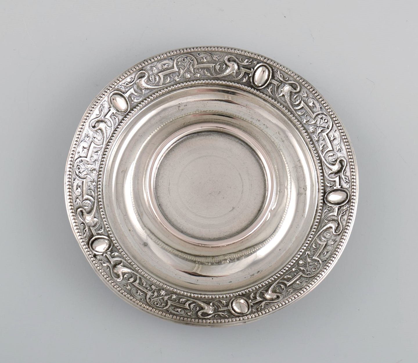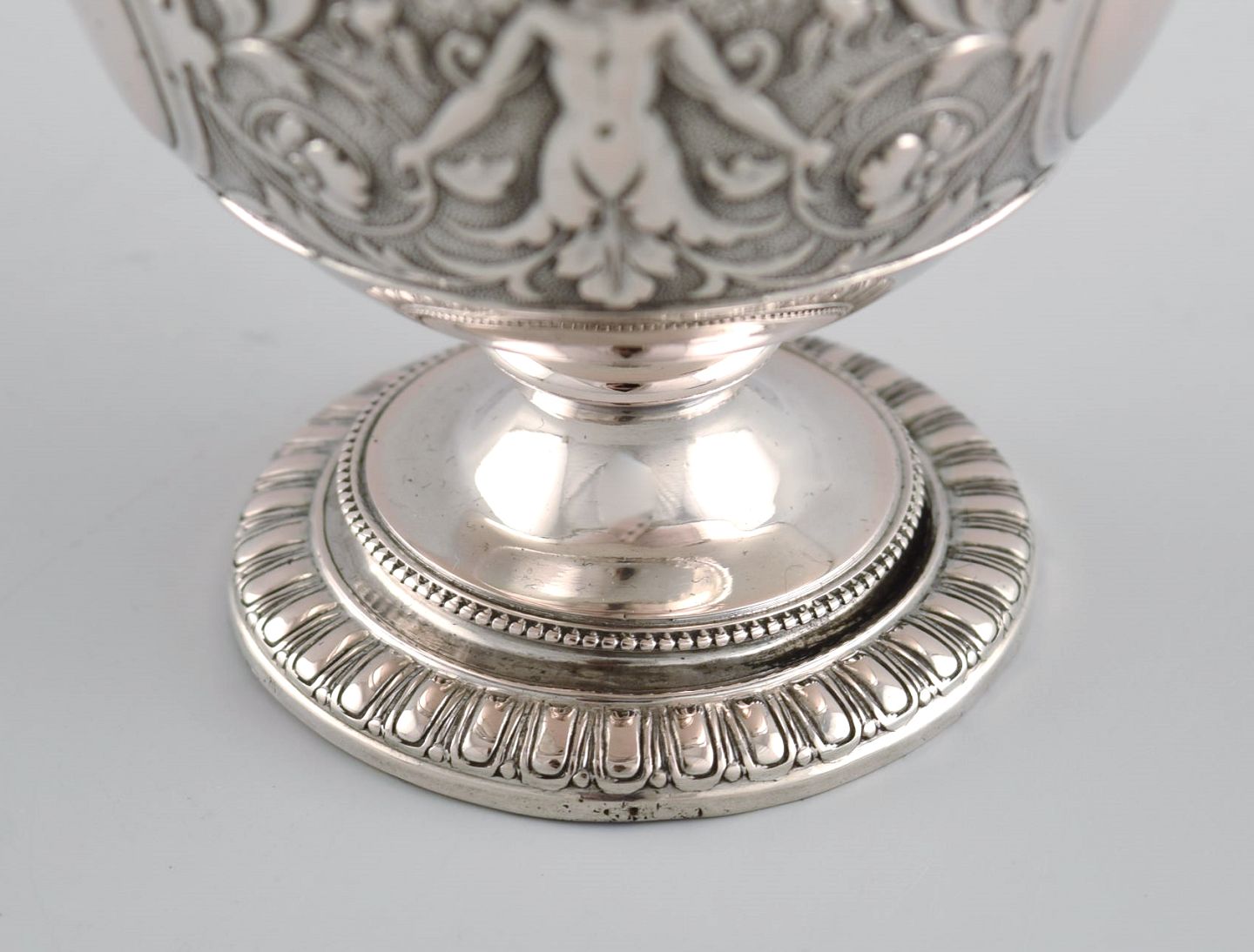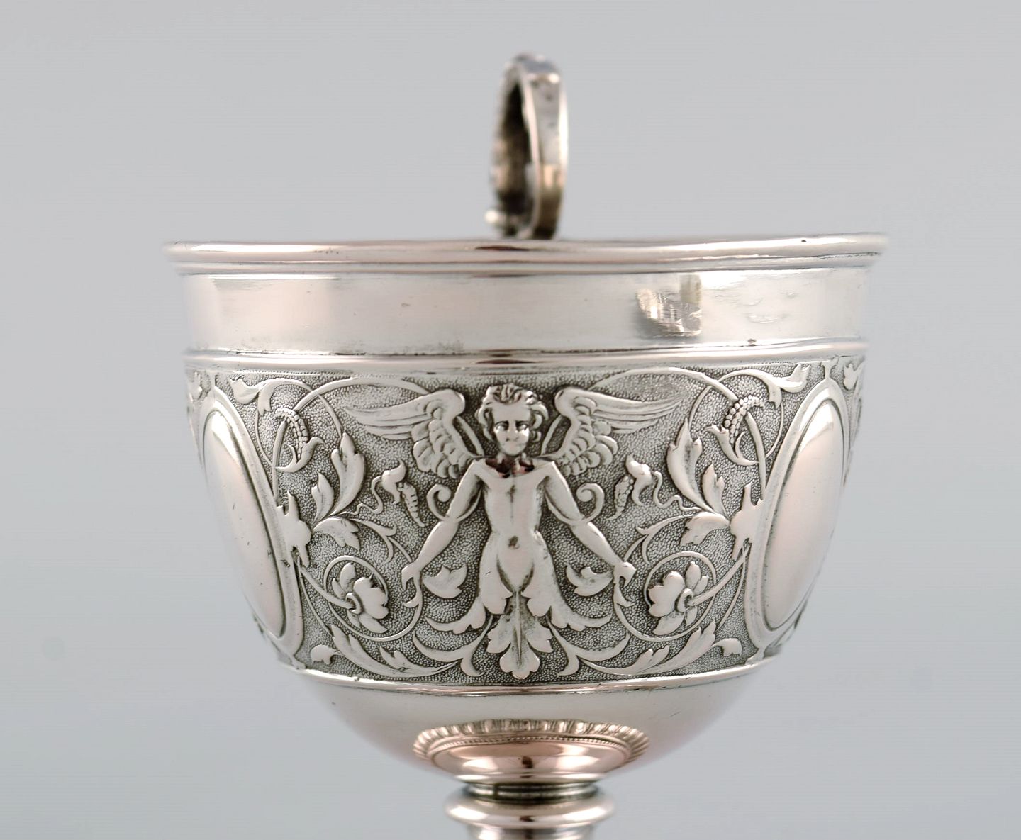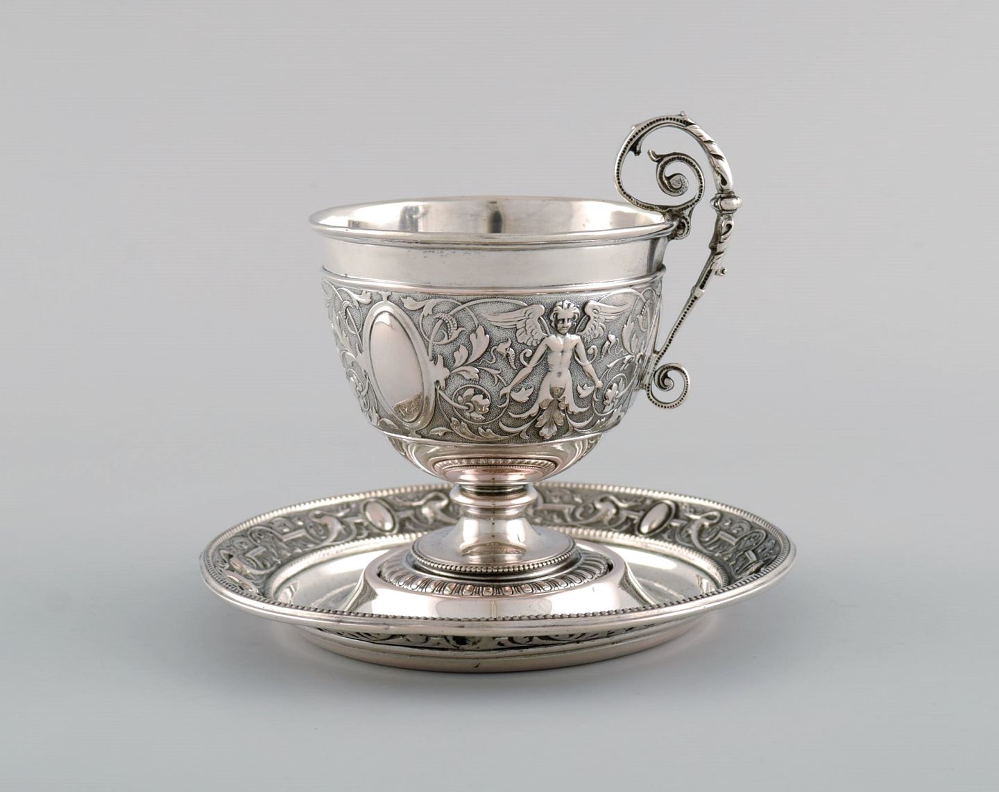 Gebrüder Friedländer, Berlin. Antik kaffekop med underkop i sølv (800) med klassicistiske motiver. Tidligt 1900-tallet. Kopen måler: 10 x 7,5 cm. Underkoppen måler: 13 cm. Stemplet. I flot stand.