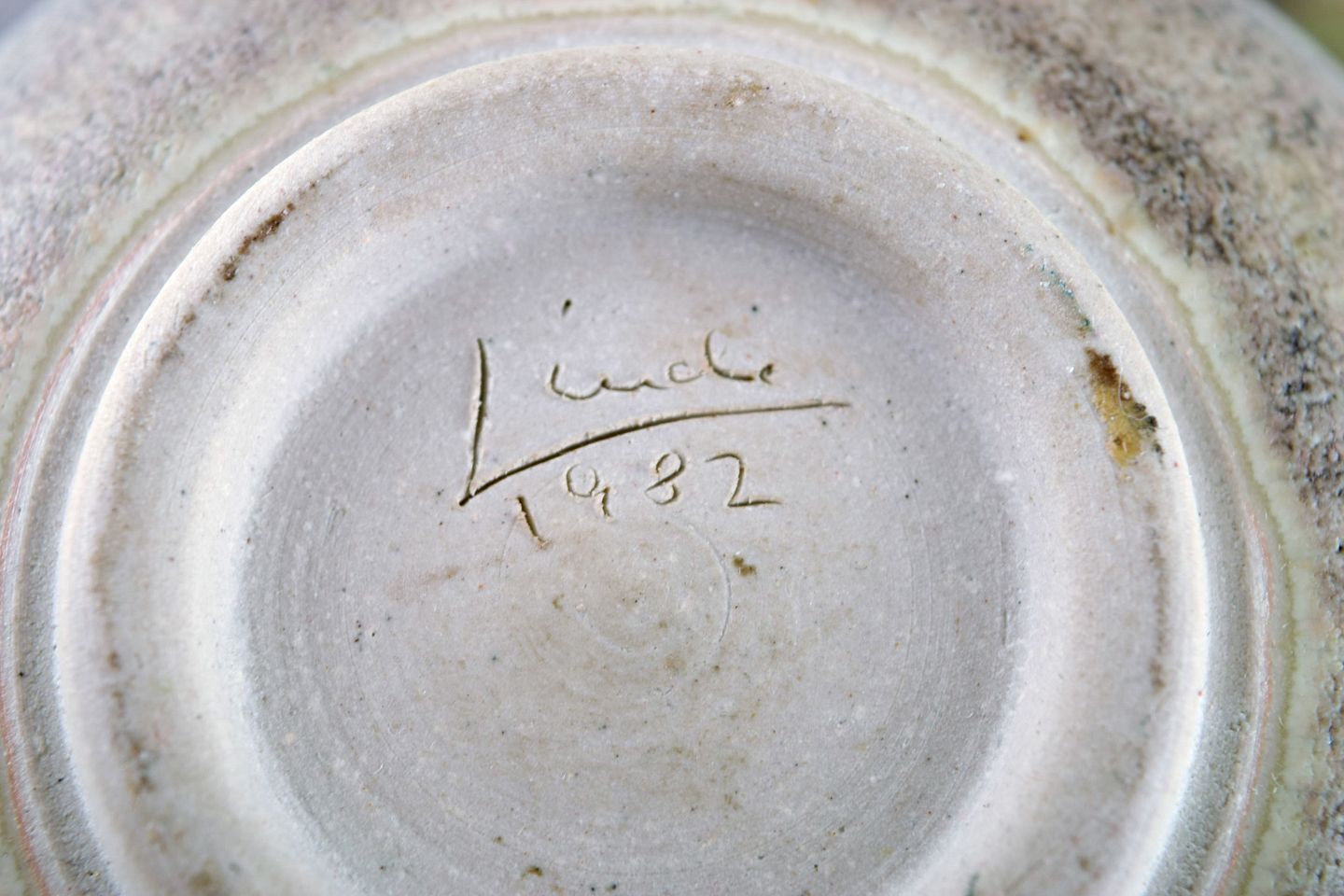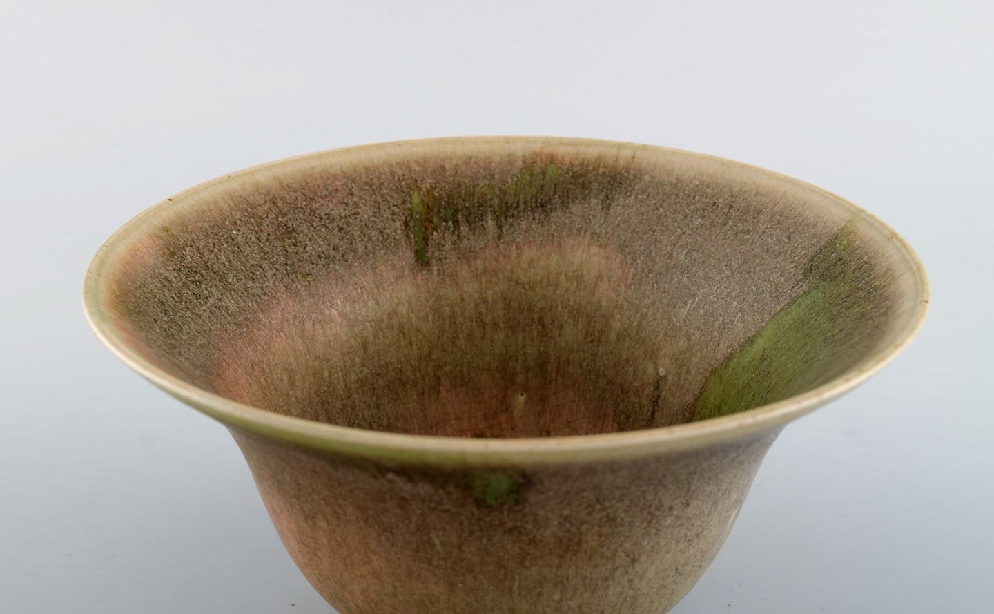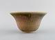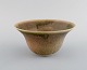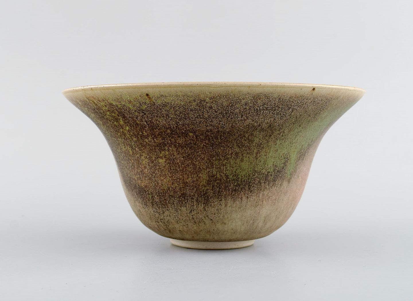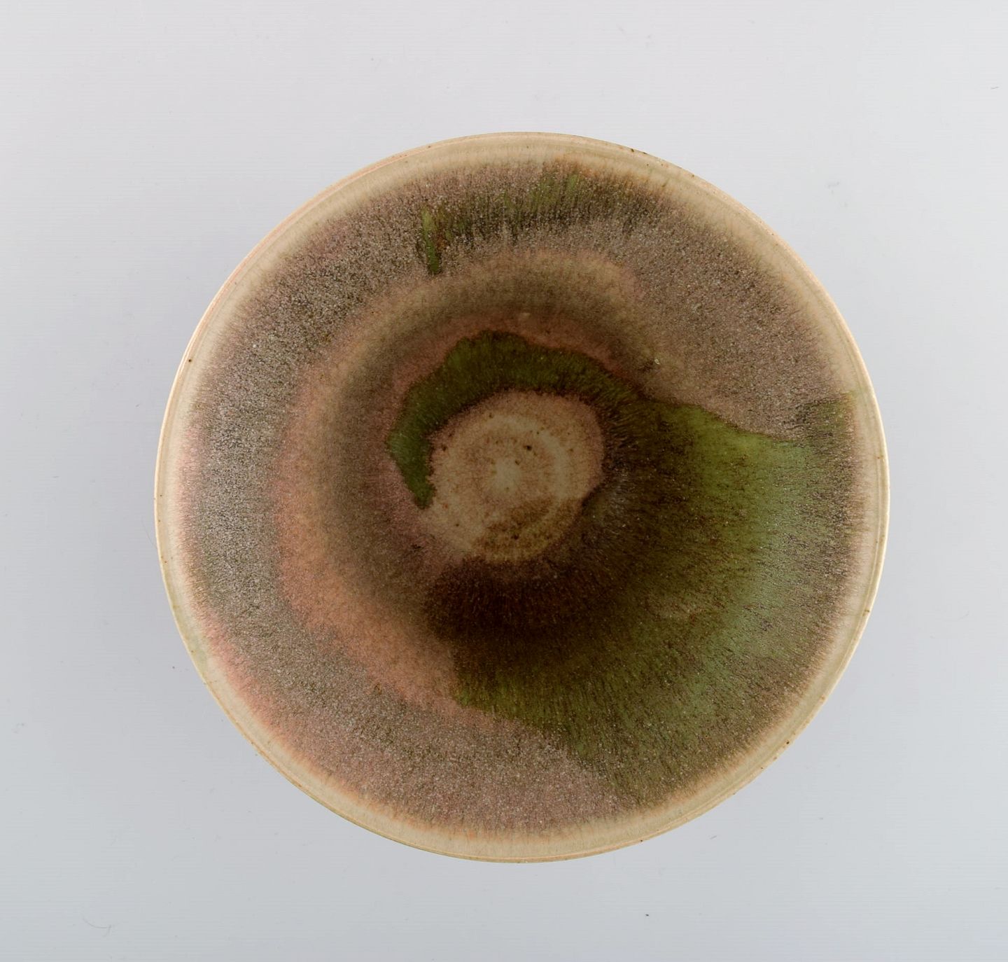 European studio ceramicist. Unique bowl in glazed stoneware. Beautiful glaze in green and light earth shades. Dated 1982. Measures: 17.5 x 9 cm. In excellent condition. Signed.