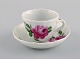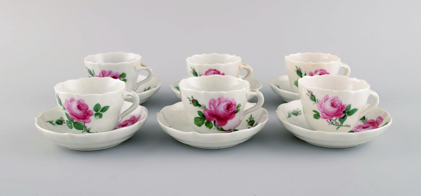 Six antique Meissen coffee cups with saucers in hand-painted porcelain with pink roses. Ca. 1900. The cup measures: 6.5 x 5 cm. Saucer diameter: 10.5 cm. In excellent condition. Stamped. 2nd factory quality.