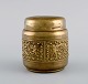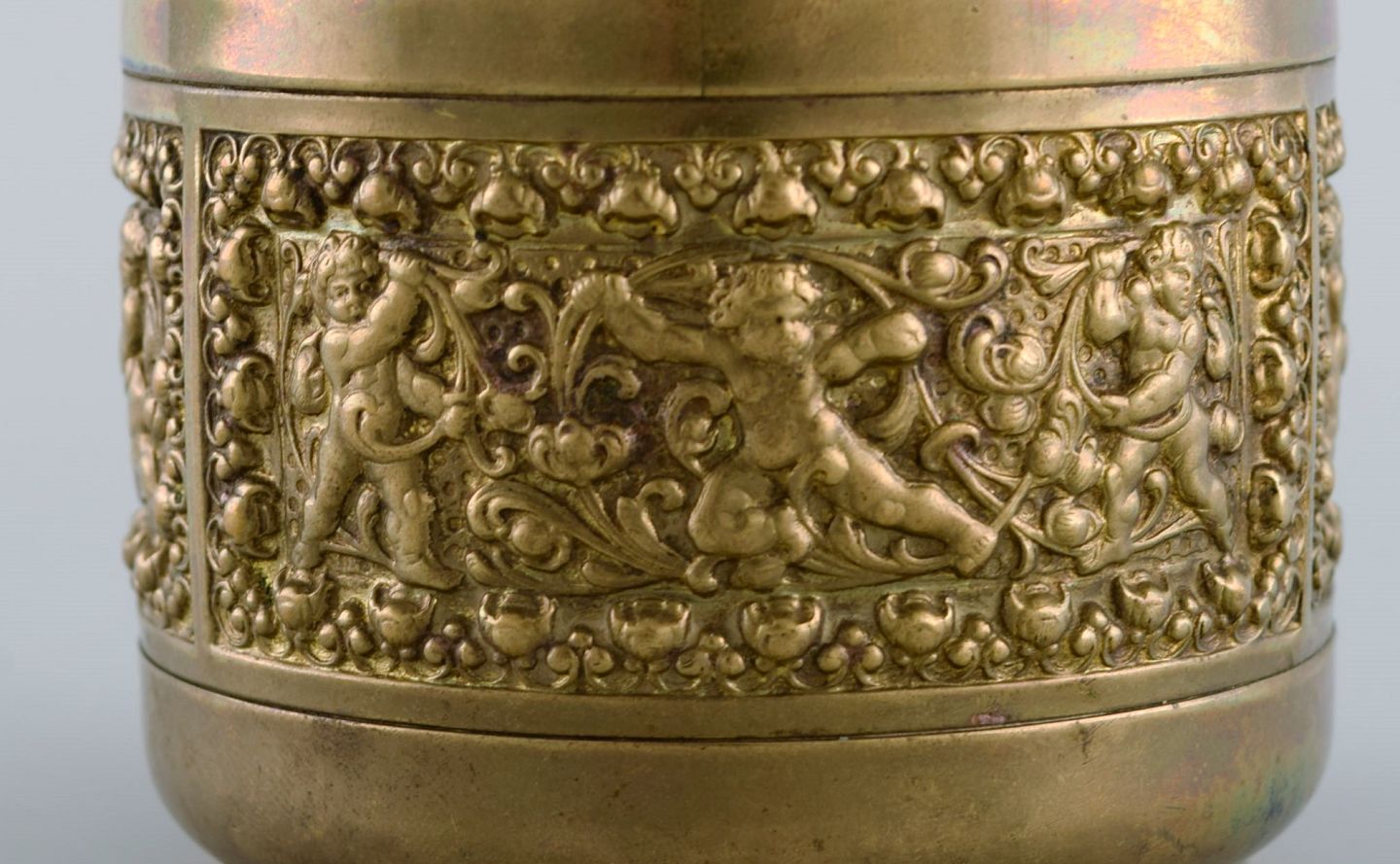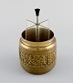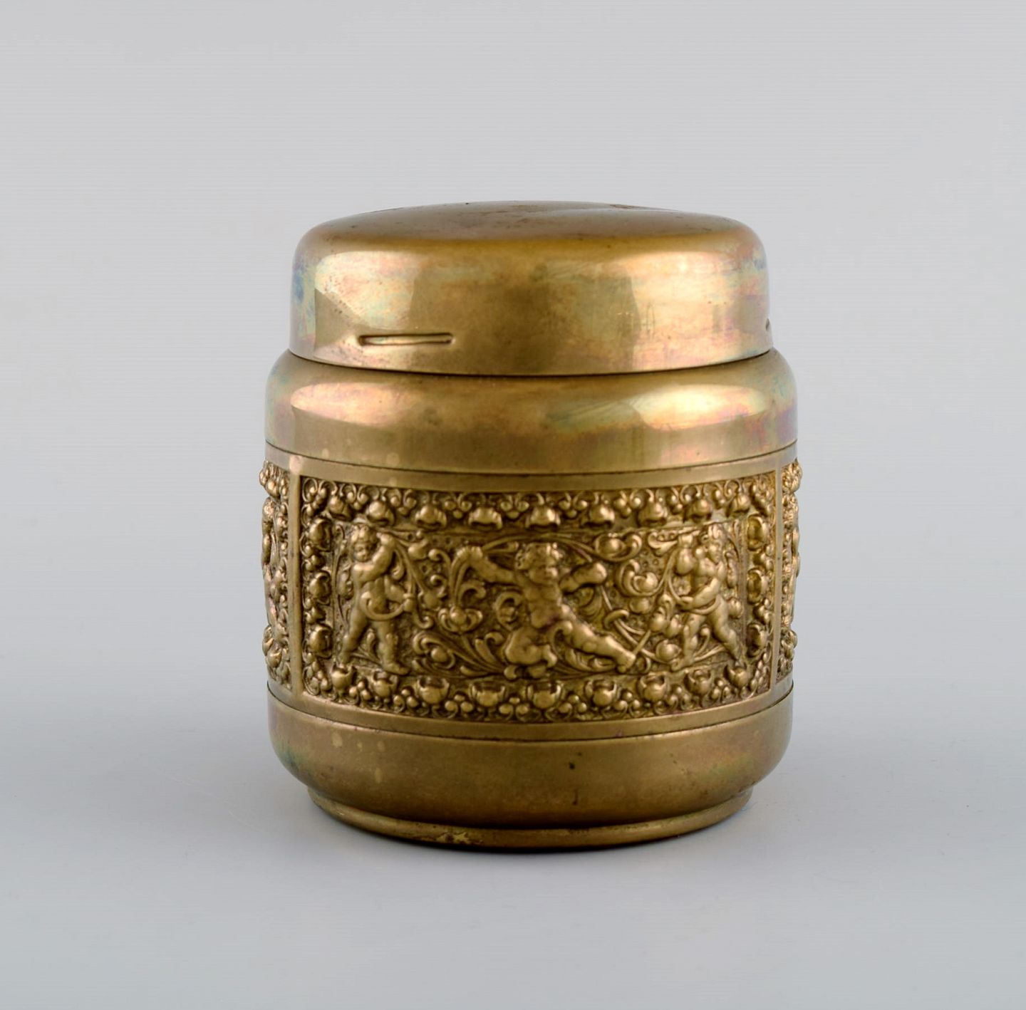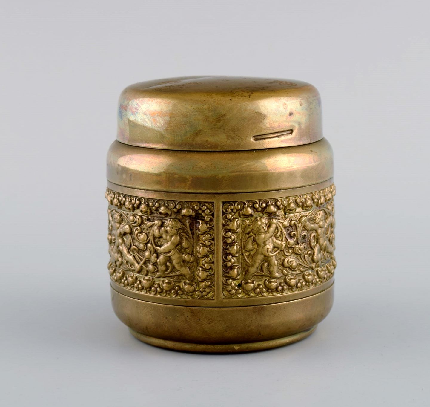 Brass cigarette container with classicist scenes. Mid-20th century. Measures: 9.5 x 9 cm. In excellent condition. Stamped.