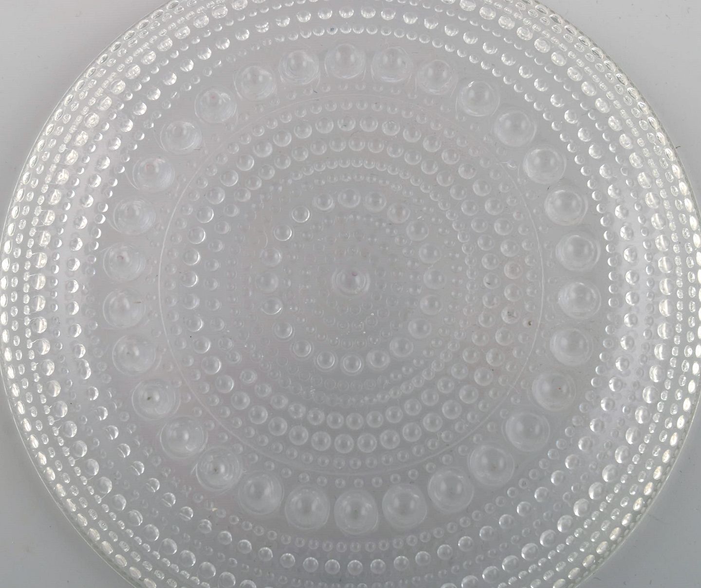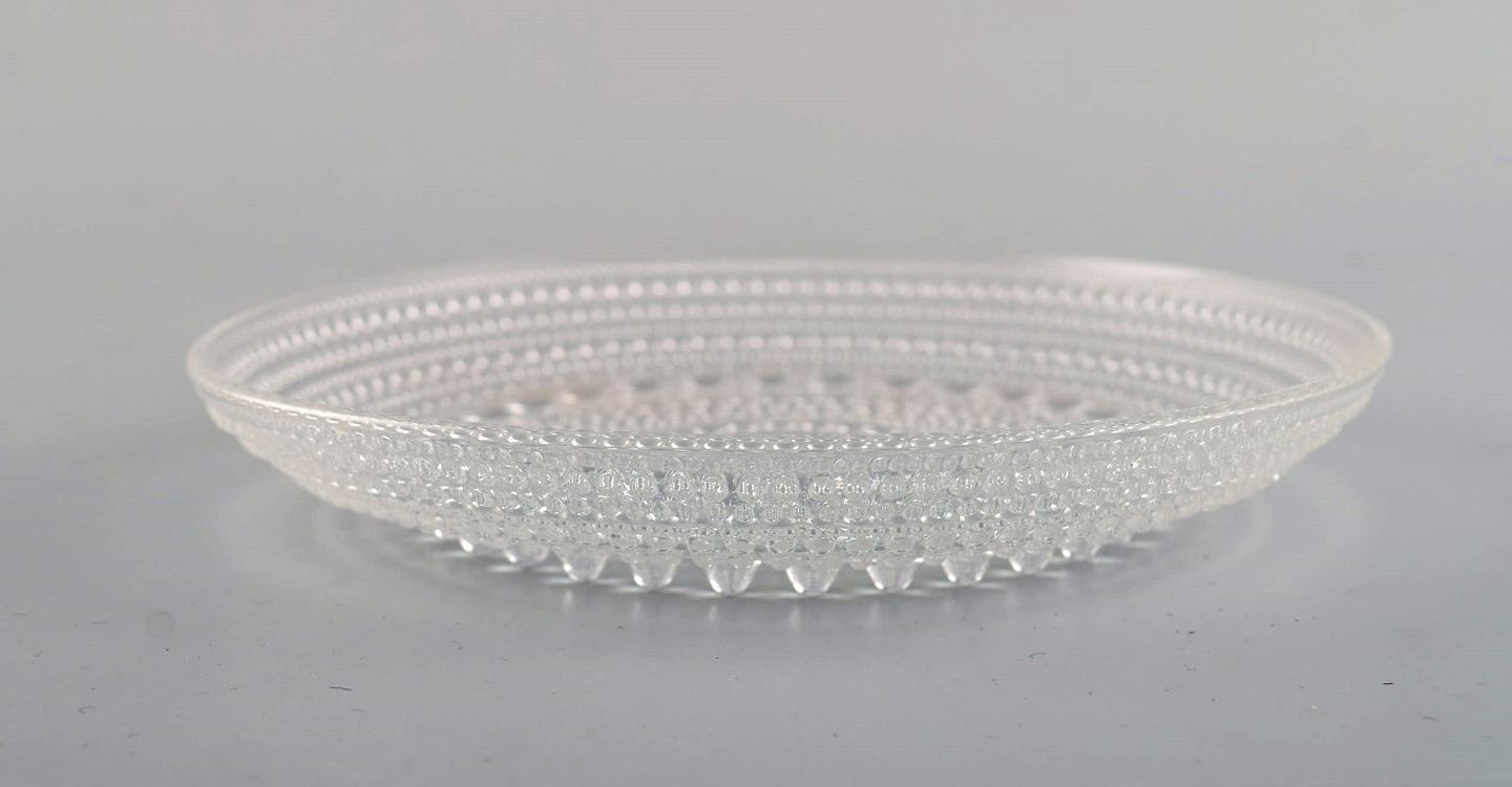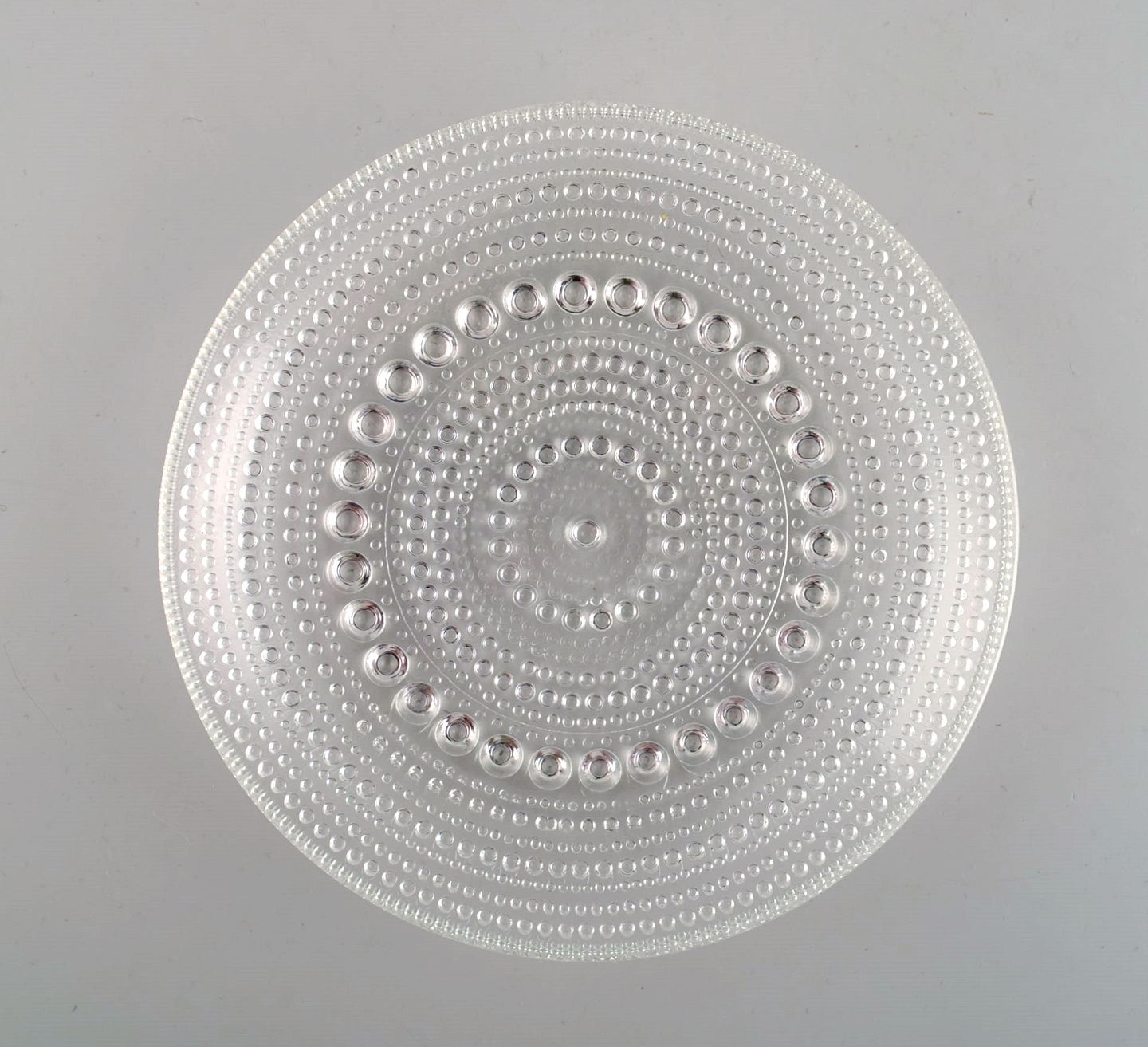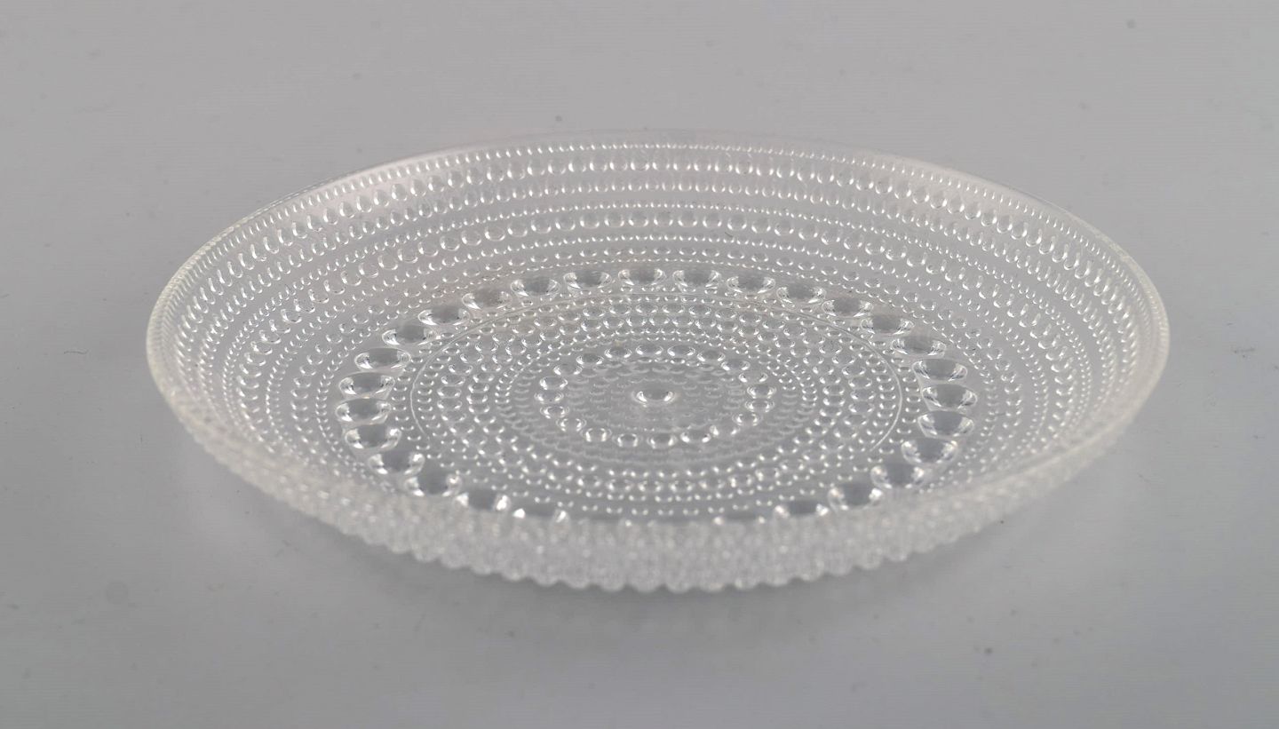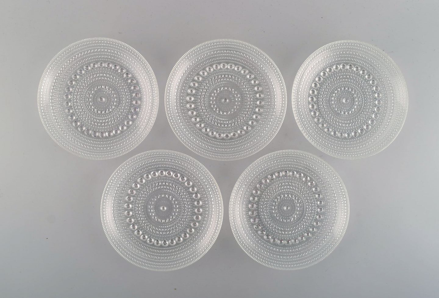 Oiva Toikka for Arabia. Fem Kastehelmi tallerkener i klart kunstglas. Finsk design, 1970'erne. Diameter: 14 cm. I flot stand.