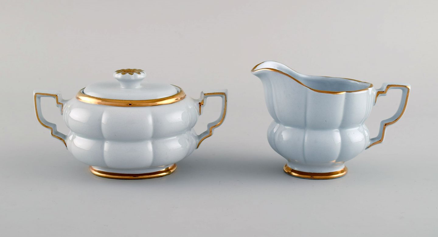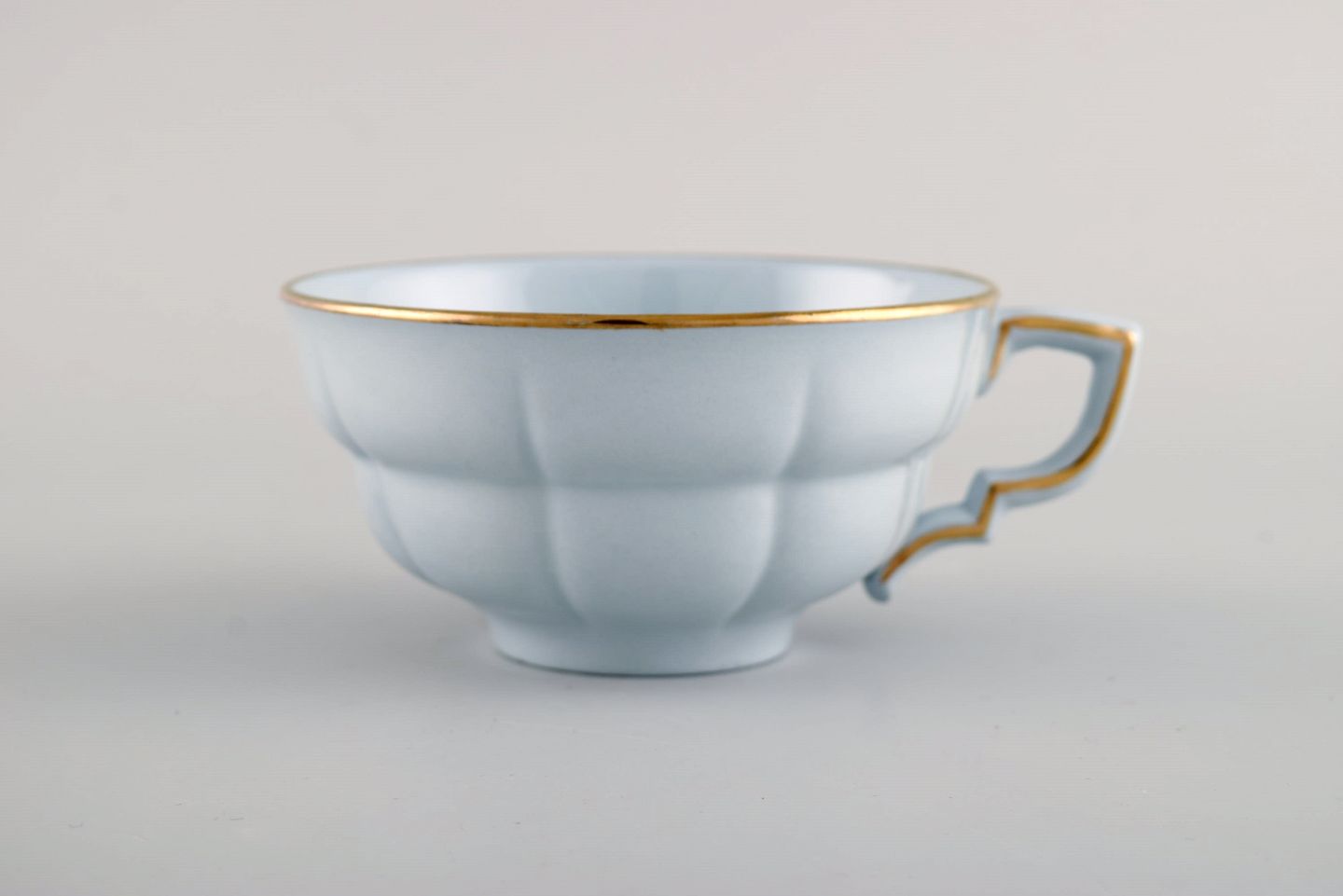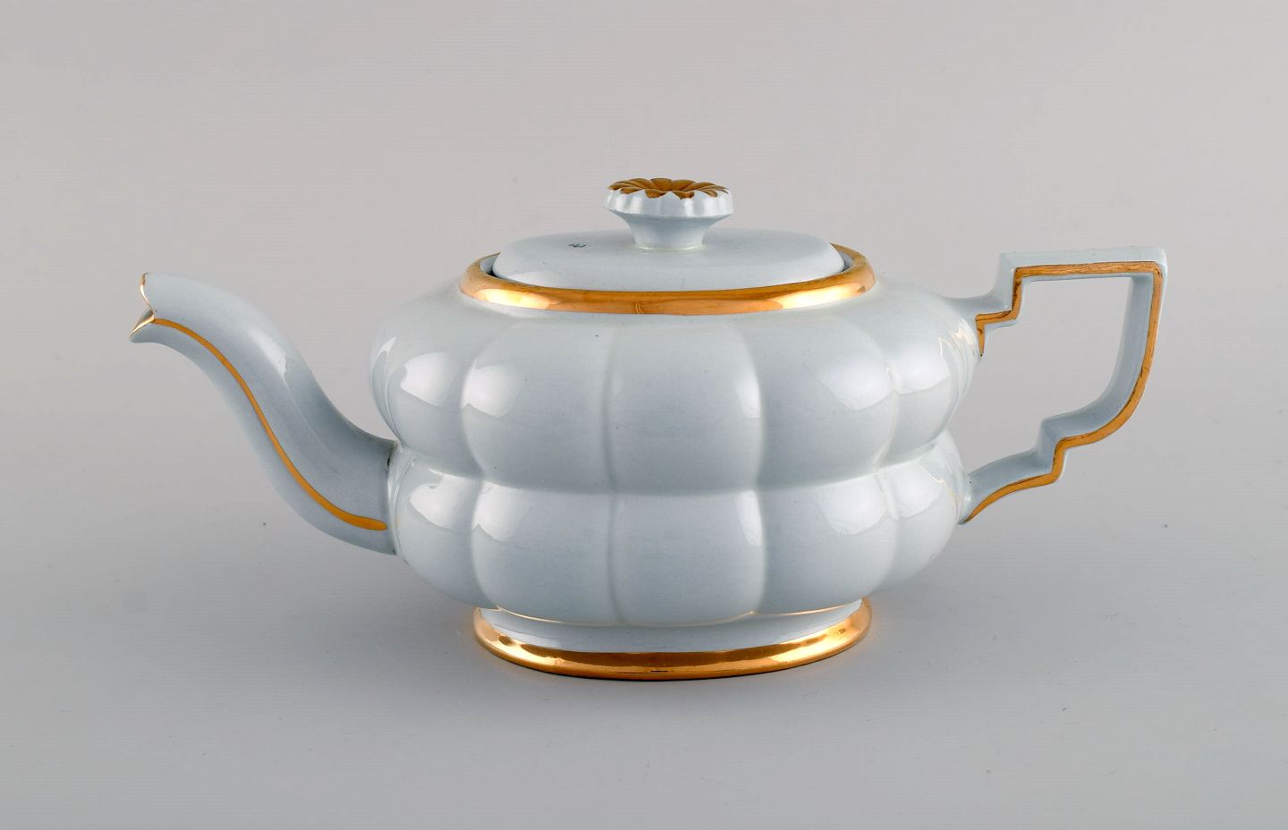 Arthur Percy for Upsala-Ekeby / Gefle. Komplet art deco Grand teservice i pastelblå porcelæn med håndmalet guldkant til otte personer. 1930/40'erne.