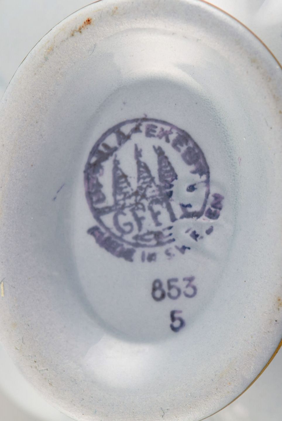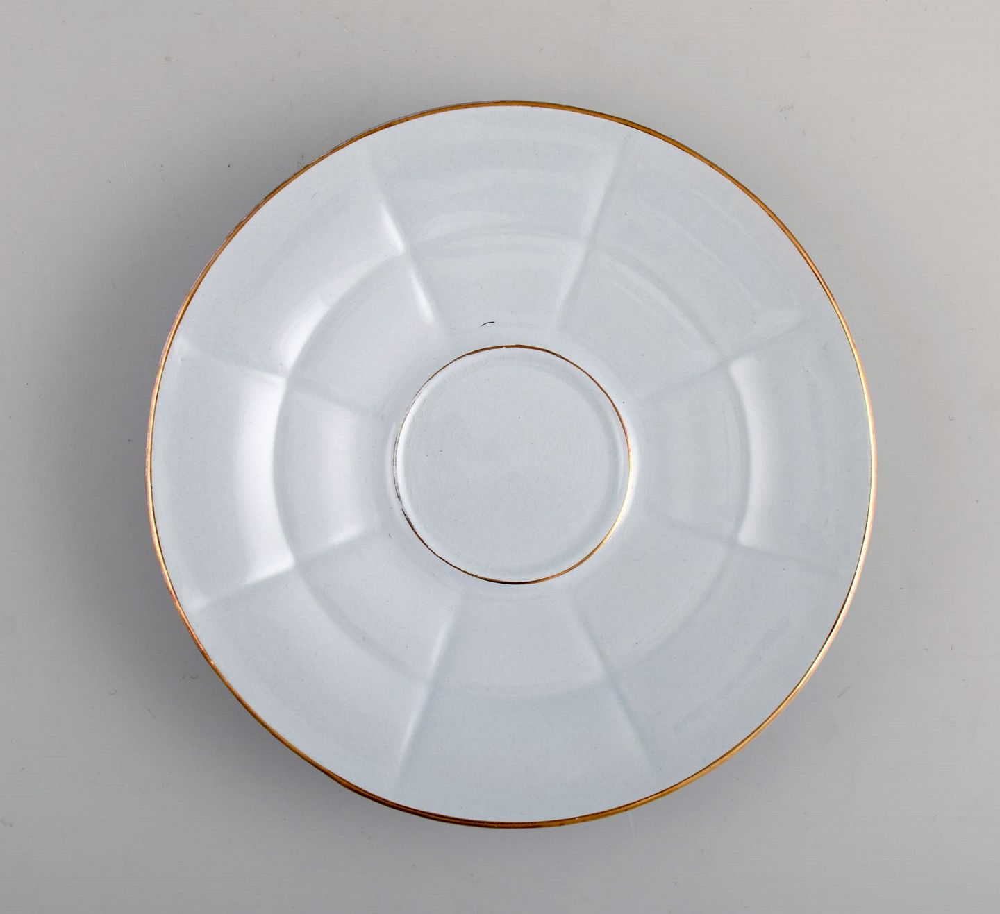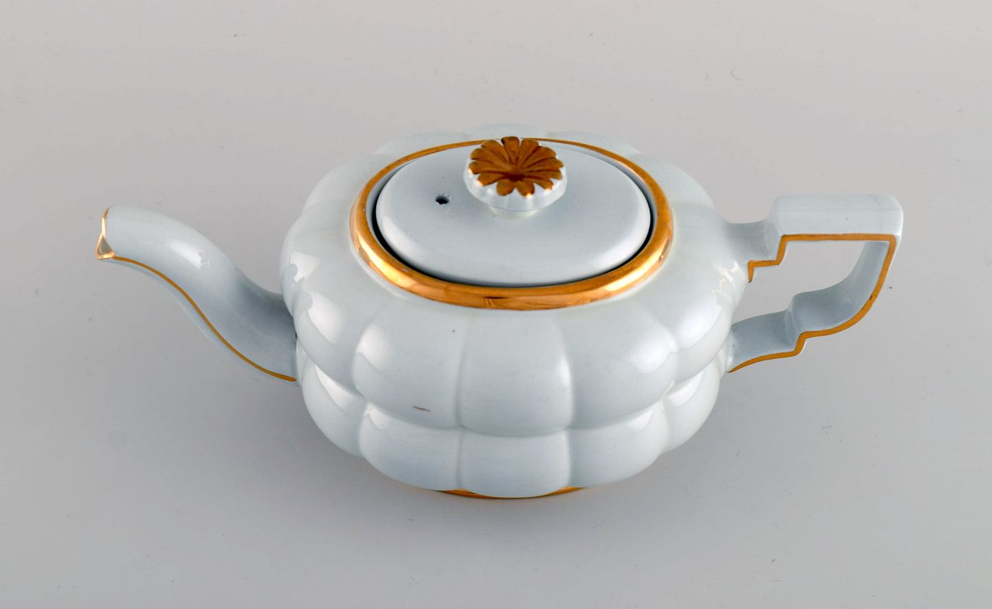 Arthur Percy for Upsala-Ekeby / Gefle. Komplet art deco Grand teservice i pastelblå porcelæn med håndmalet guldkant til otte personer. 1930/40'erne.