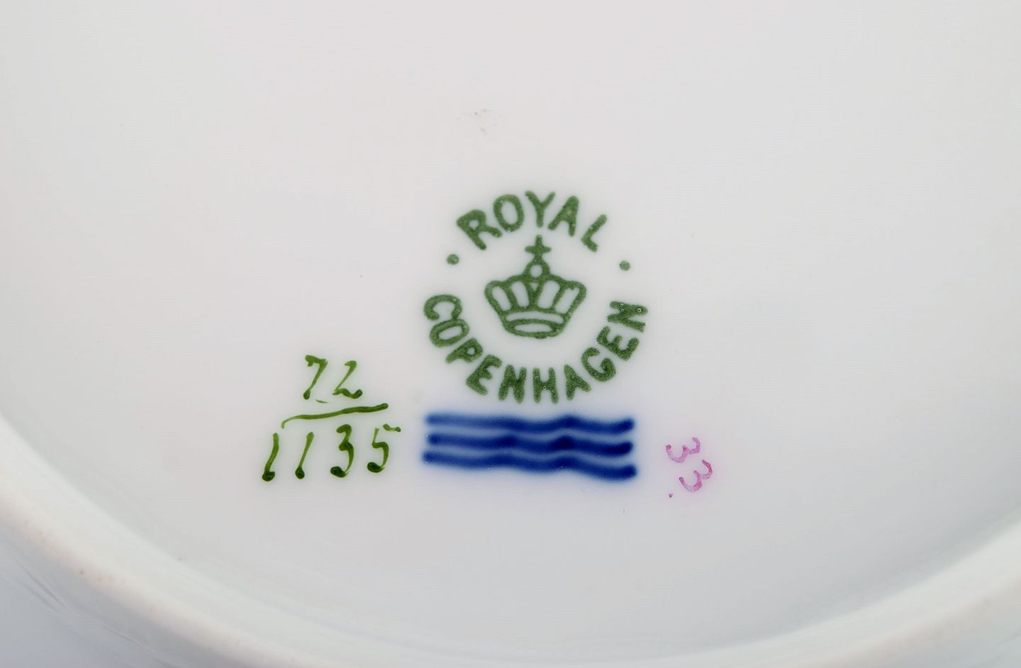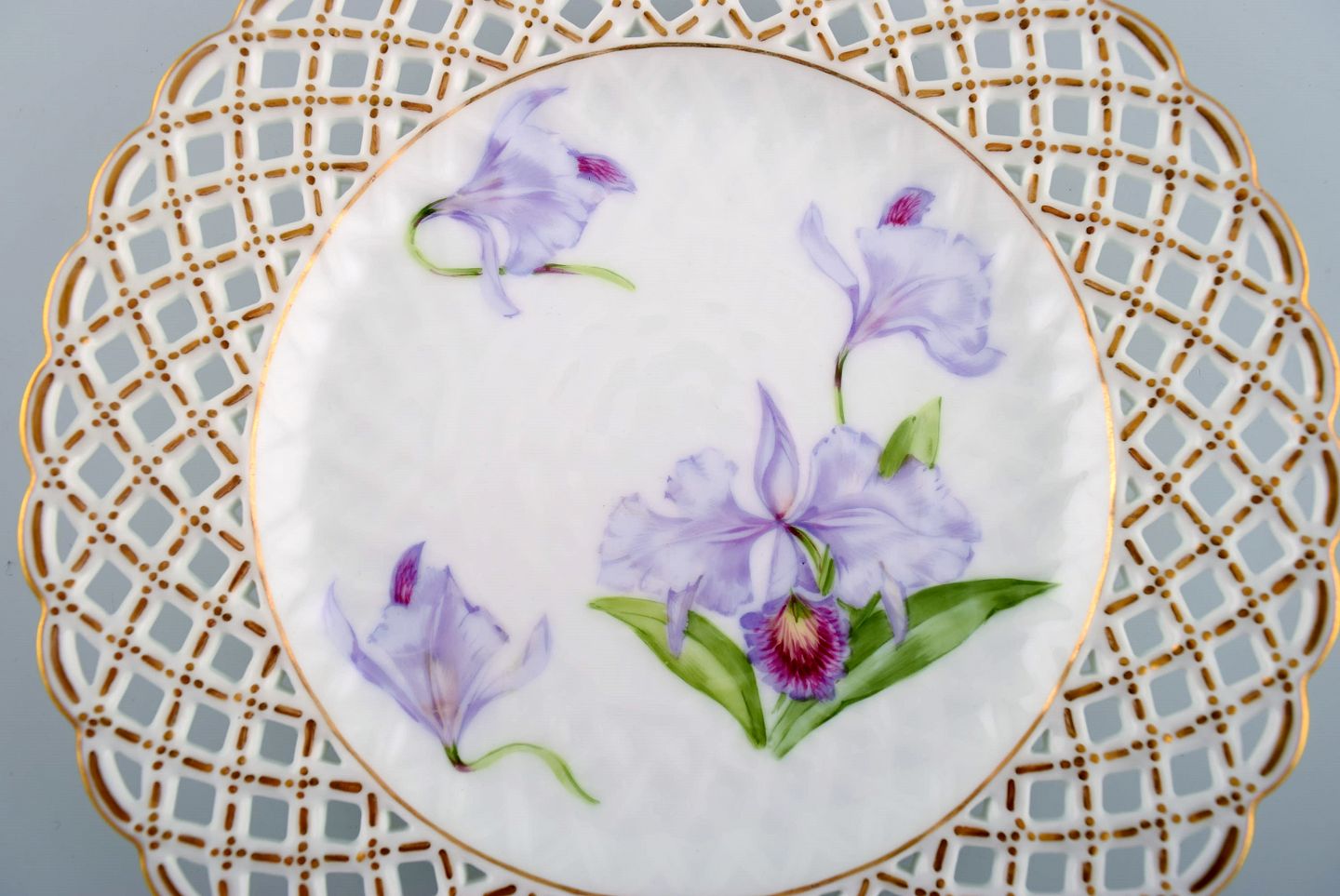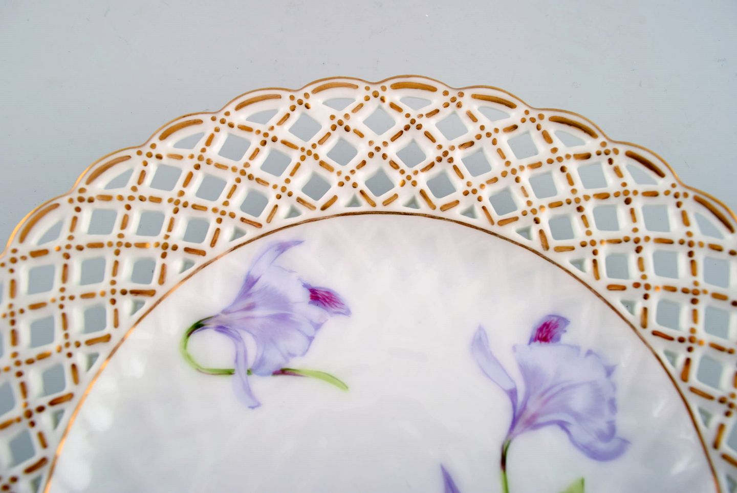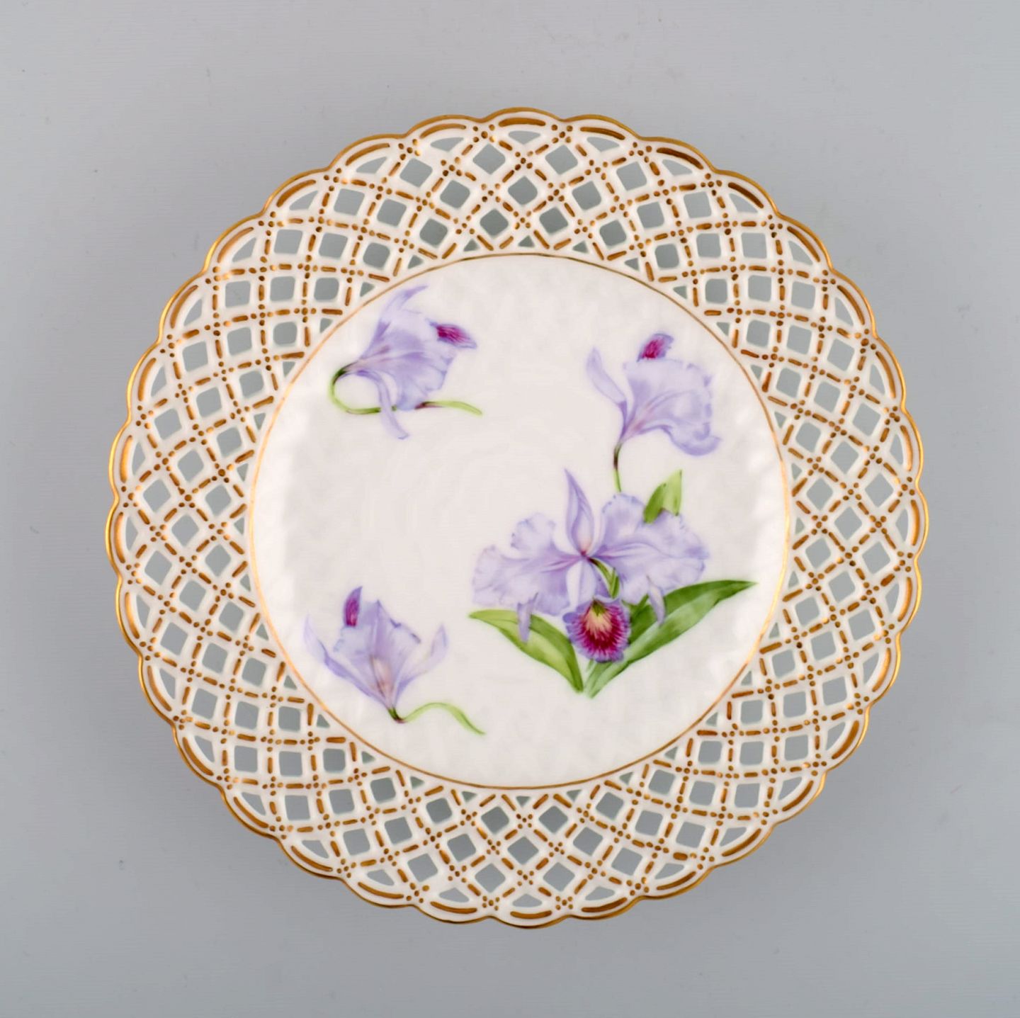 Otte antikke Royal Copenhagen tallerkener i gennembrudt porcelæn med håndmalede lilla lotusblomster. Modelnummer 72/1135. Museumskvalitet. Ca. 1910. Diameter: 21 cm. I flot stand. Stemplet.