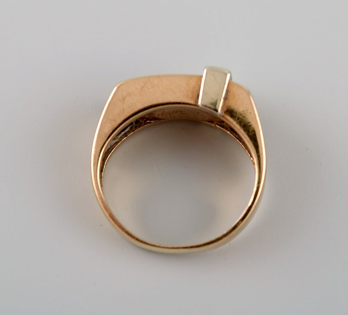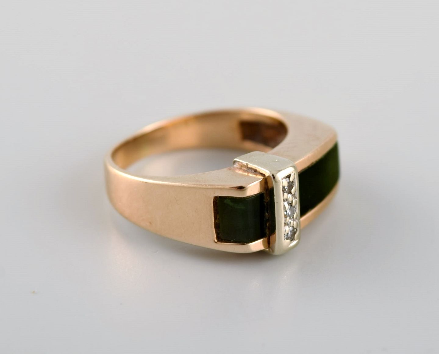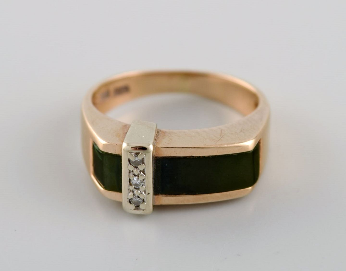 Dansk guldsmed. Vintage ring i 14 karat guld prydet med grøn turmalin og tre små diamanter. Midt 1900-tallet.