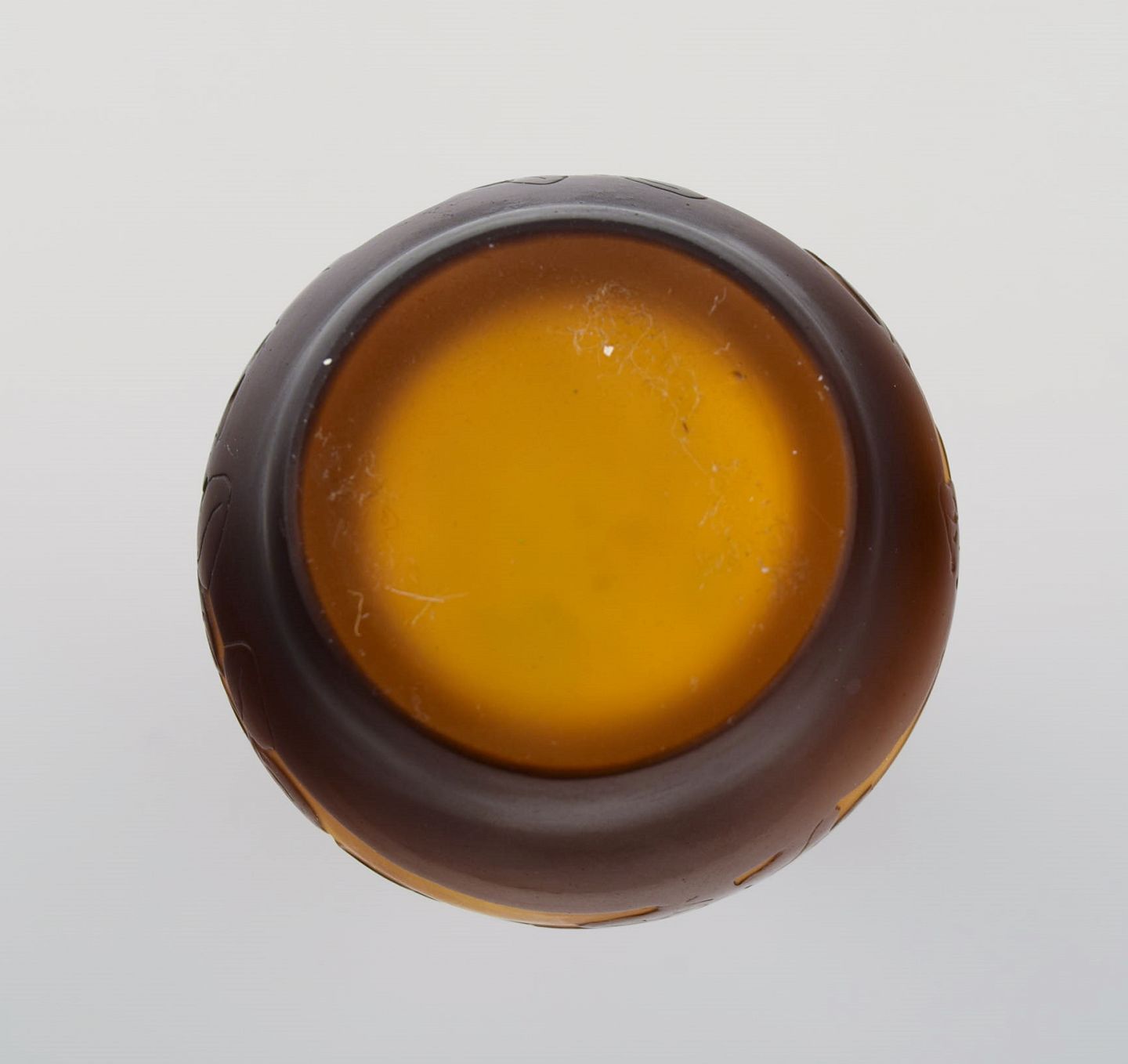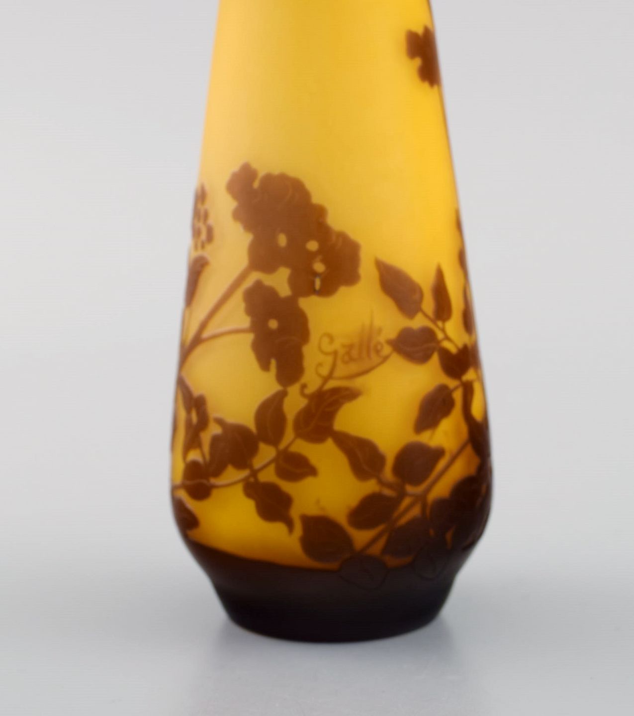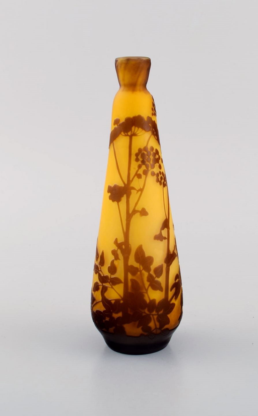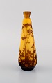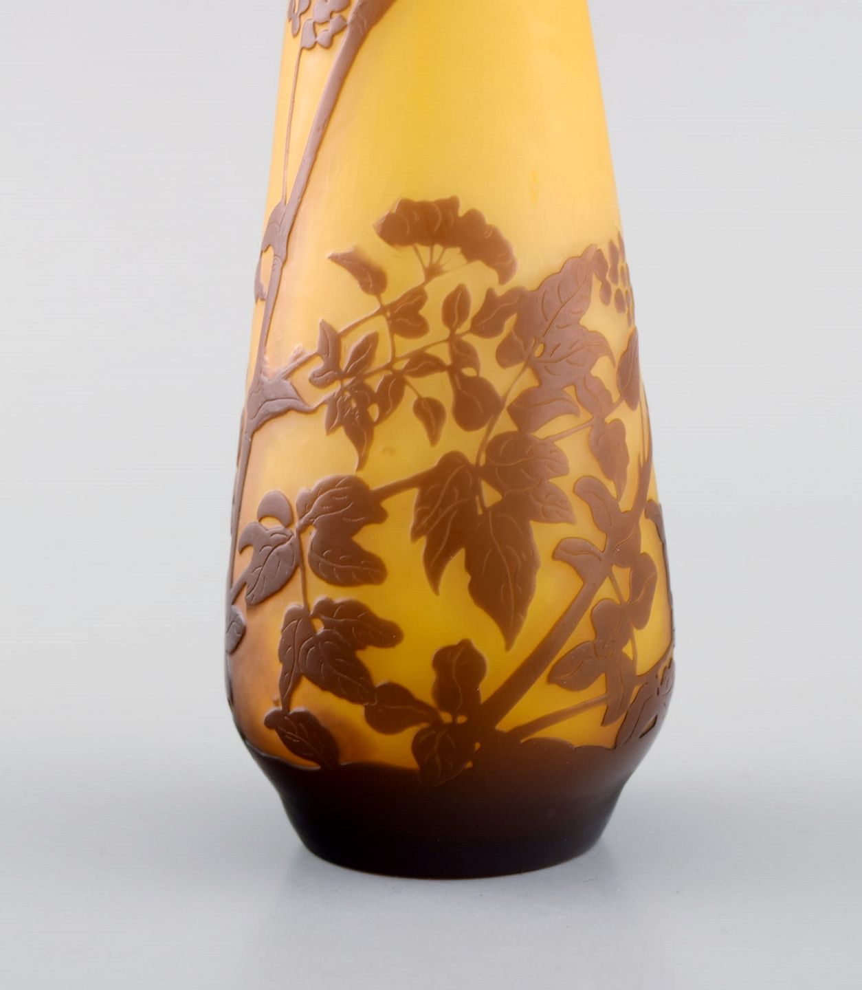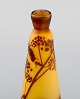 Antique Emile Gallé vase in yellow and brown art glass carved in the form of branches with foliage. Rare model. Early 20th century.