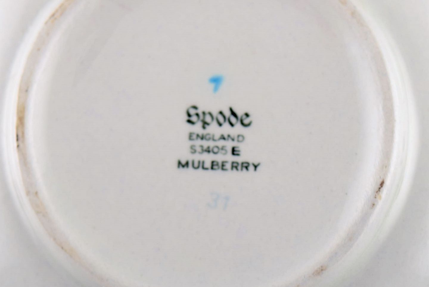 Spode, England. Fem Mulberry boullionkopper med underkopper i håndmalet porcelæn med blomster- og fuglemotiver. 1960/70'erne.