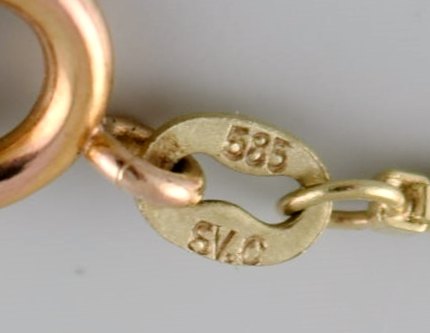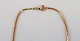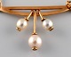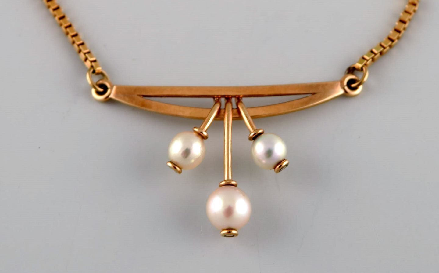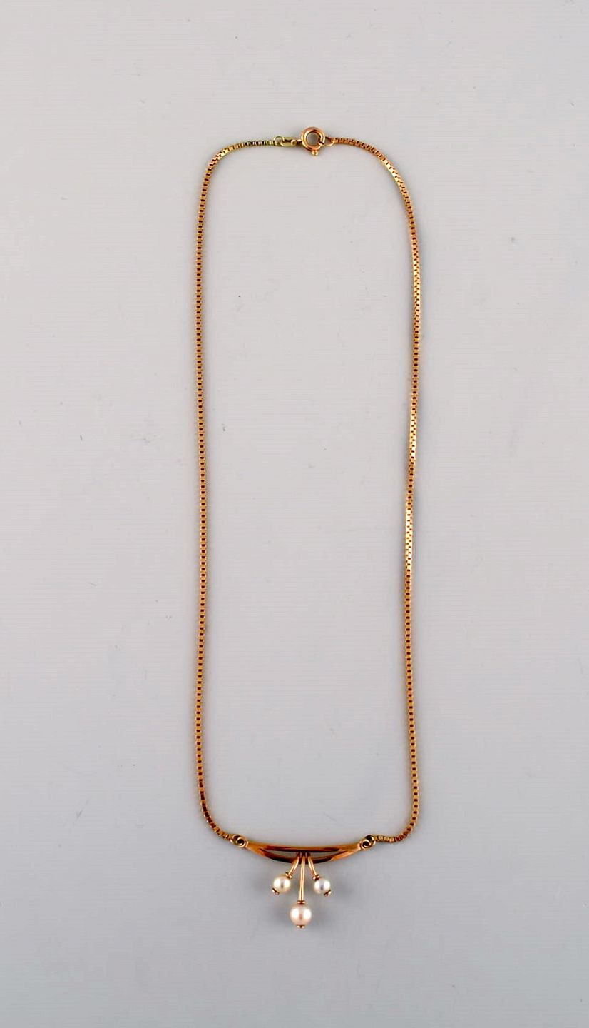 Skandinavisk guldsmed. Modernistisk halskæde i 14 karat guld. Vedhæng med kulturperler. Midt 1900-tallet. Vedhænget måler: 3 x 2 cm. Total længde: 41 cm. I flot stand. Stemplet.