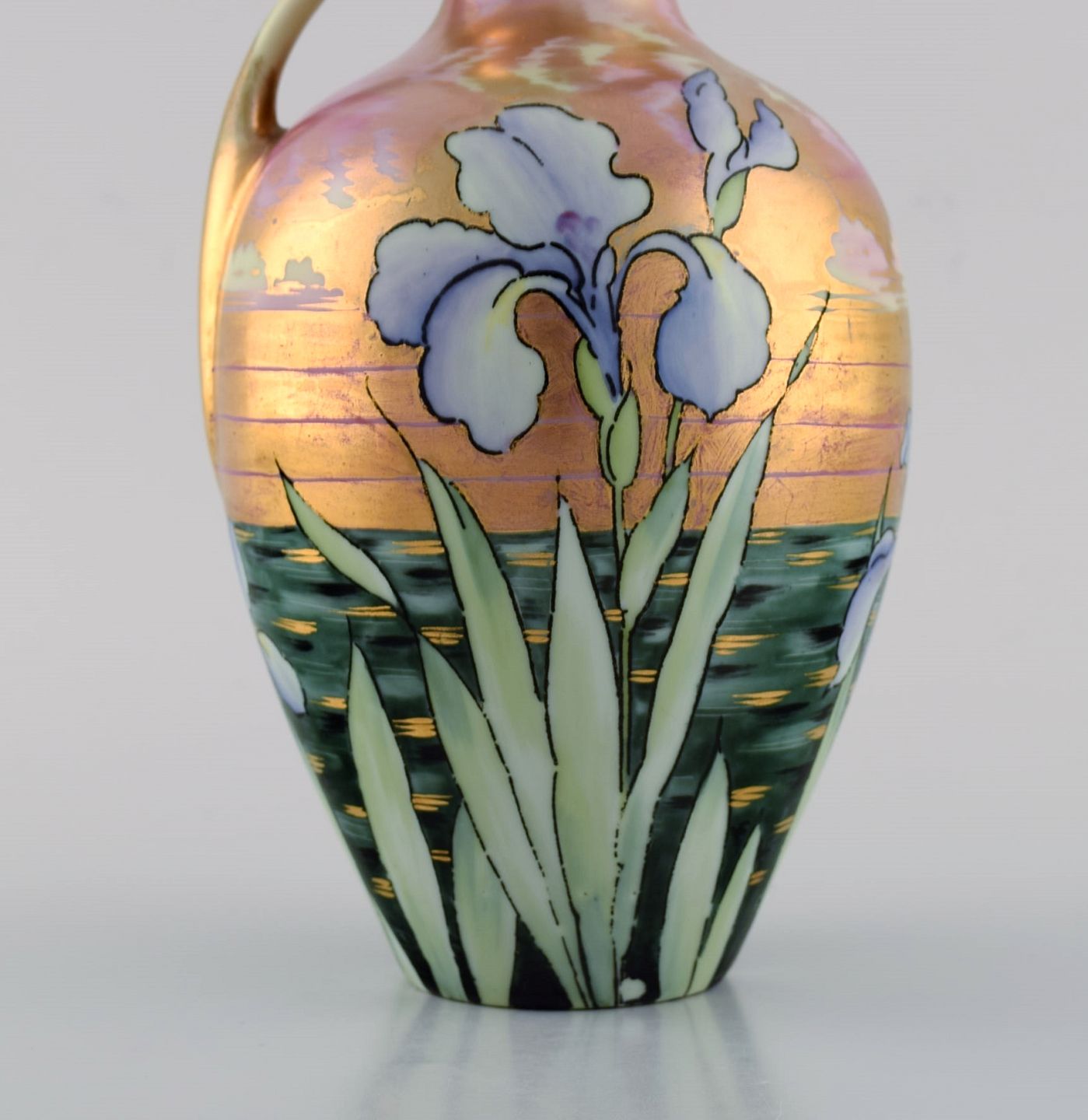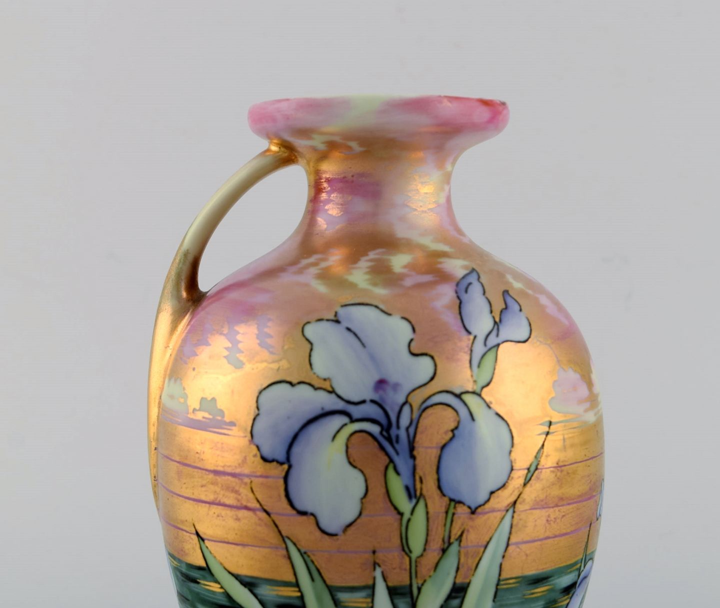 Heubach, Tyskland. Antik art nouveau vase i porcelæn med håndmalede blomster og gulddekoration. Ca 1900. Måler: 17,5 x 11,5 cm. I flot stand. Stemplet.