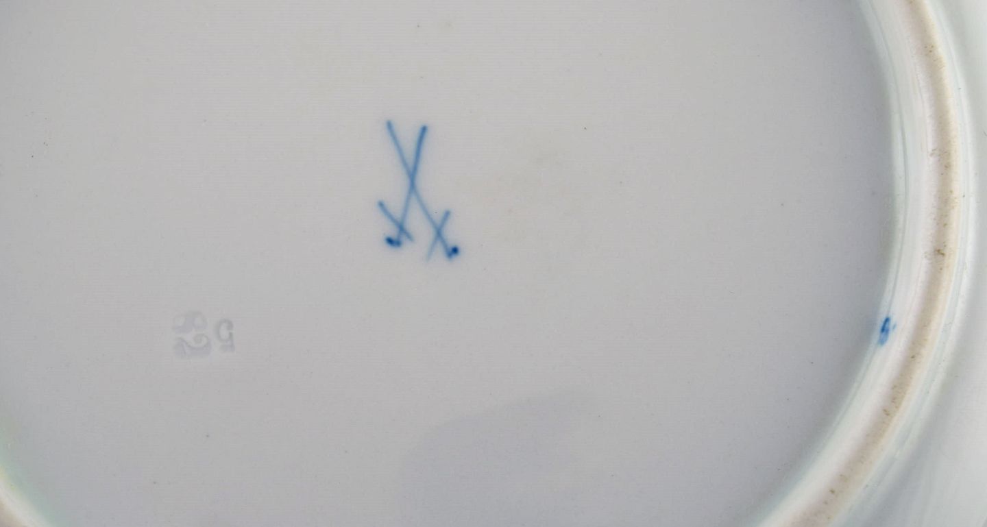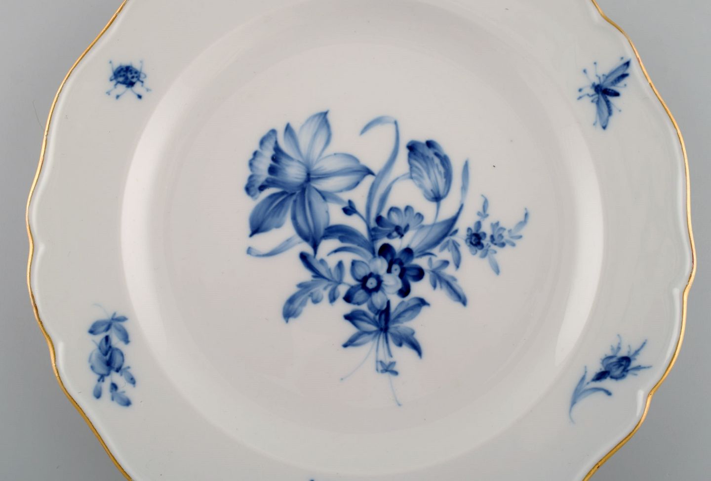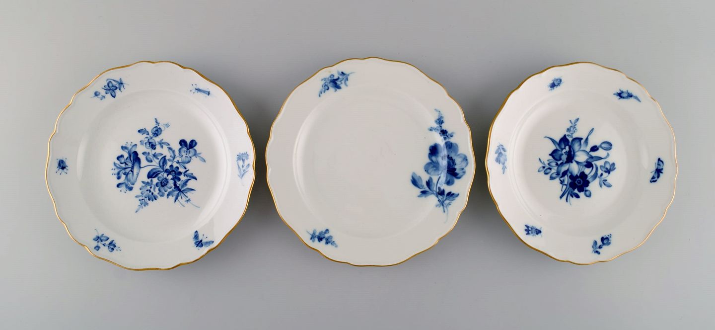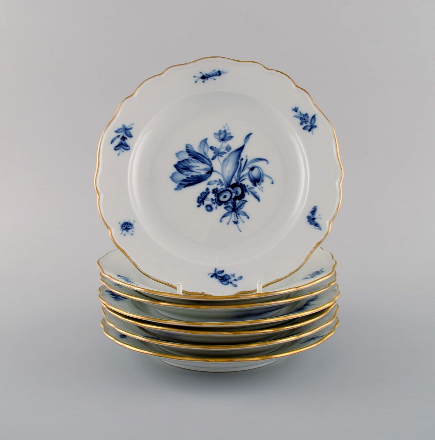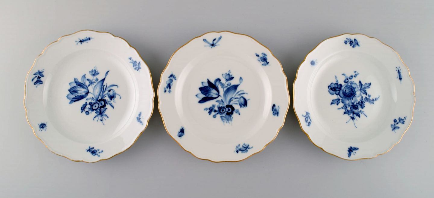 Syv antikke Meissen tallerkener i porcelæn med håndmalede blomster, insekter og guldkant. Tidligt 1900-tallet. Diameter: 17,5 cm. I flot stand. Stemplet. 1. Sortering.