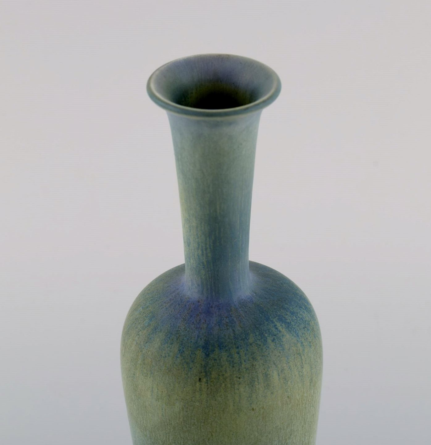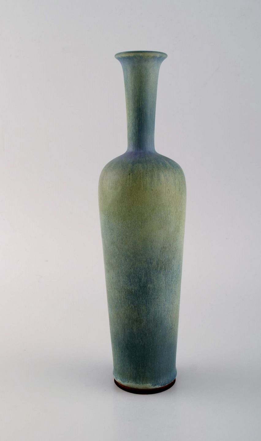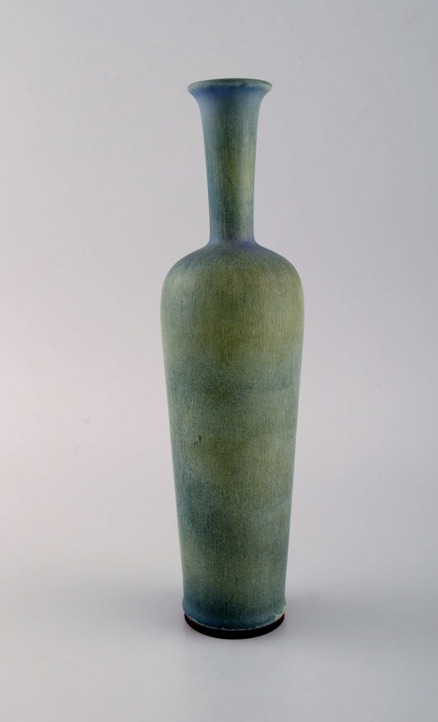 Berndt Friberg (1899-1981) for Gustavsberg Studiohand. Stor vase i glaseret stentøj. Smuk glasur i blågrønne nuancer. Dateret 1965. Måler: 25,7 x 7 cm. I flot stand. Signeret.