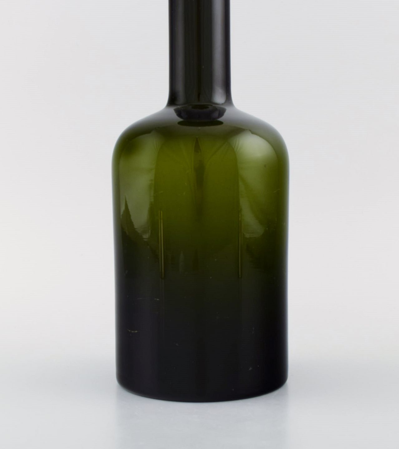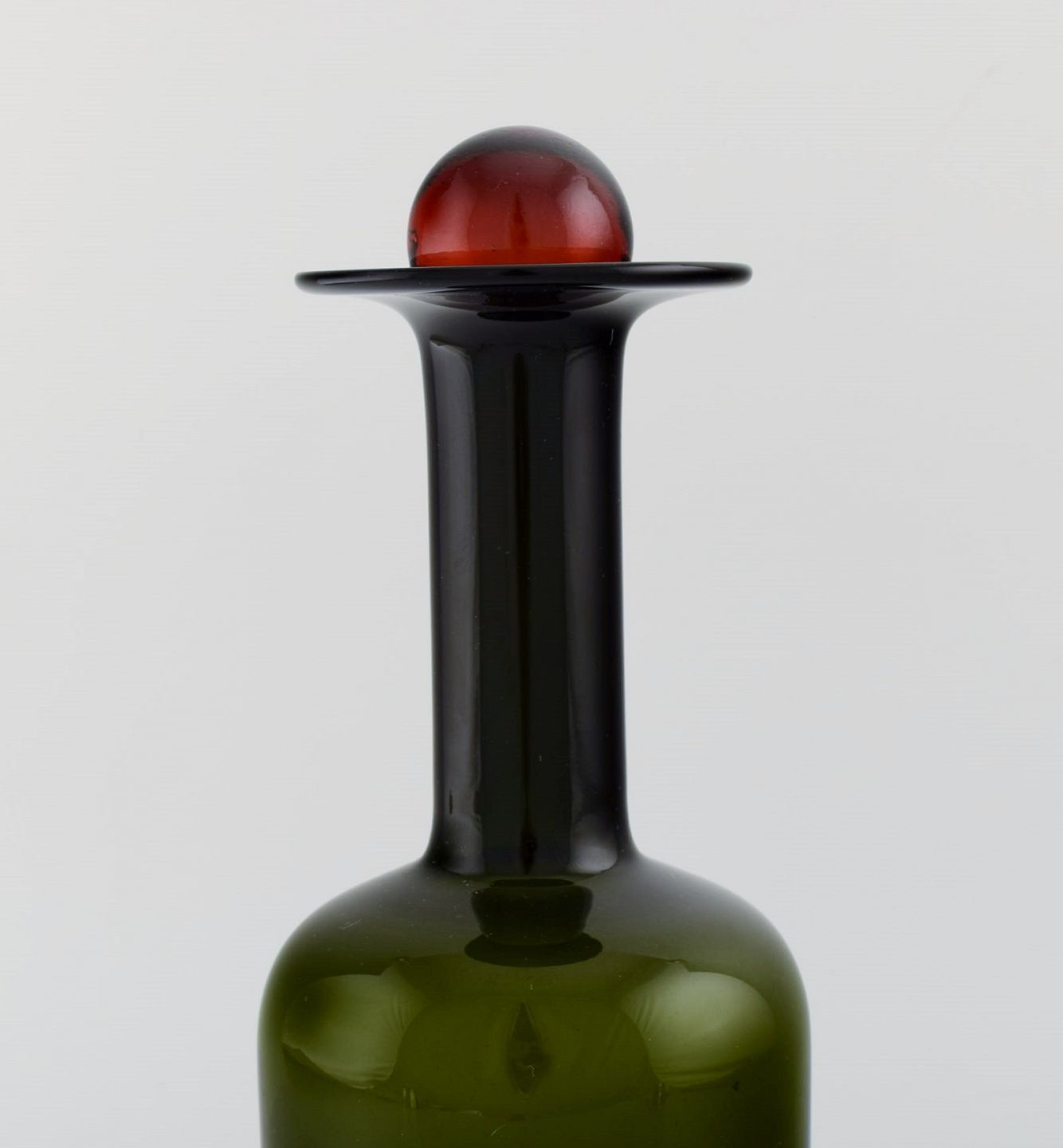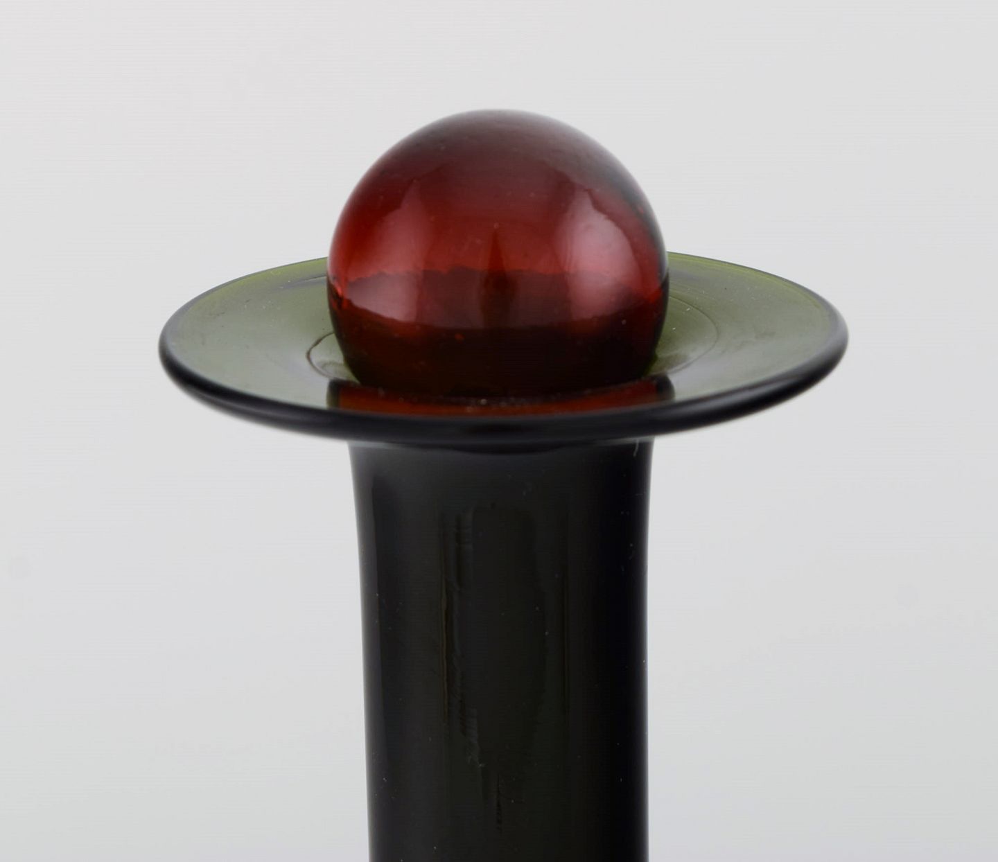 Otto Brauer for Holmegaard. Stor vase/flaske i grønt kunstglas med rød kugle. 1960'erne.