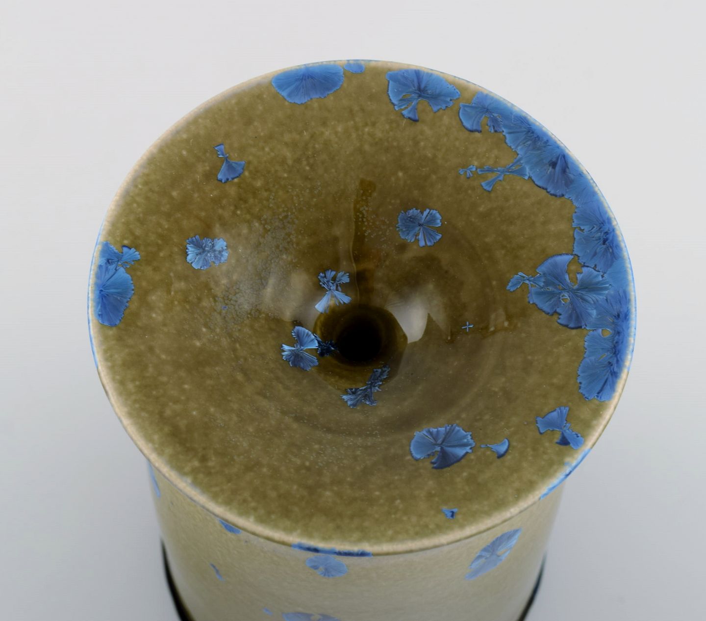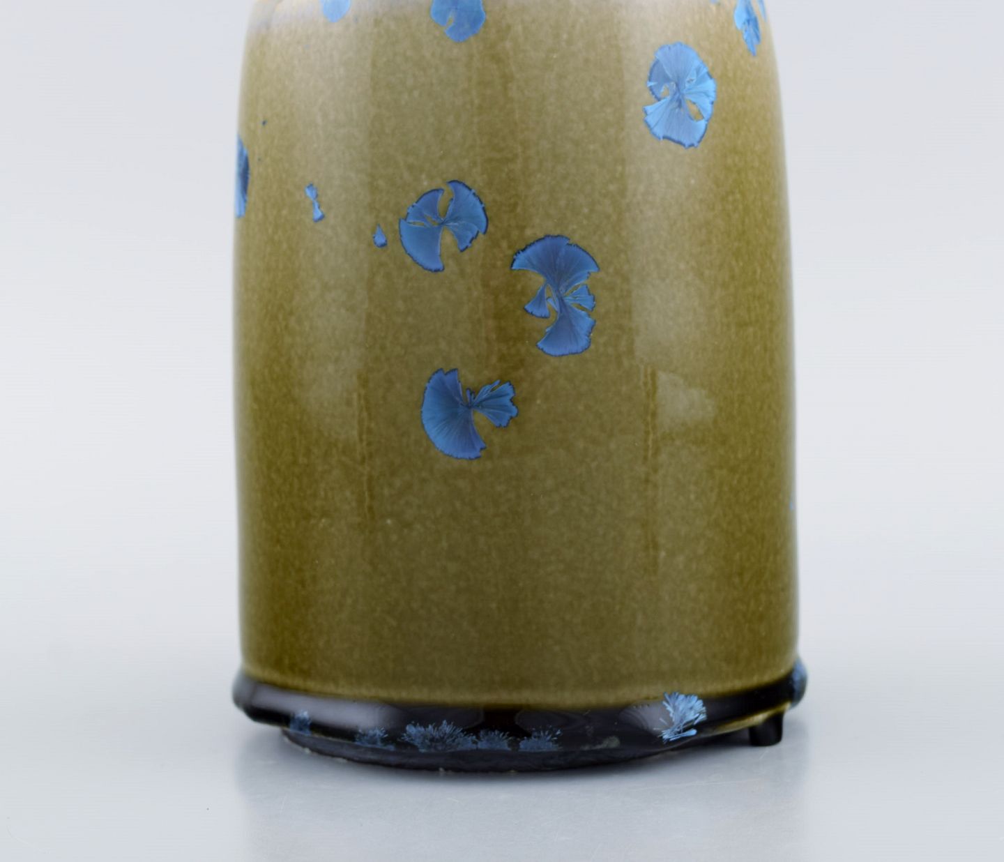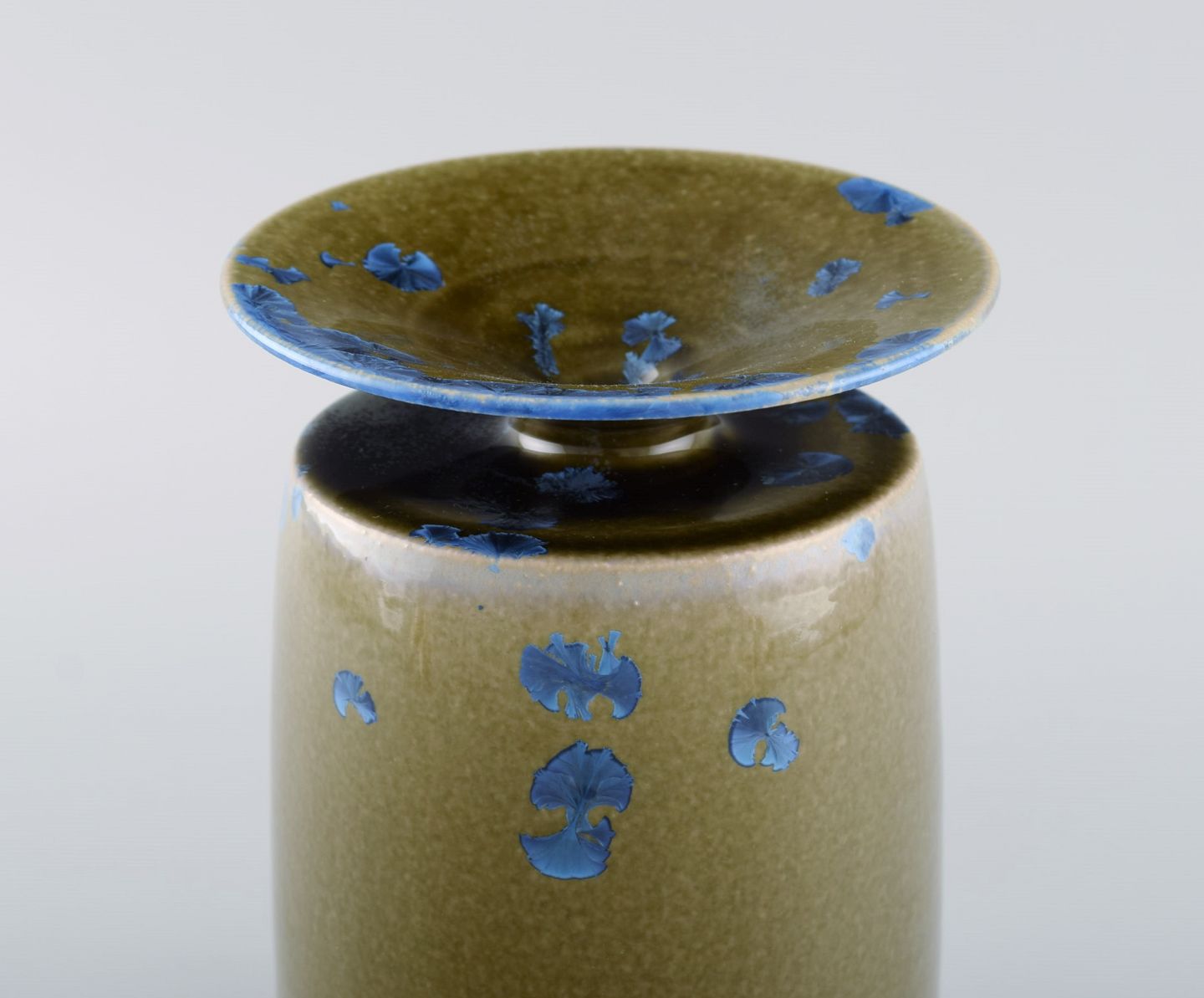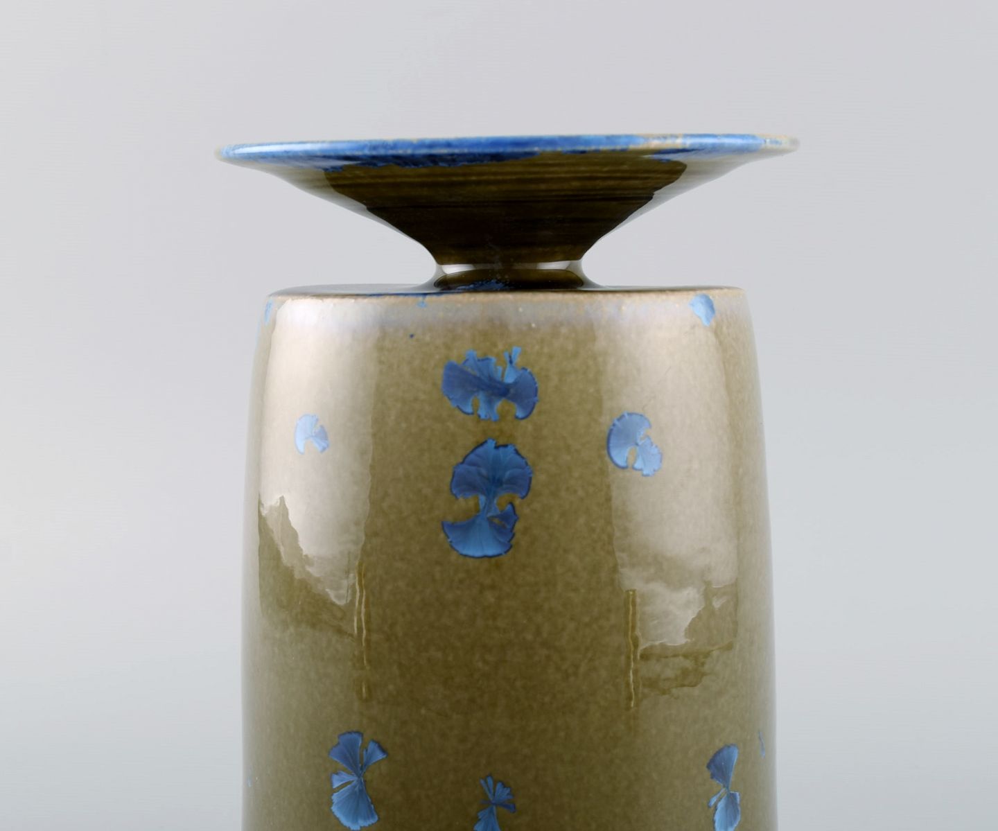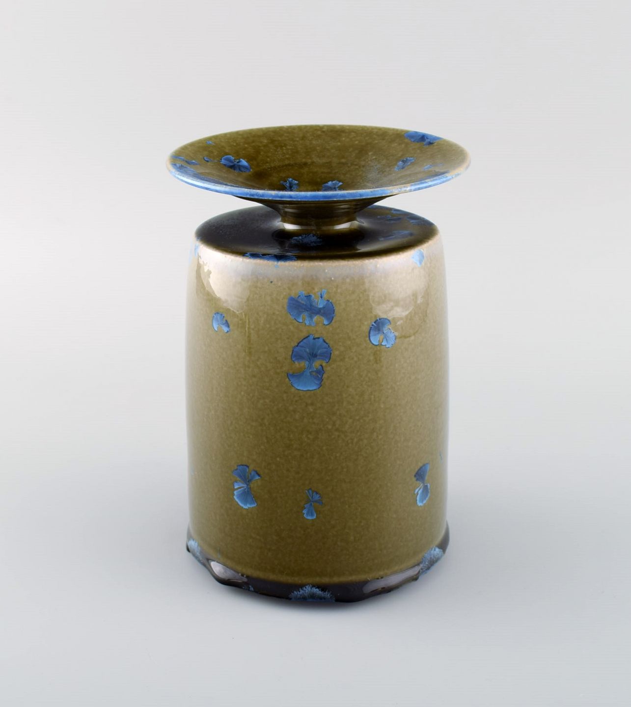 Isak Isaksson, svensk keramiker. Unika vase i glaseret keramik. Smuk krystalglasur i blå og jordnuancer. Sent 1900-tallet. Måler: 18 x 12,5 cm. I flot stand. Signeret.