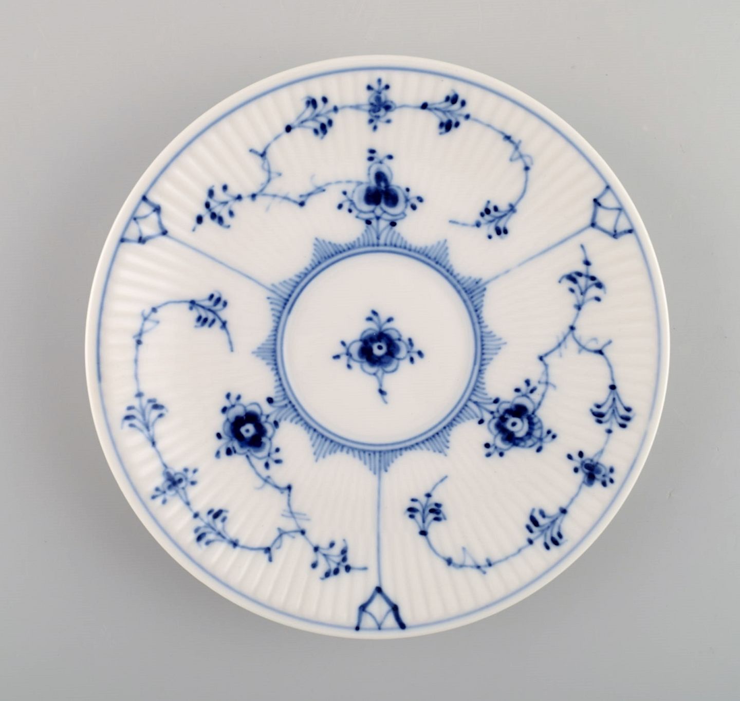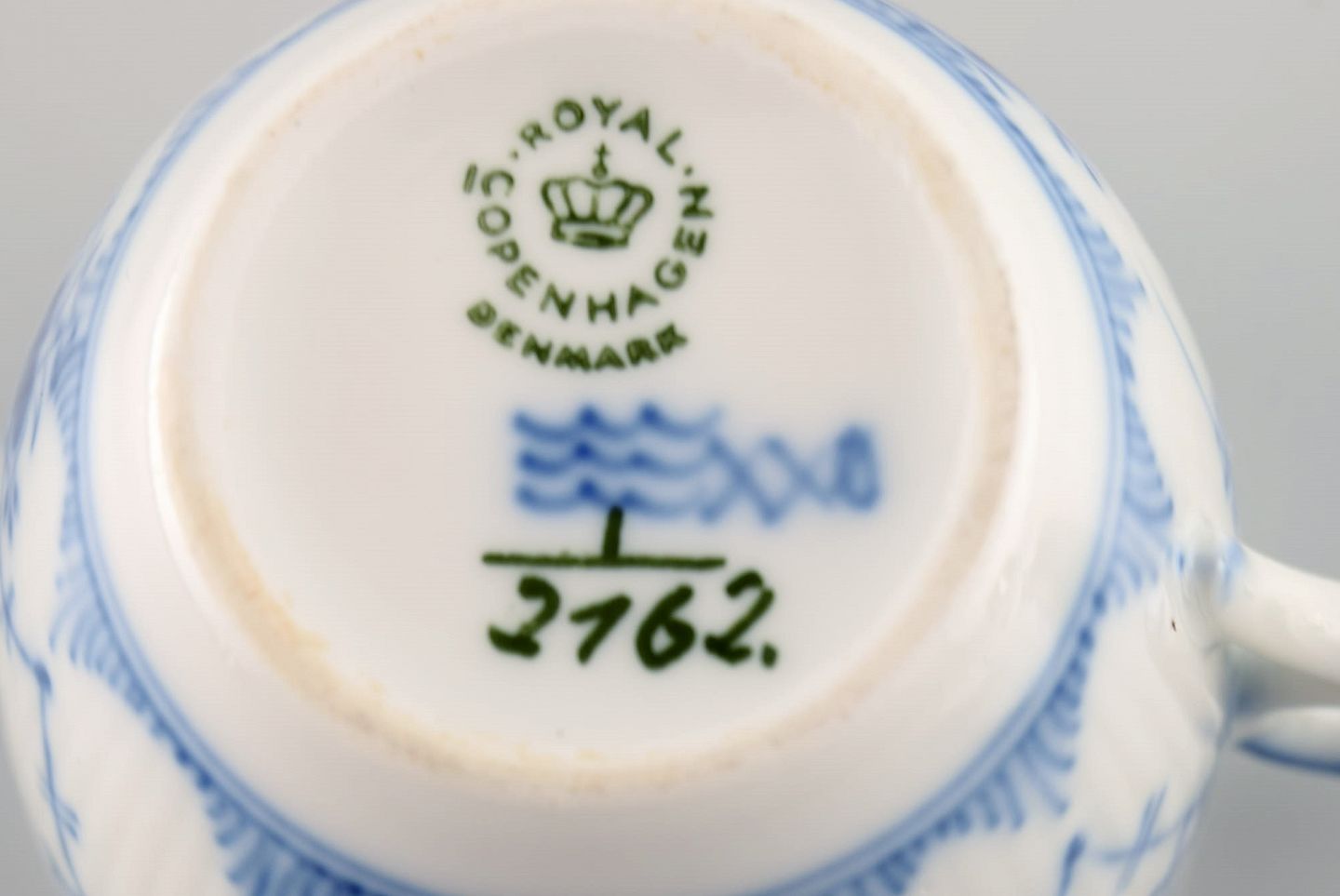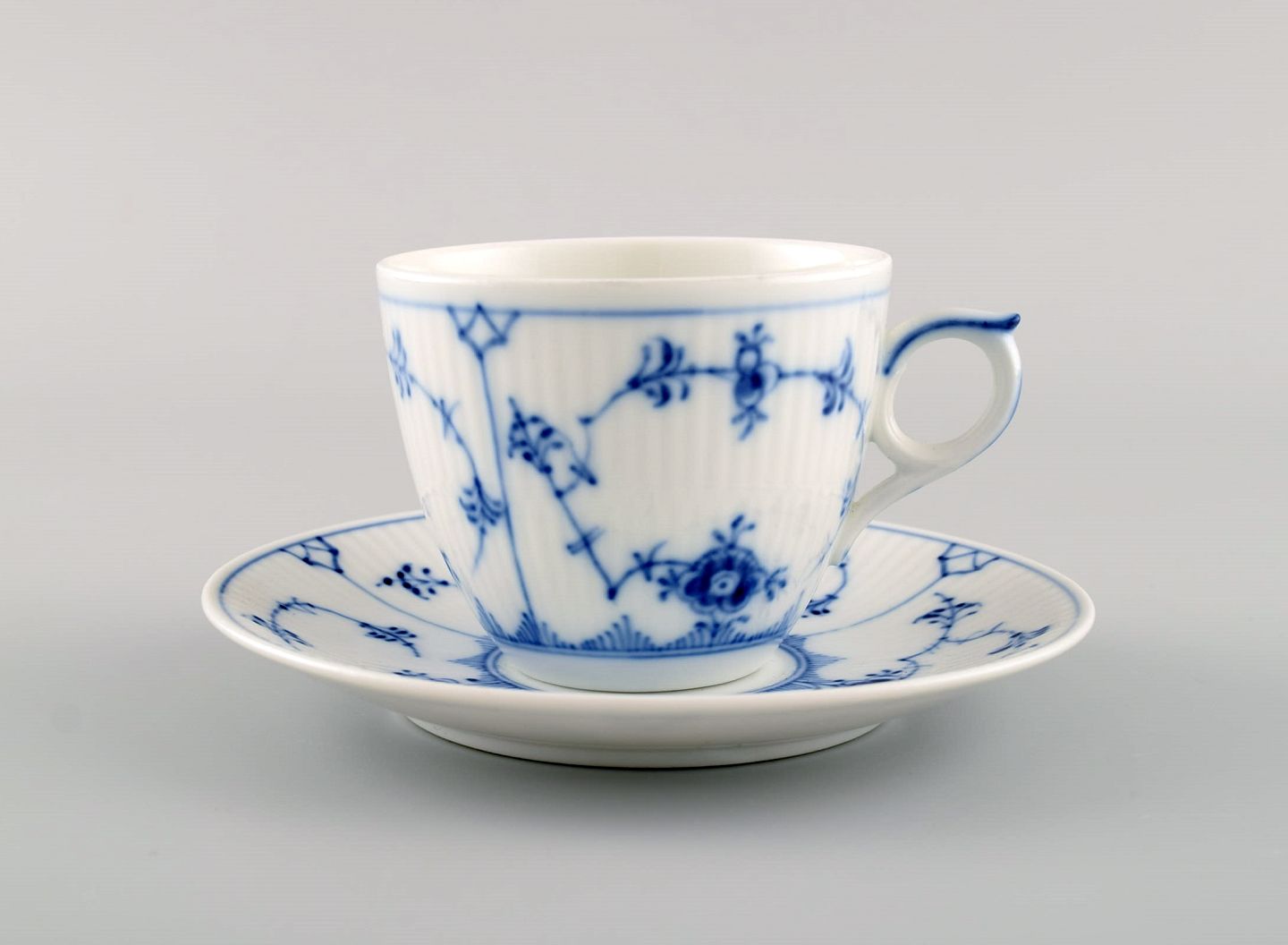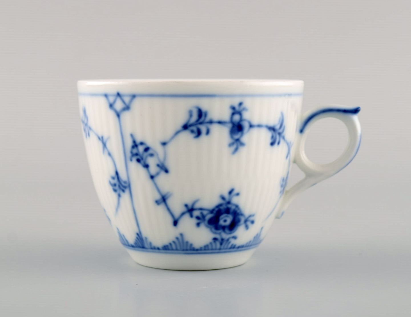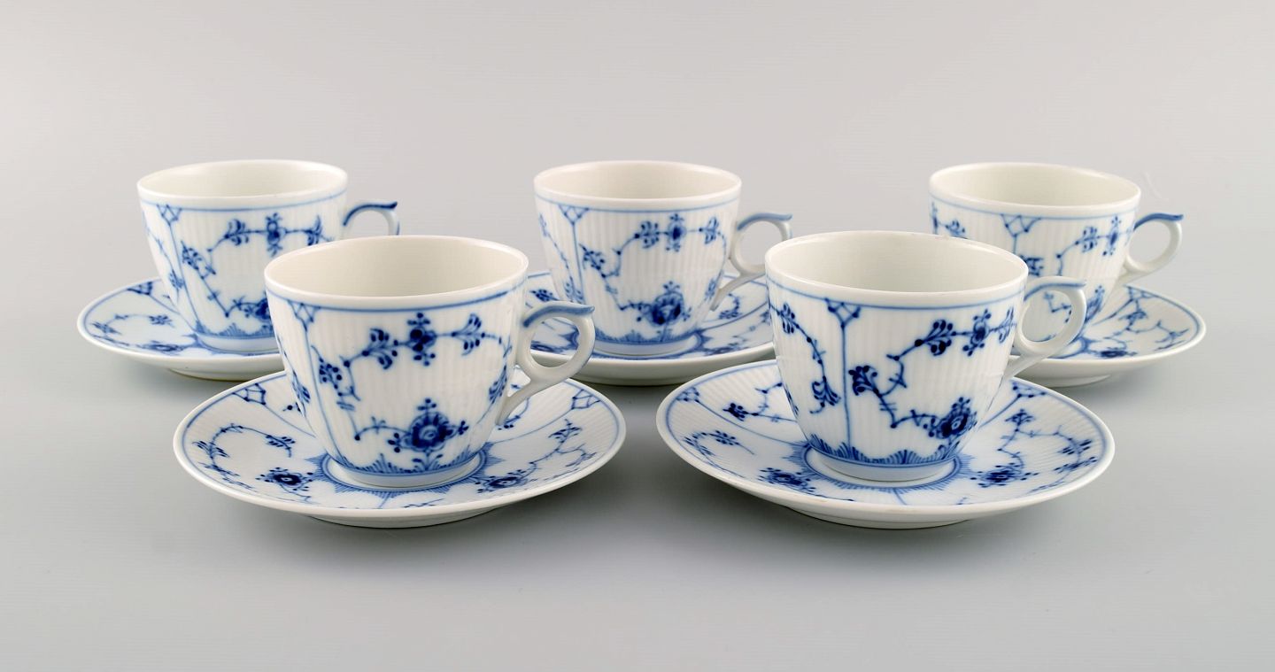 Five Royal Copenhagen Blue Fluted Plain coffee cups with saucers. Model number 1/2162. 1960's. The cup measures: 7.5 x 6.4 cm. Saucer diameter: 13 cm. Stamped. 1st factory quality.